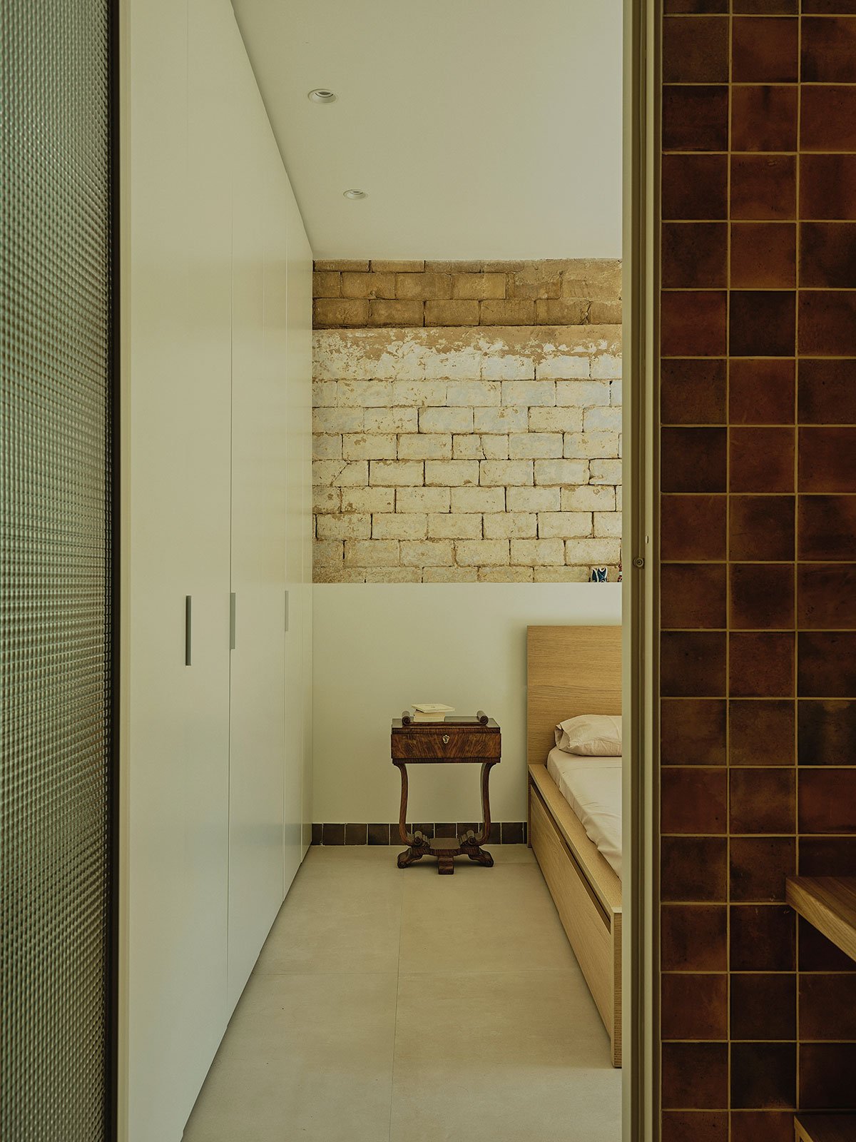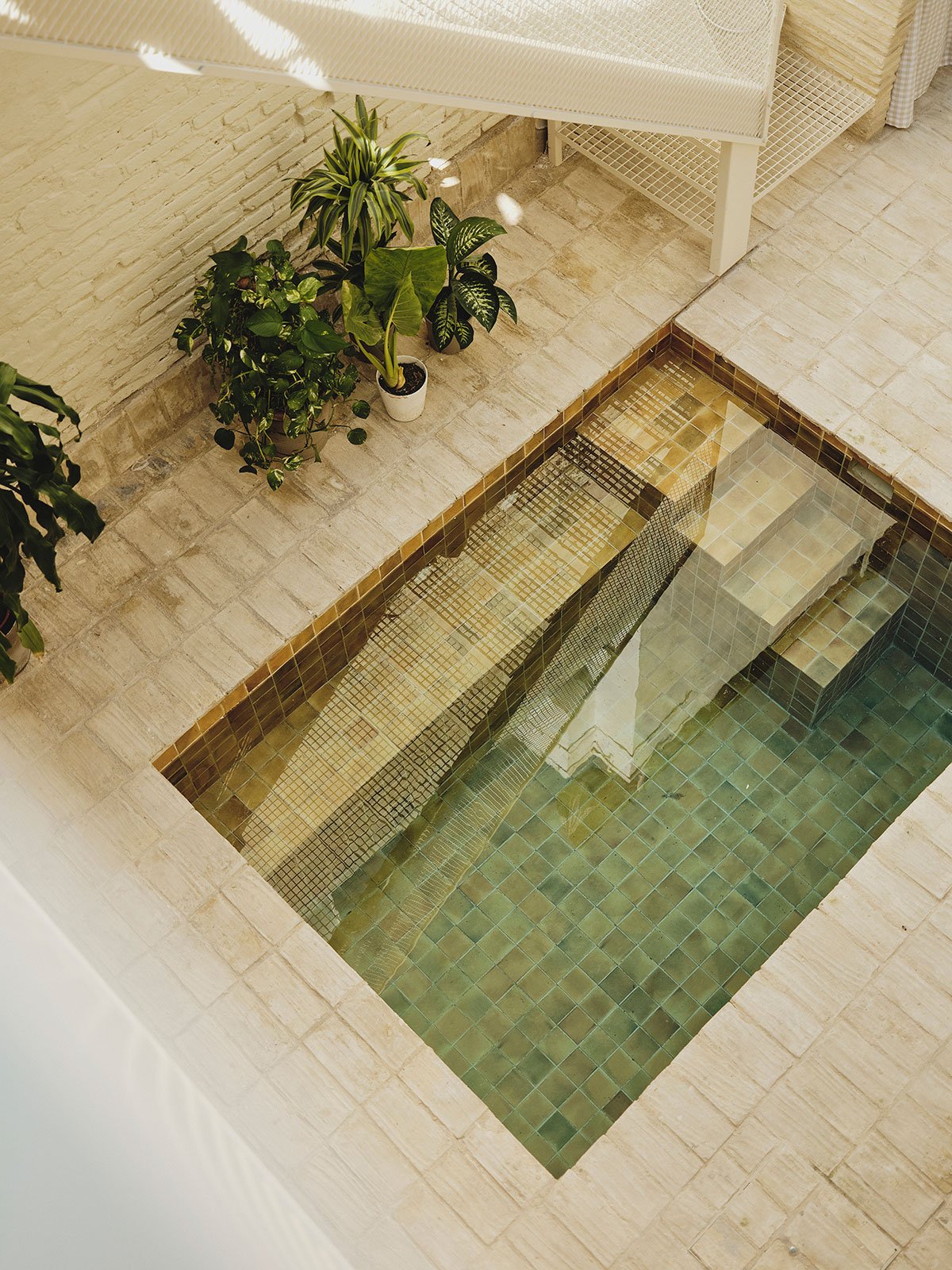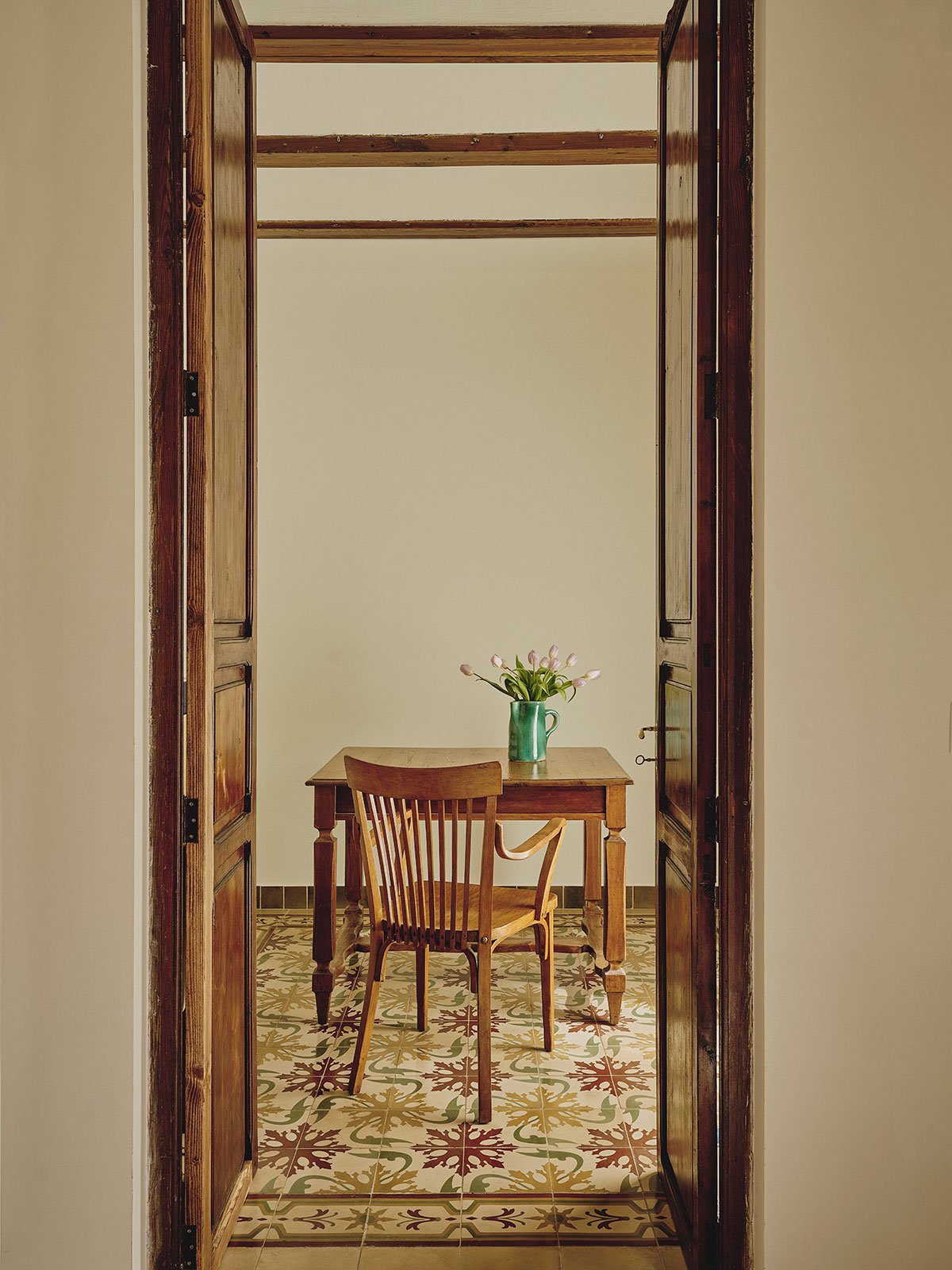 Special attention has been given to the materials, not just as technical components but as carriers of memory. Wooden beams, bricks, tiles, and terracotta are reused, establishing a dialogue between the old and the new. For example, the patio and hallway flooring is made of terracotta tiles recovered from the original roof. In contrast, new glazed ceramic tiles in the kitchen, bathrooms, and pool add color and texture, with hues that echo elements of the agricultural landscape: yellows blending with water and sky to evoke irrigation ponds, and greens referencing the original baseboards.