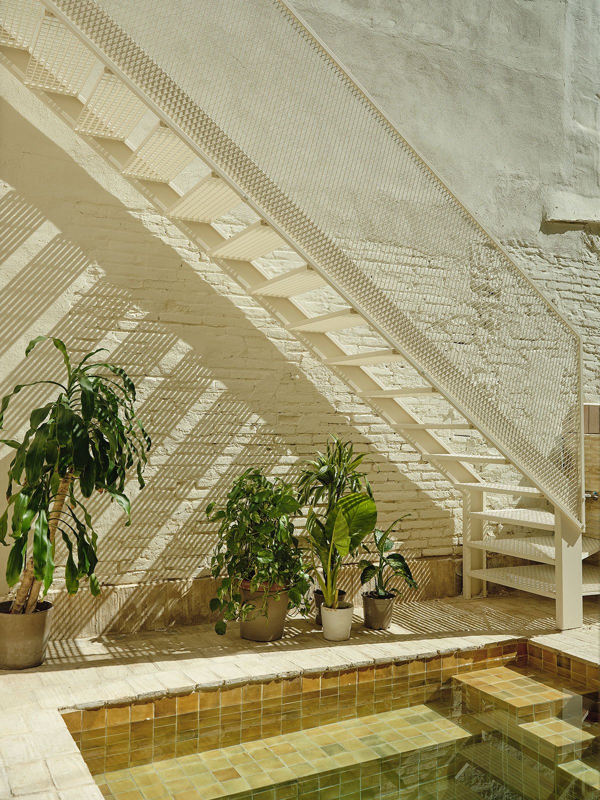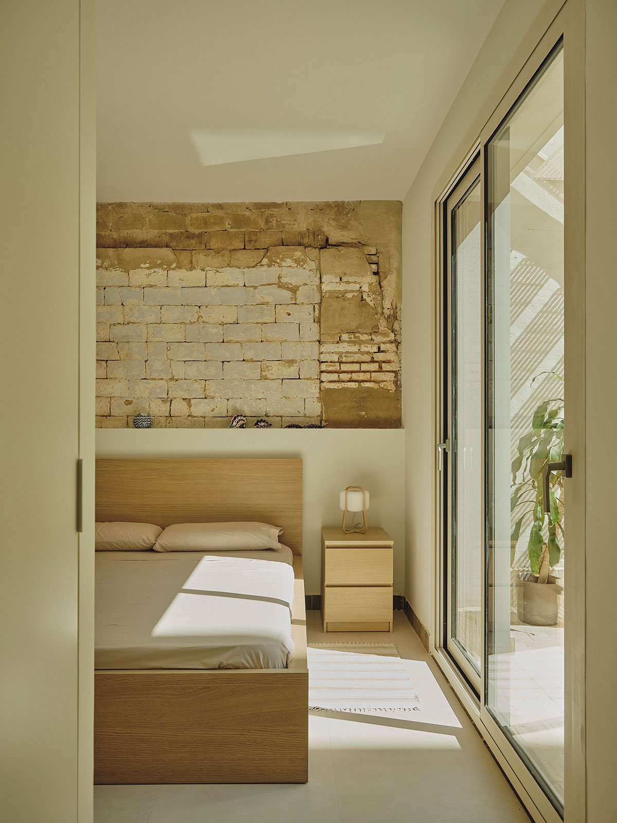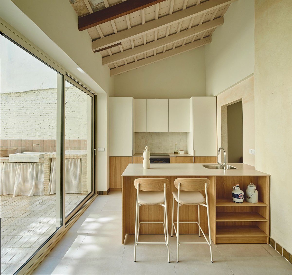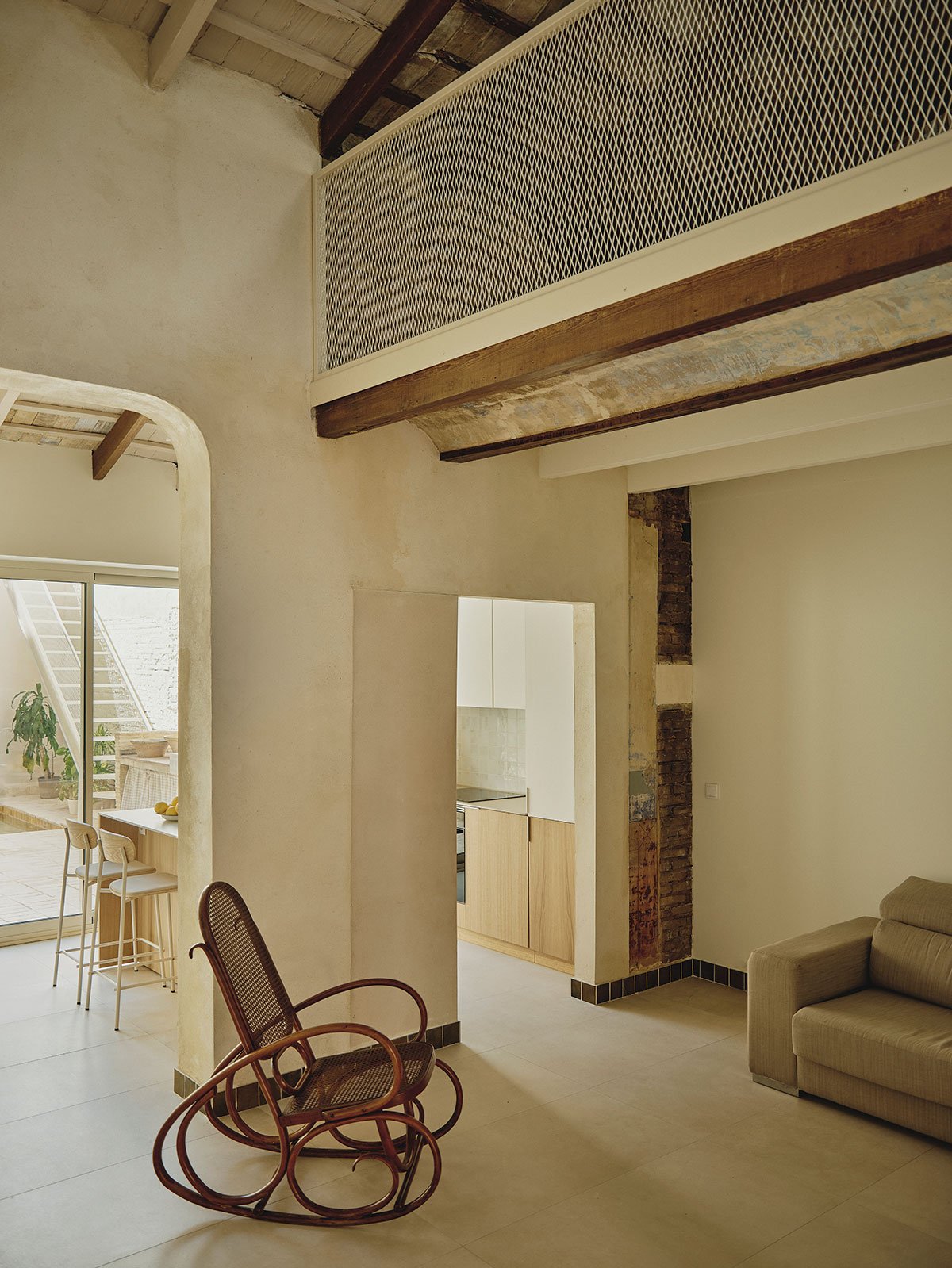 The reorganization of volumes improves the relationship between interior and exterior and brings natural light and ventilation into previously darkened spaces. While the original functional layout is preserved, it has been updated: the traditional cart entrance remains in place, now transformed with a light, custom-designed metal staircase that incorporates a reused stone from the patio; the main living room continues to be the heart of the house, retaining its intimate atmosphere thanks to the preserved brick vaults; and the kitchen, still in its original position, has been extended across the width of the plot and opened to the courtyard as a social space.