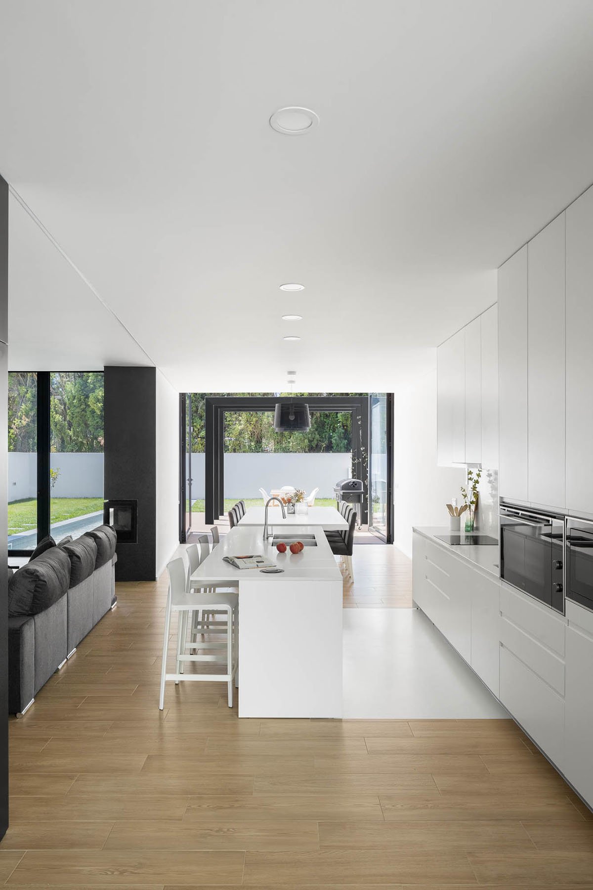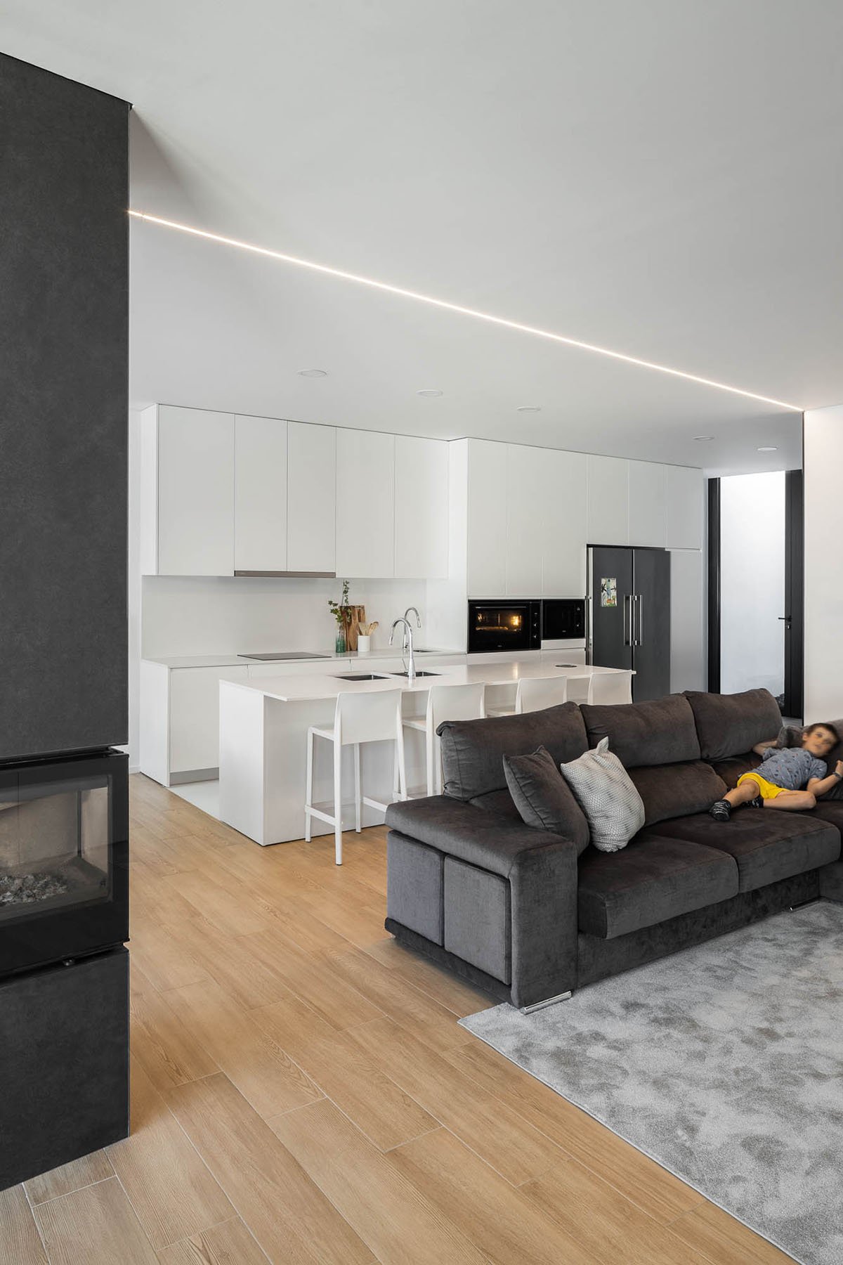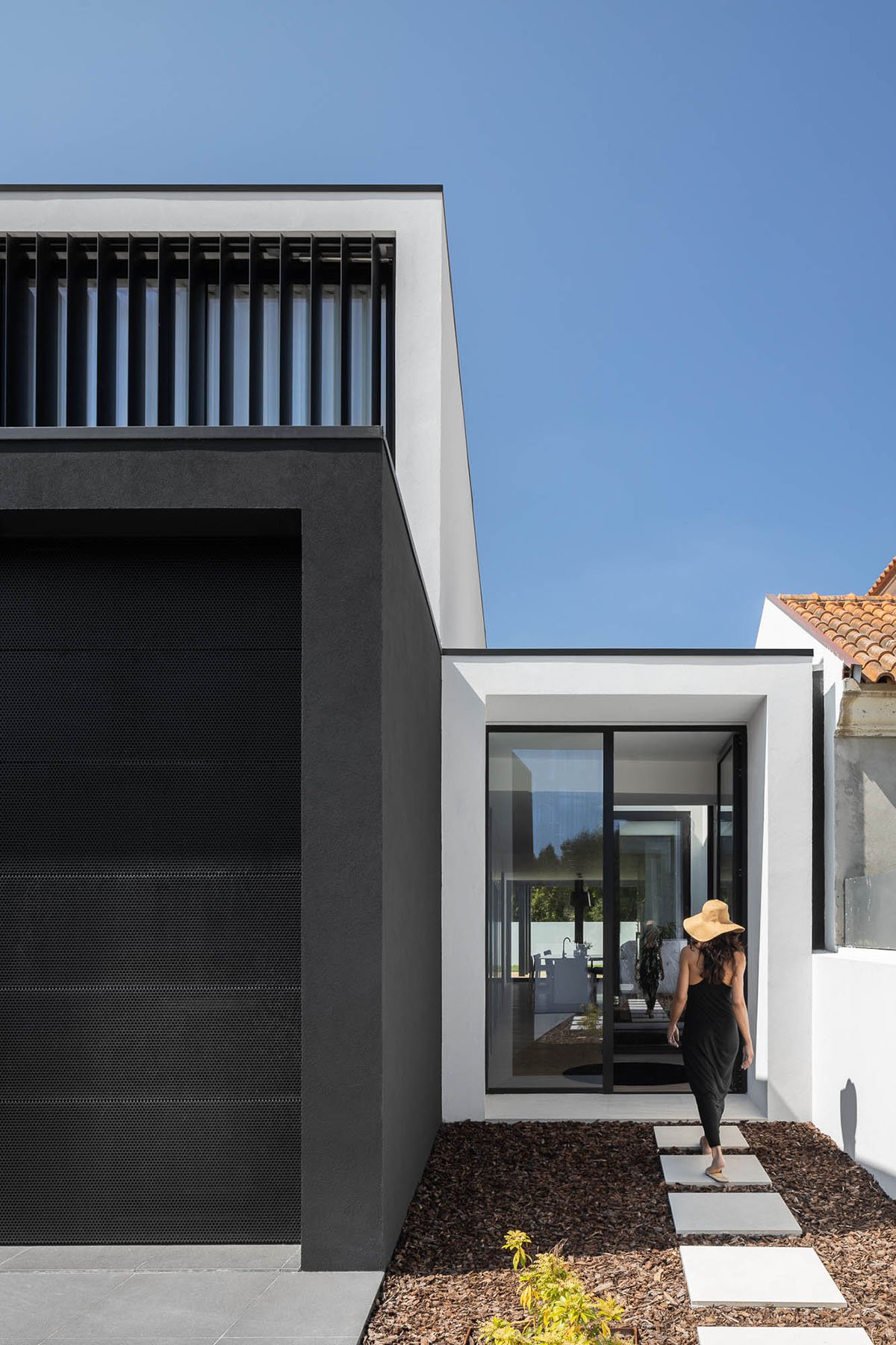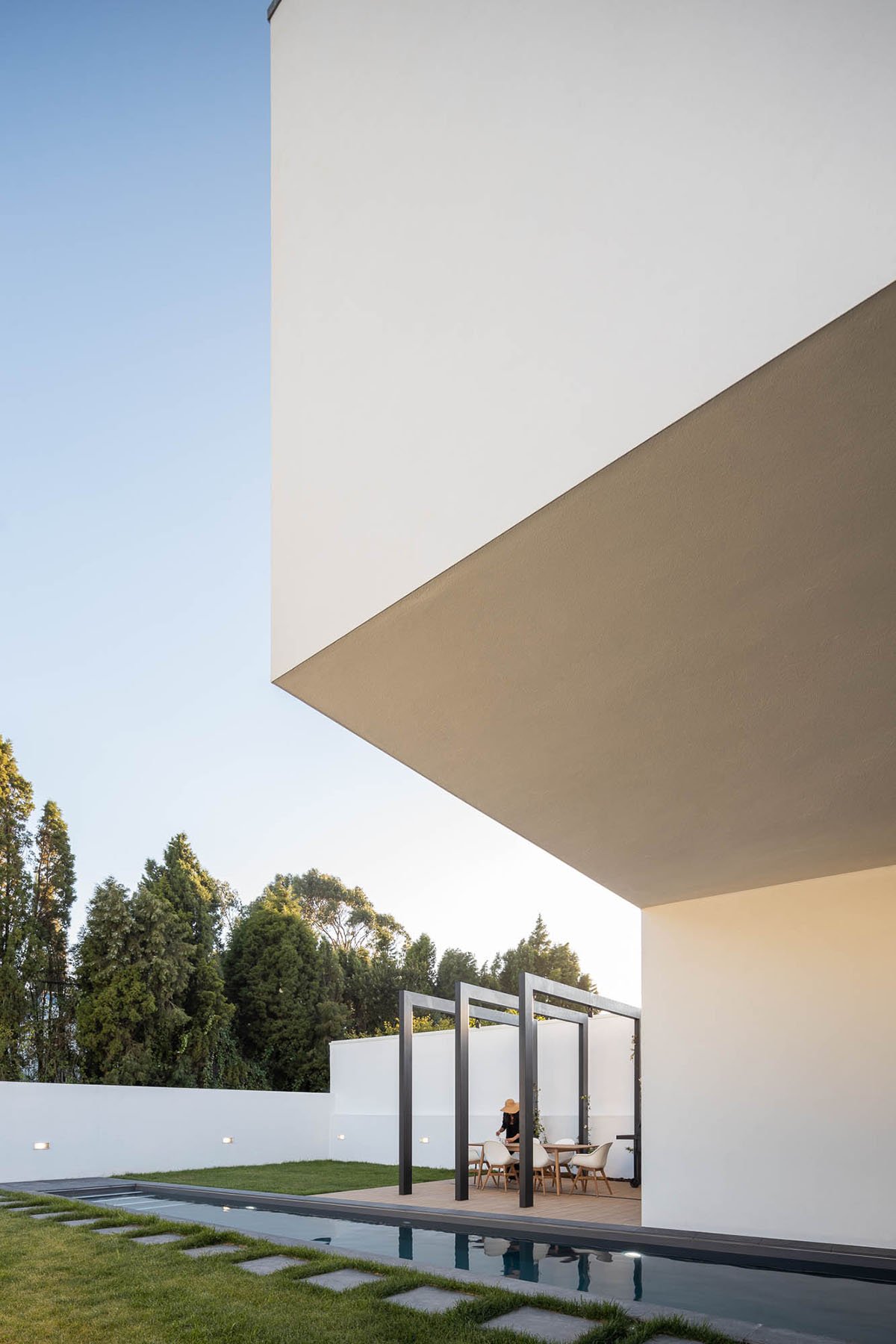 This also allows the drawn back of that same volume on the rear facade, allowing the pool to approach the building’s facade, thus ensuring a direct relationship between them. At this point, it is possible to jump from the house to the pool, or simply enjoy the light effects that the reflection of the water gives to the upper console. The chromatic play of white and black allows to define the exception of this volume, which becomes dark grey, in contrast to the remaining two. In terms of exterior finishes, the house is surrounded by green landscaped spaces, with the exception of a ceramic deck area in the backyard, which allows the transition from the use of the dining room to the outside. This area is protected by a pergola that guarantees the proper shade to this space. The pergola is drawn in the continuation of the adjacent volume, as if it fragmented until it became minimal, stylized pieces that form the structural gantry.