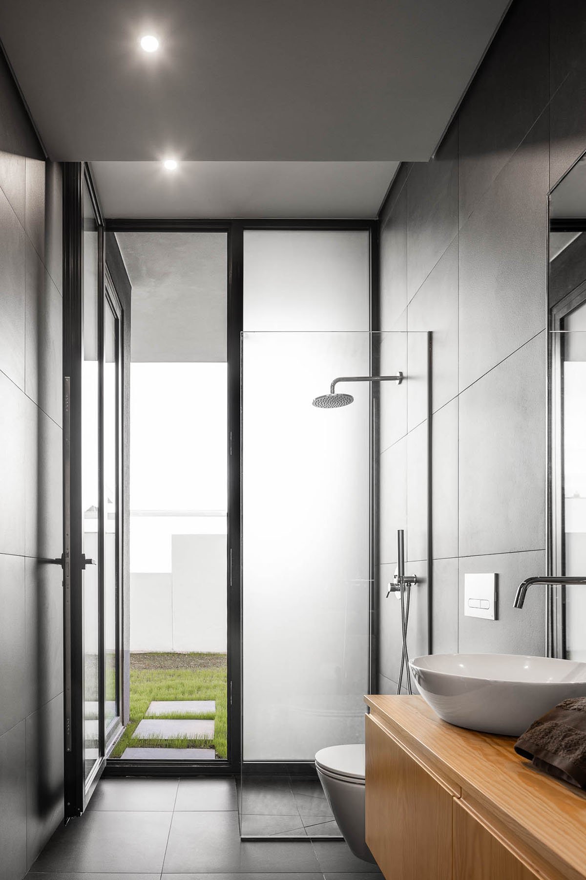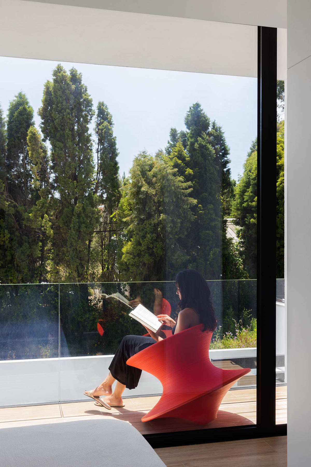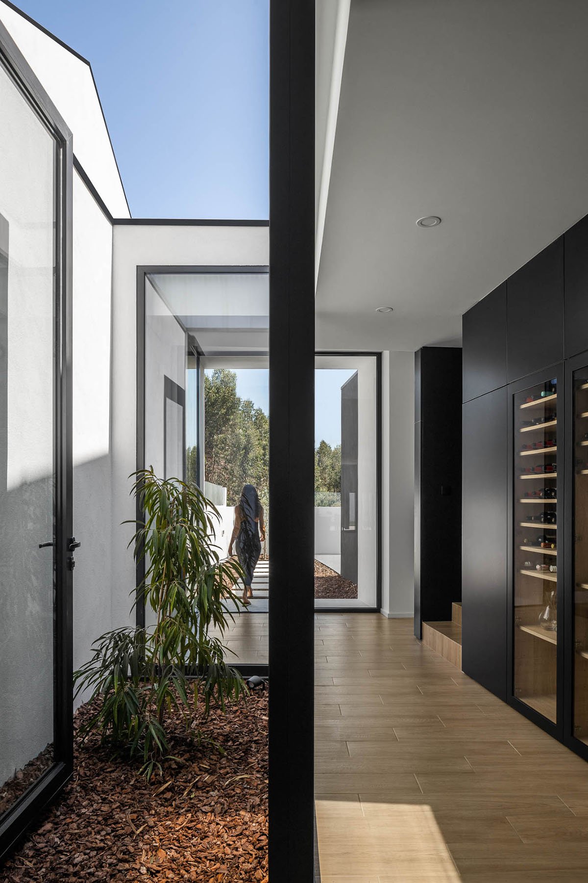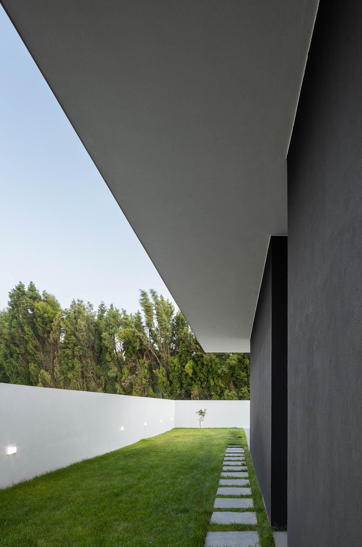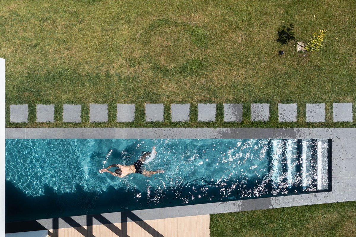 This also allows the drawn back of that same volume on the rear facade, allowing the pool to approach the building’s facade, thus ensuring a direct relationship between them. At this point, it is possible to jump from the house to the pool, or simply enjoy the light effects that the reflection of the water gives to the upper console. The chromatic play of white and black allows to define the exception of this volume, which becomes dark grey, in contrast to the remaining two. In terms of exterior finishes, the house is surrounded by green landscaped spaces, with the exception of a ceramic deck area in the backyard, which allows the transition from the use of the dining room to the outside. This area is protected by a pergola that guarantees the proper shade to this space. The pergola is drawn in the continuation of the adjacent volume, as if it fragmented until it became minimal, stylized pieces that form the structural gantry.