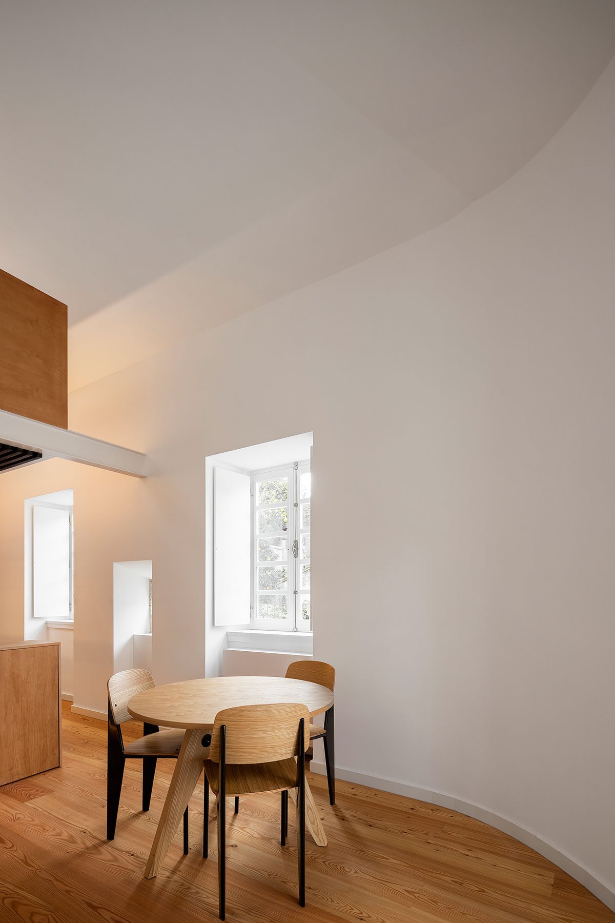 On these upper floors, which are accessed via the original building staircase, the architects restored the spatial amplitude of the roof, giving quite a generous floor-to-ceiling height and letting the light reflect on the white ceilings and walls, flooding into the entire space that had once been enclosed. A skylight was added to the mezzanine, giving the user a view of the castle from the workstation and reminding them that this contemporary space is filled with history.