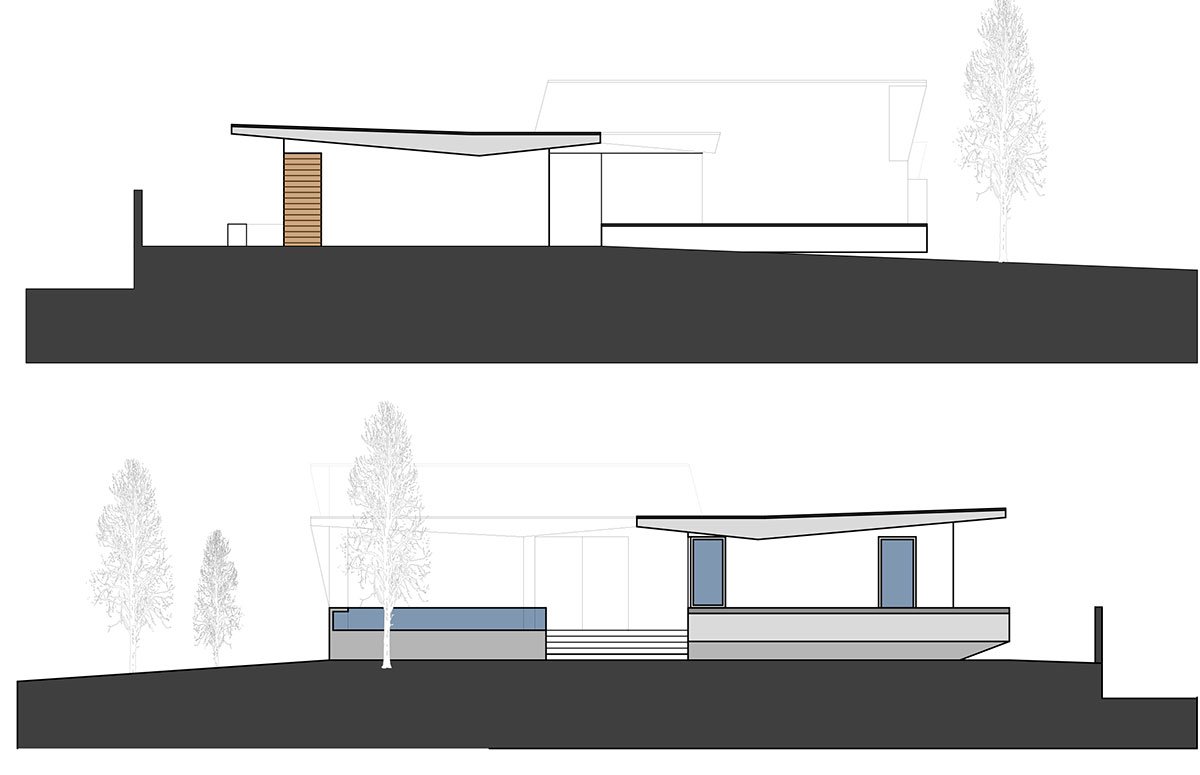 The set is composed of two parts, a taller one representing the most public areas of the house, the entrance, the generous living room, and the kitchen (with pantry). The lower volume, facing the east side, organizes four rooms, a laundry, and an office, all arranged in a row.
