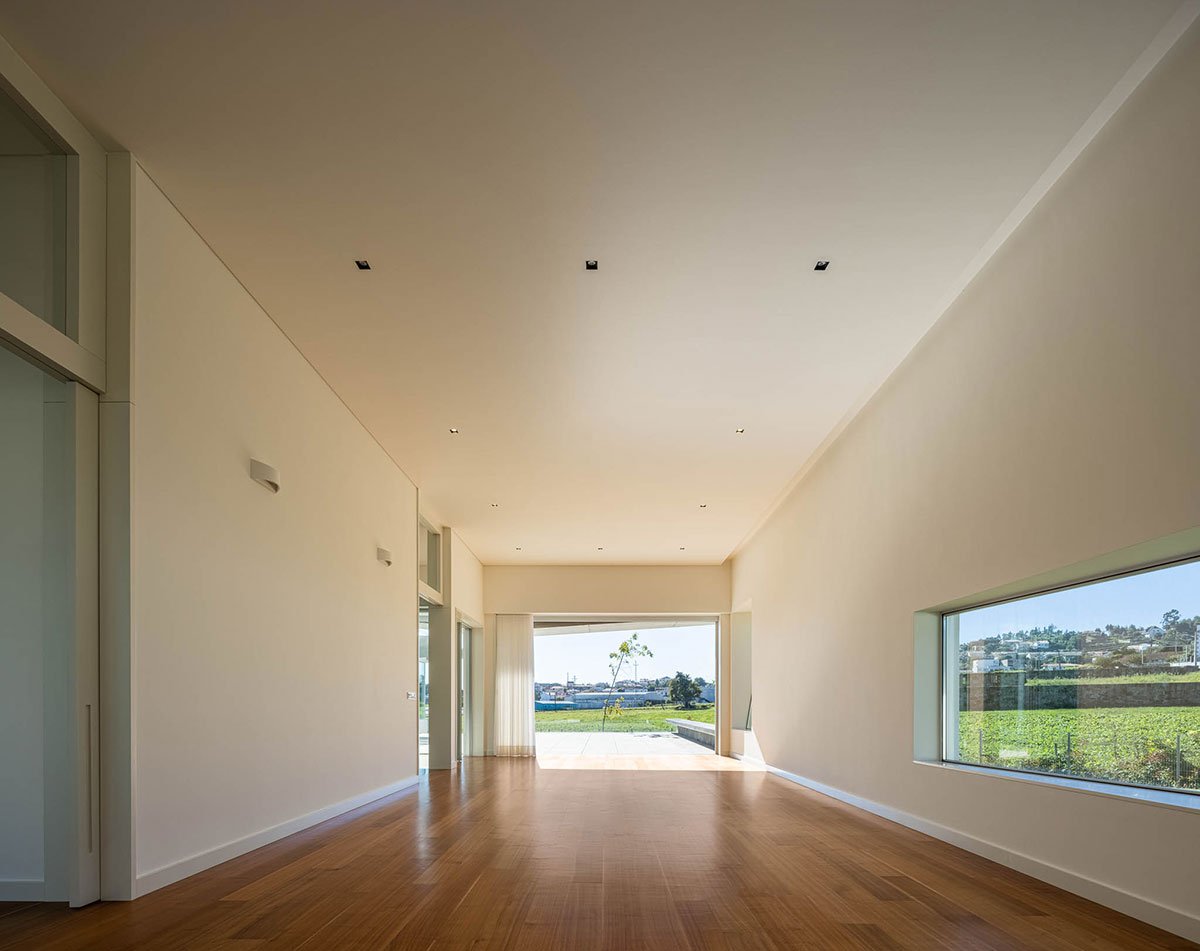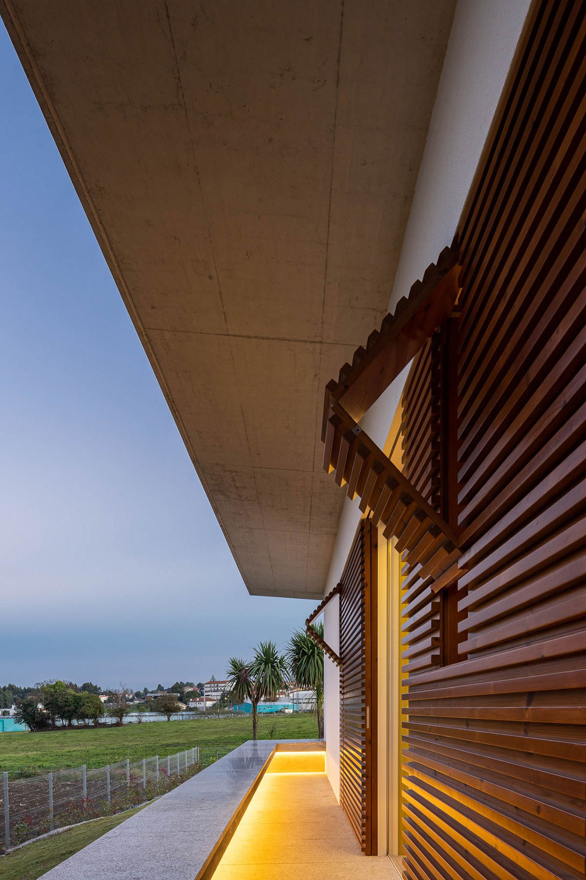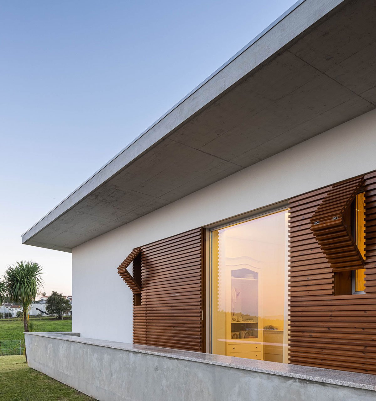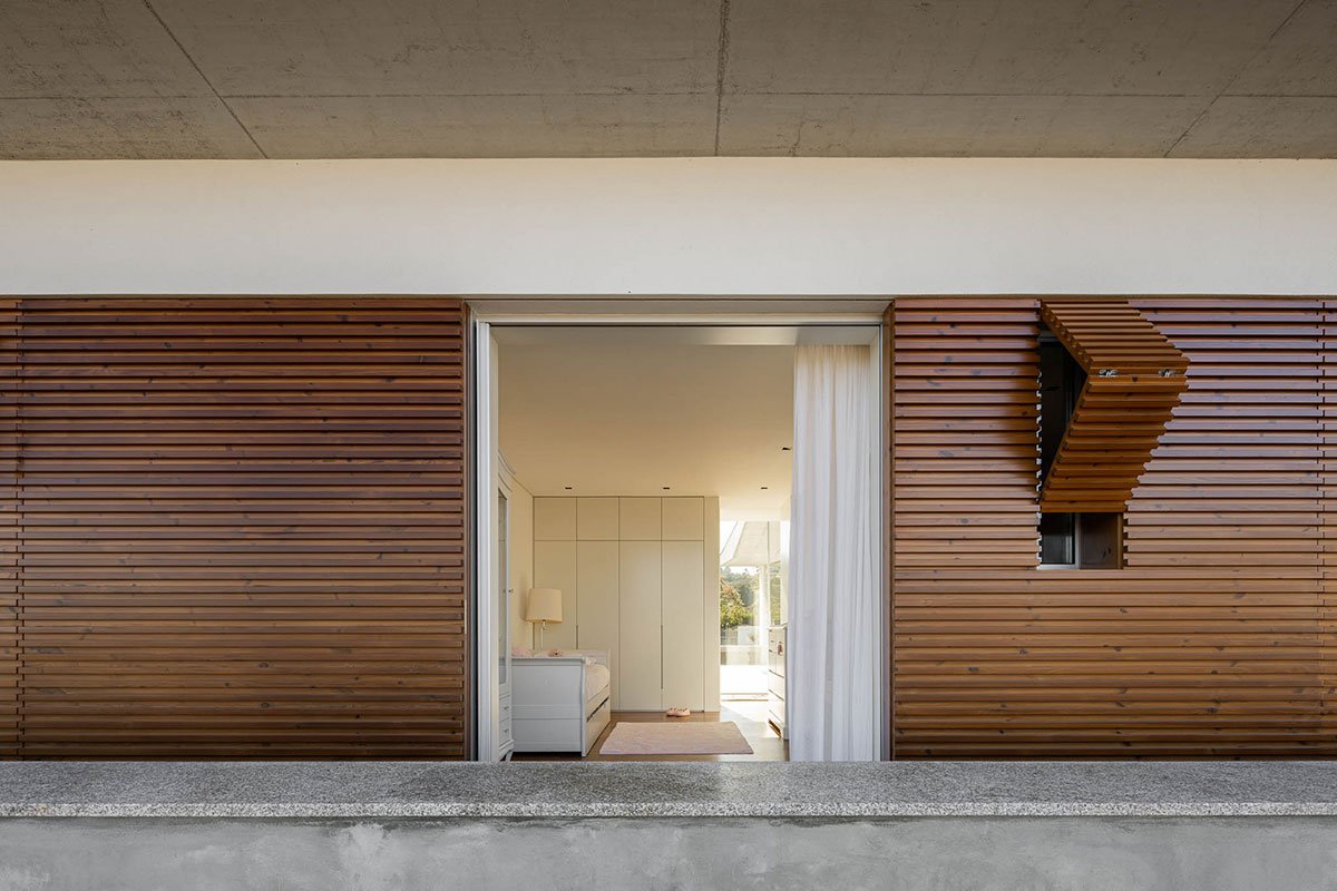 All the openings of the volumes seek a language in which the notion of the window as an element of the interior-exterior relationship is assumed. In the bedrooms, the need for seclusion led to the creation of a horizontalized wooden skin, which reinforces the grammatical exercise of a house that intends to be modern but contaminated by a search for fluidity and coherence in the architectural language.