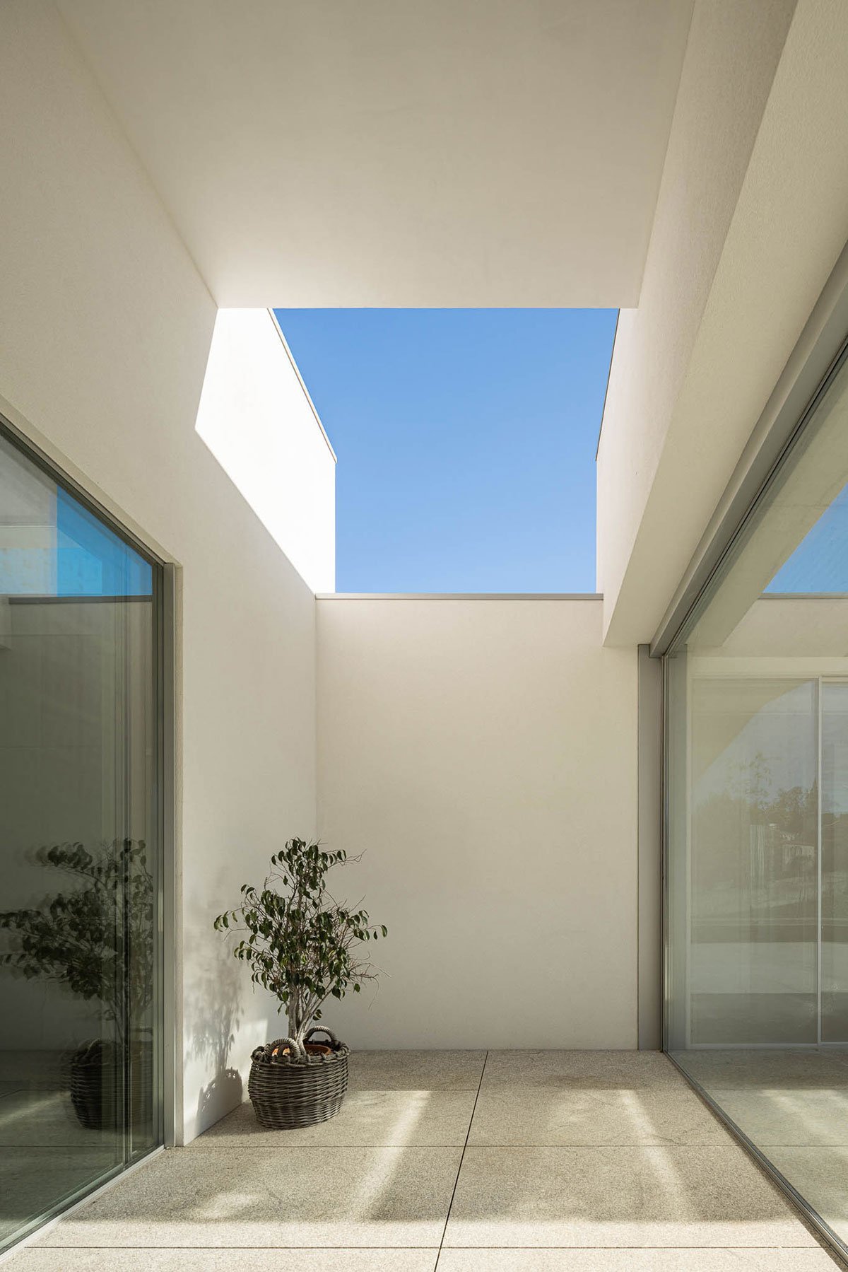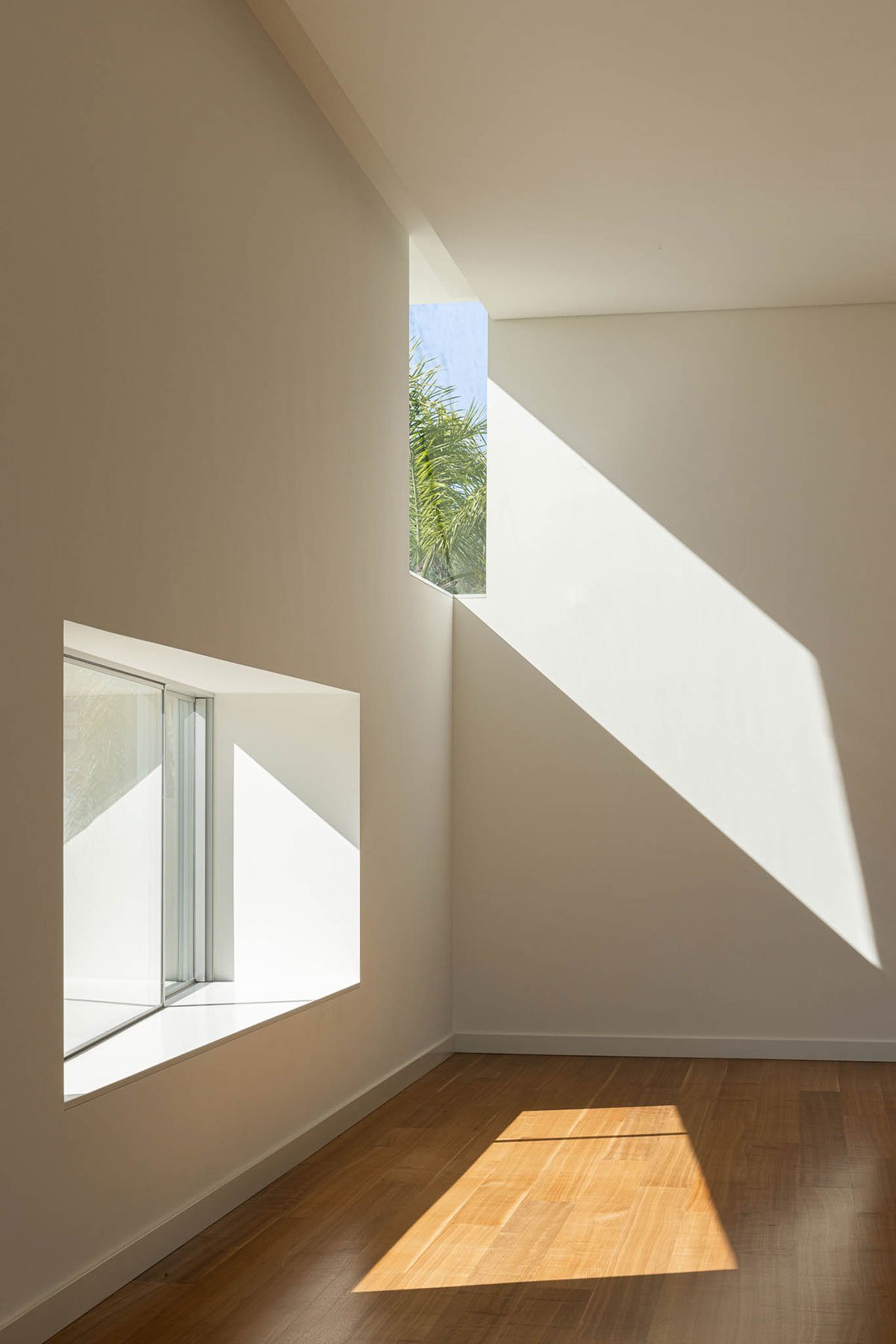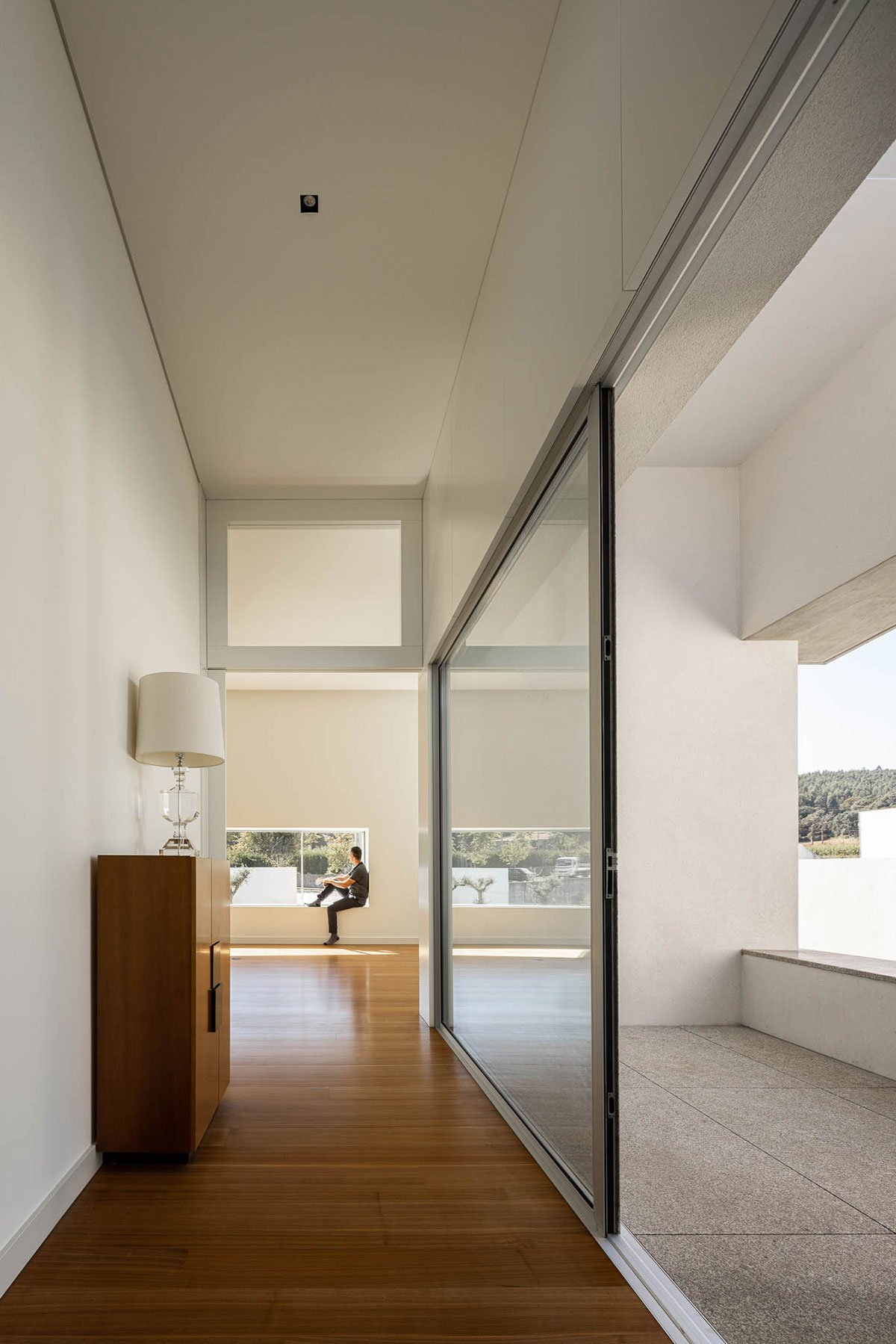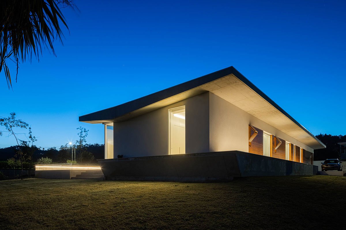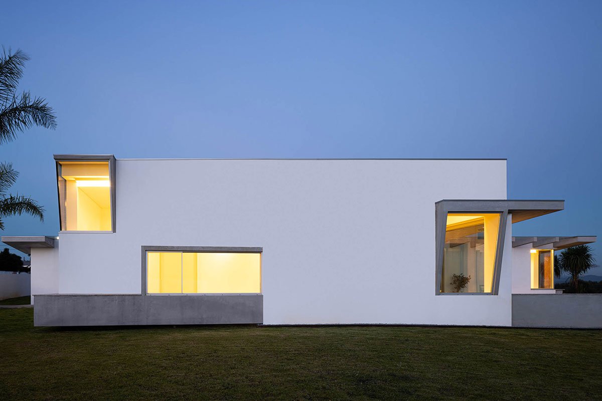 All the openings of the volumes seek a language in which the notion of the window as an element of the interior-exterior relationship is assumed. In the bedrooms, the need for seclusion led to the creation of a horizontalized wooden skin, which reinforces the grammatical exercise of a house that intends to be modern but contaminated by a search for fluidity and coherence in the architectural language.