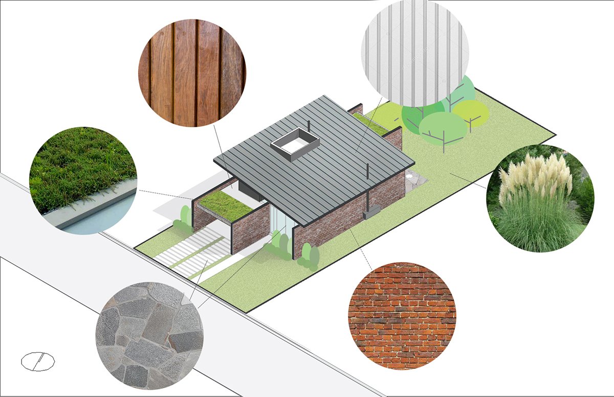 The contrast between the rustic, imperfect brick and the straight, artificial metal sheets is a clear highlight of the project.