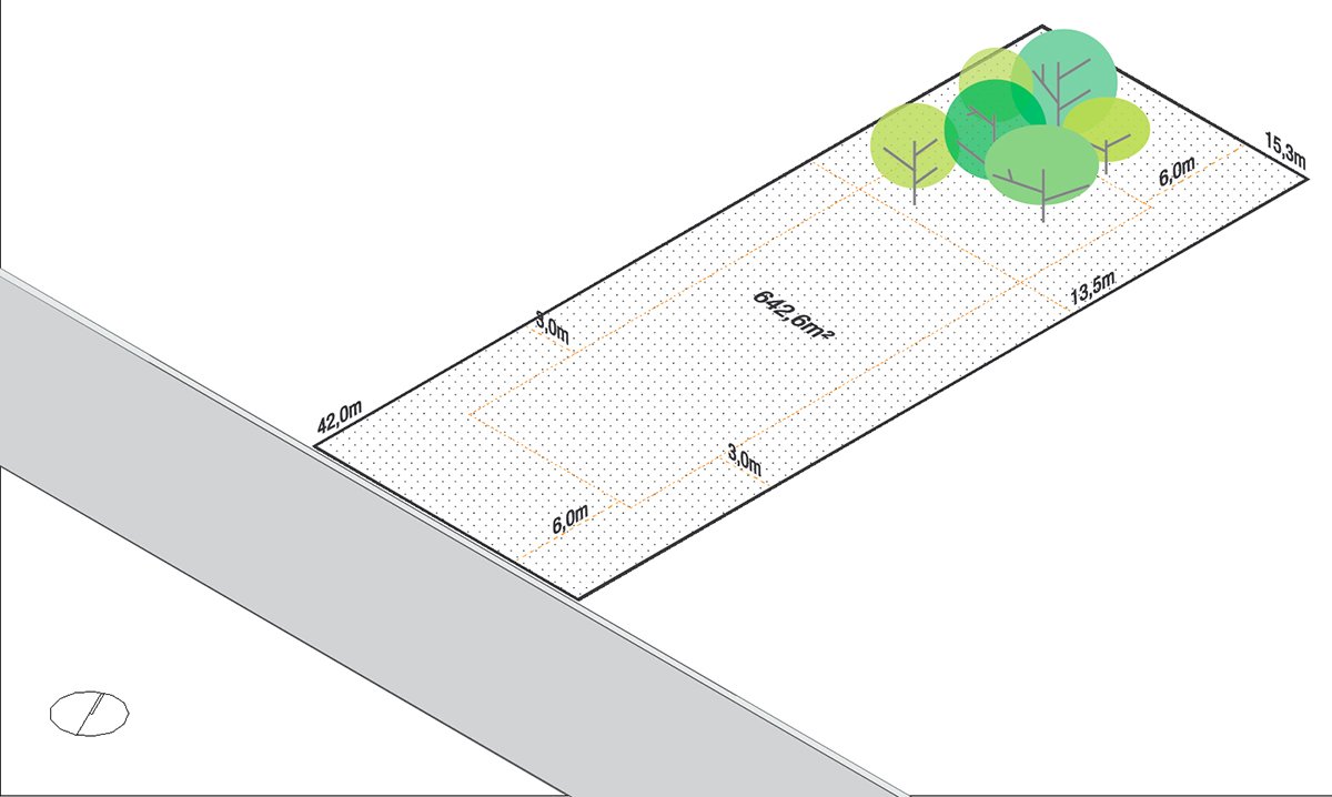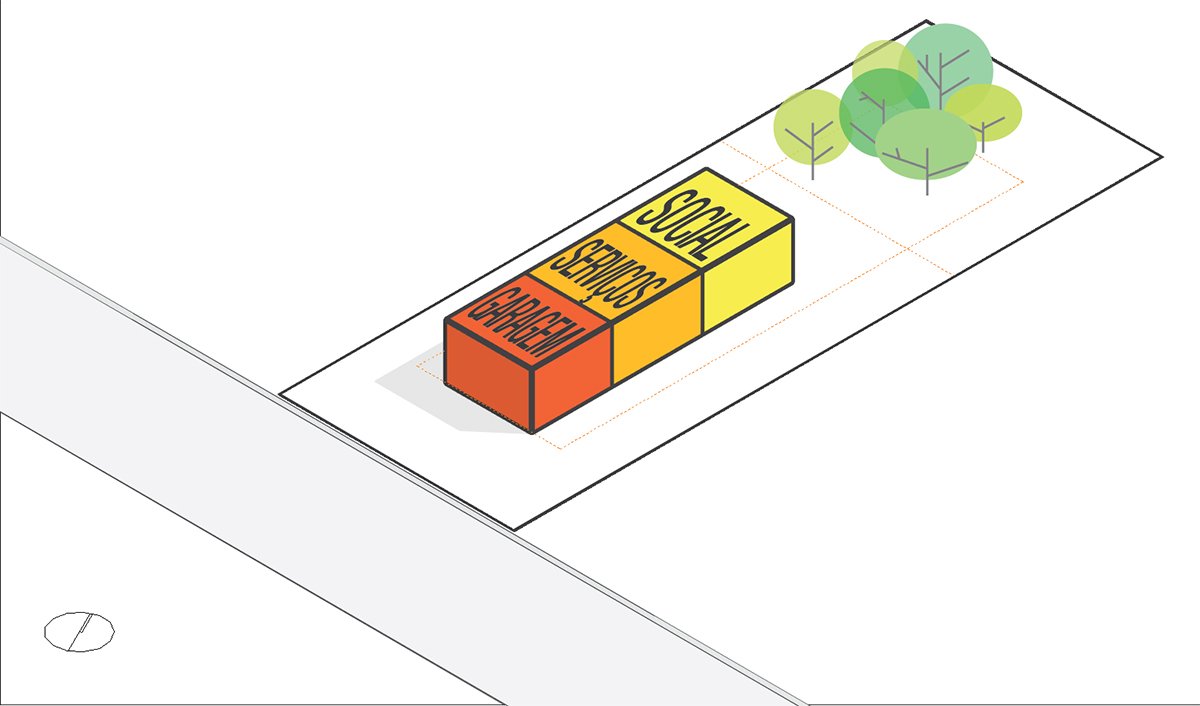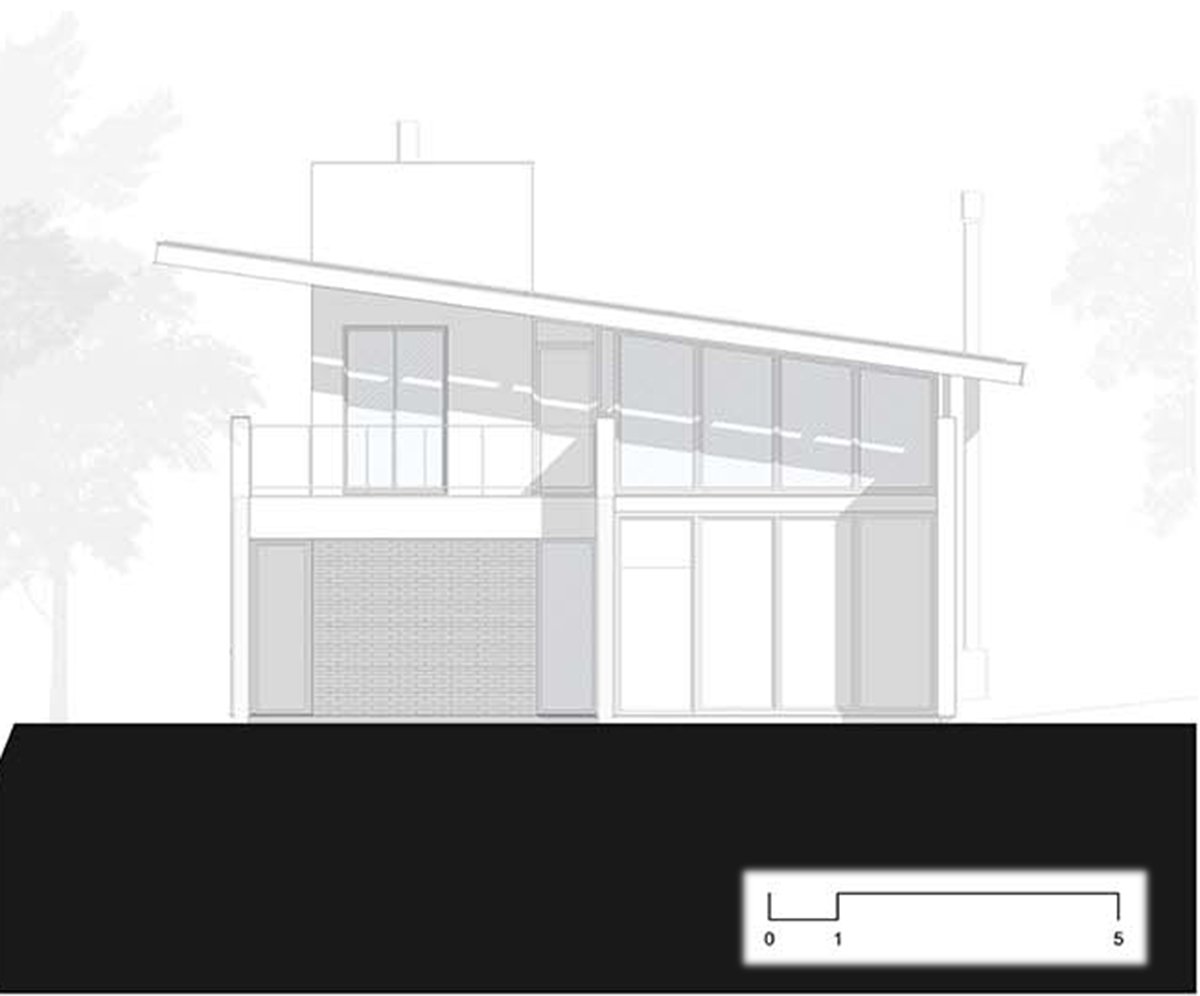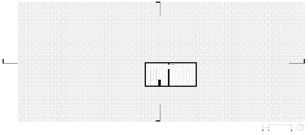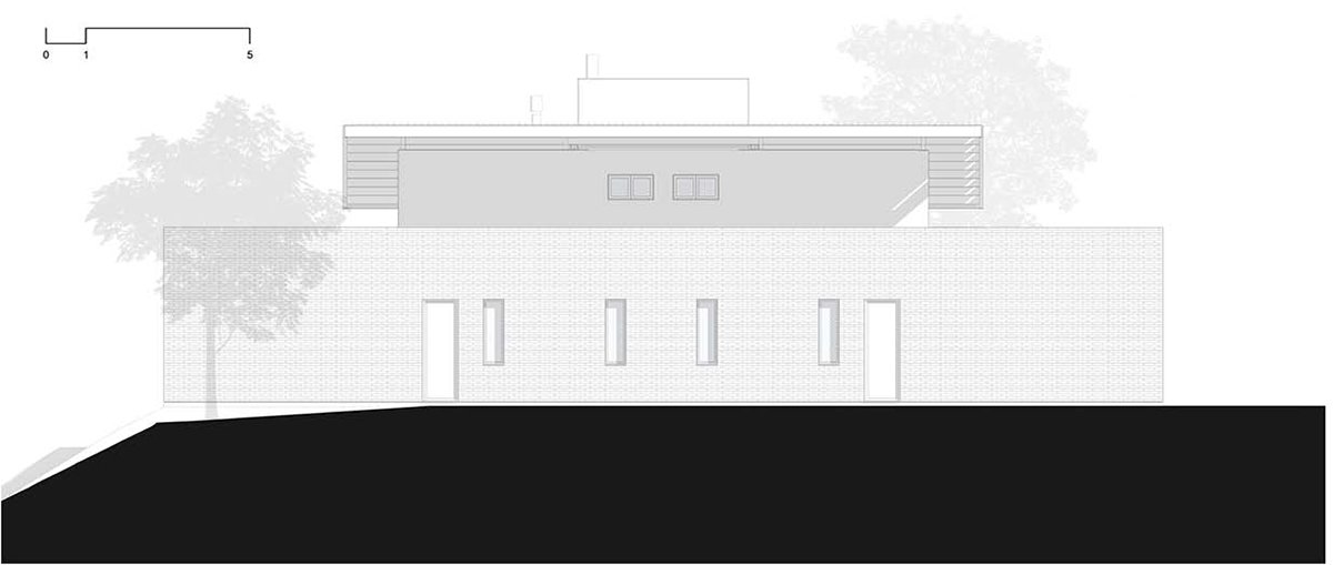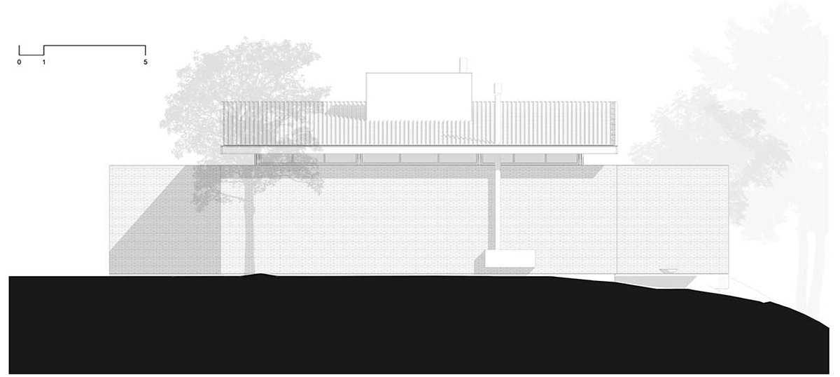 The ground floor plan is characterized by four parallel lines. The four brick walls. The main spaces are configured by these partitions: The garage, kitchen, living room and master suite.