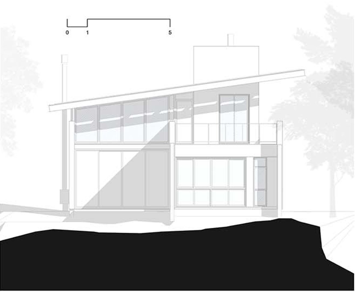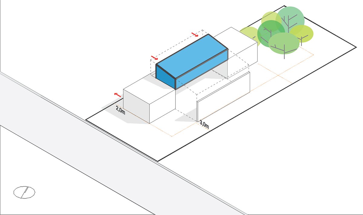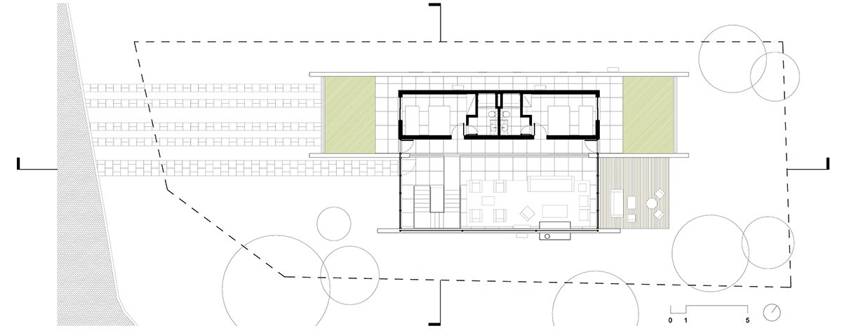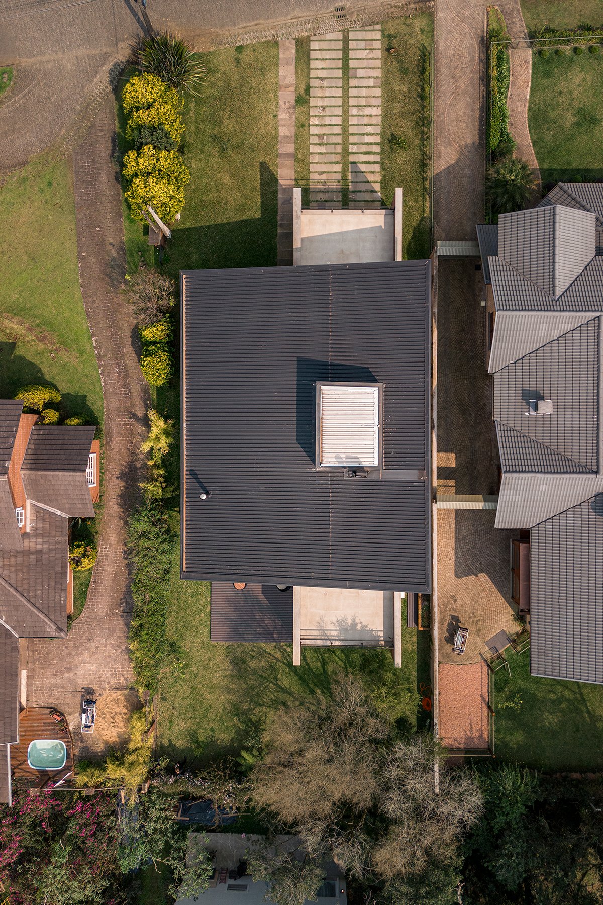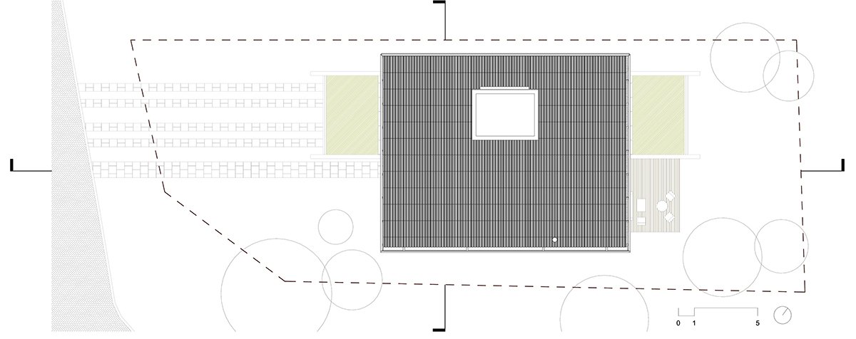 The other two suites, requested by the client, rest on the concrete slab above the kitchen, in a dark rectangular volume. The set is crowned by an angled metallic roof, a requirement of the legislation, which creates a double-height room.