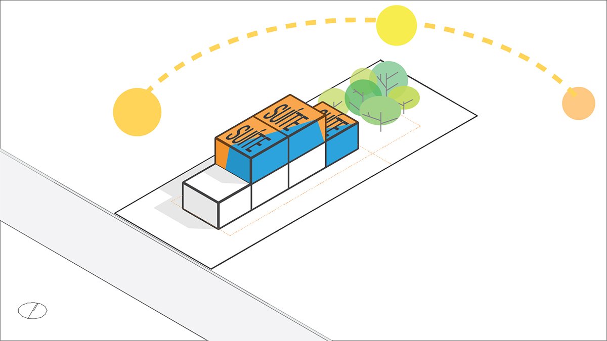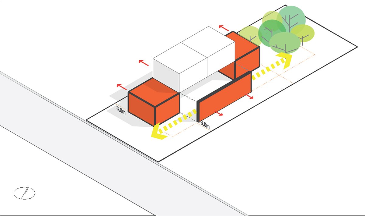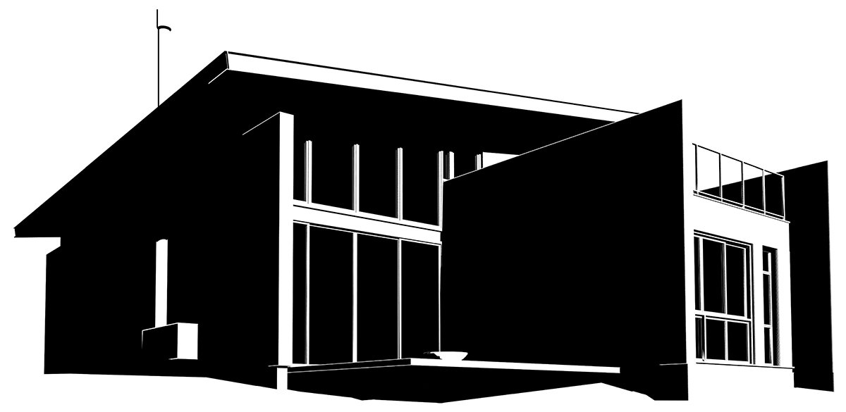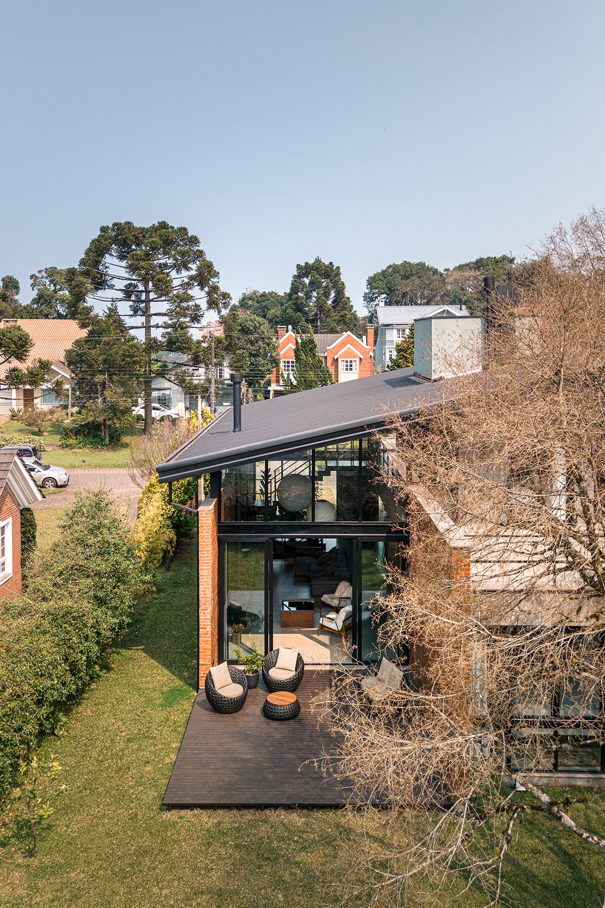 The other two suites, requested by the client, rest on the concrete slab above the kitchen, in a dark rectangular volume. The set is crowned by an angled metallic roof, a requirement of the legislation, which creates a double-height room.