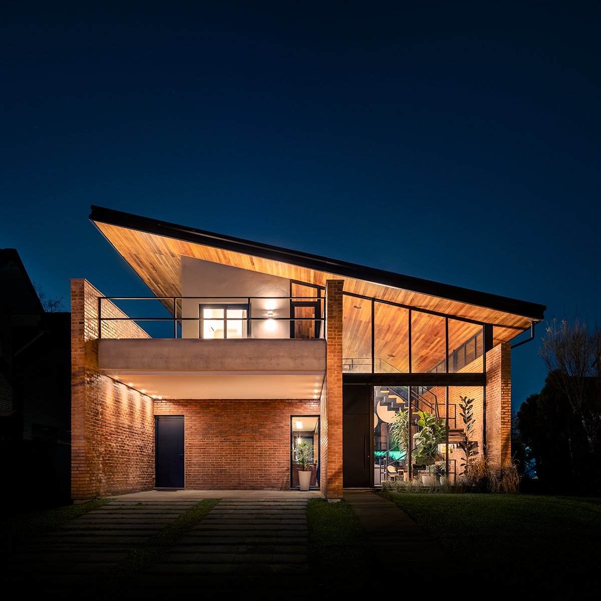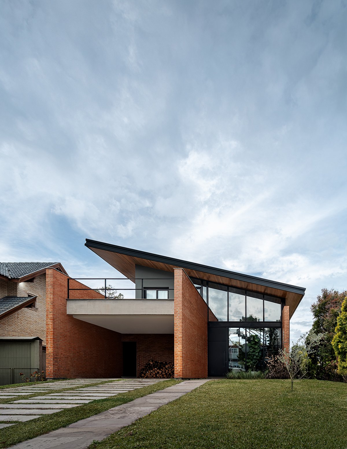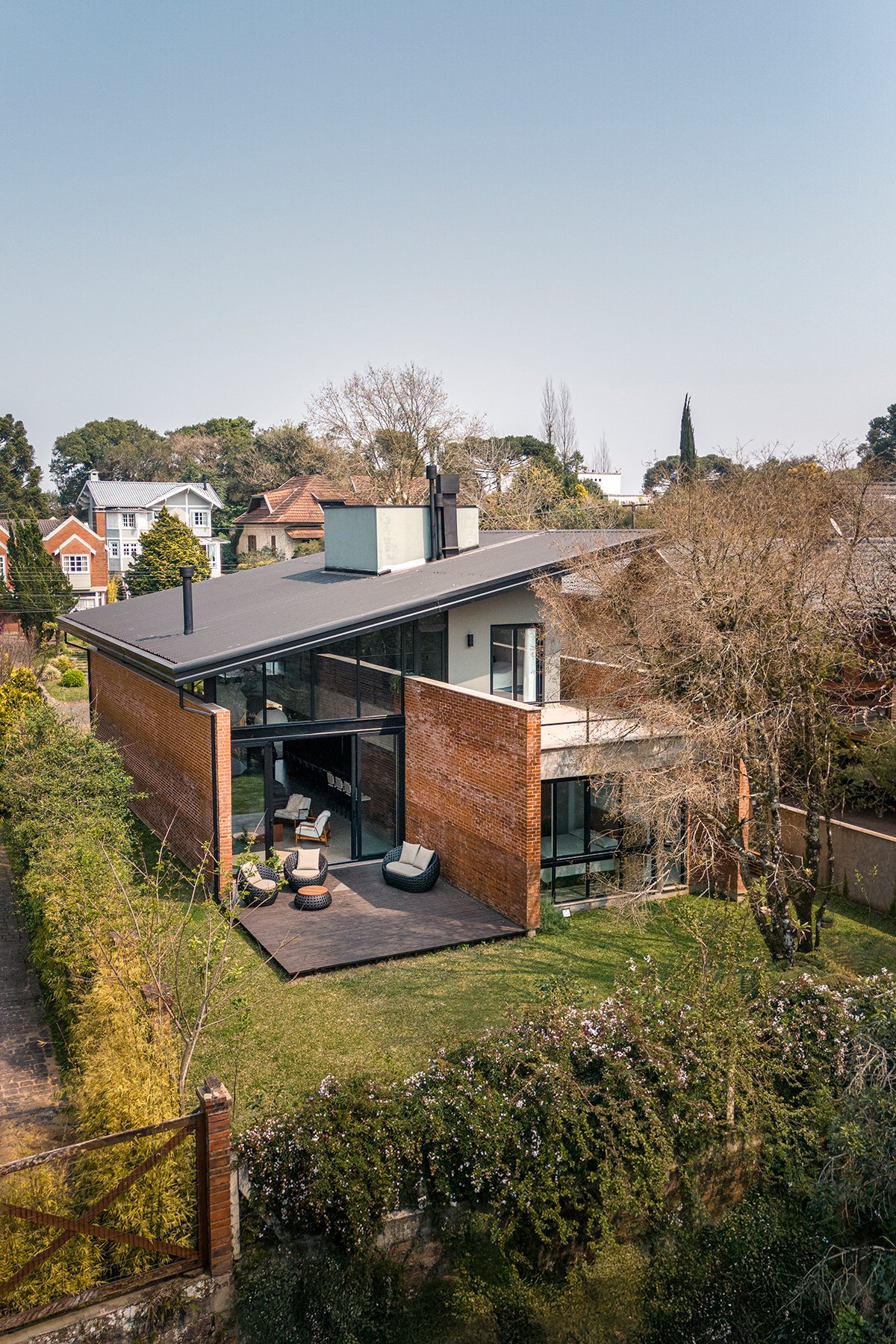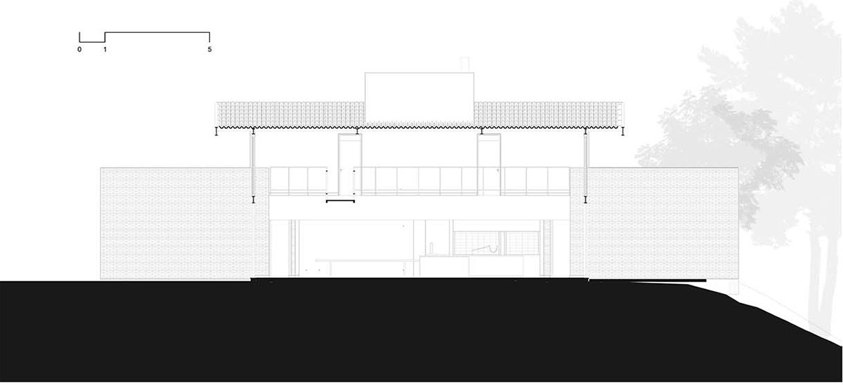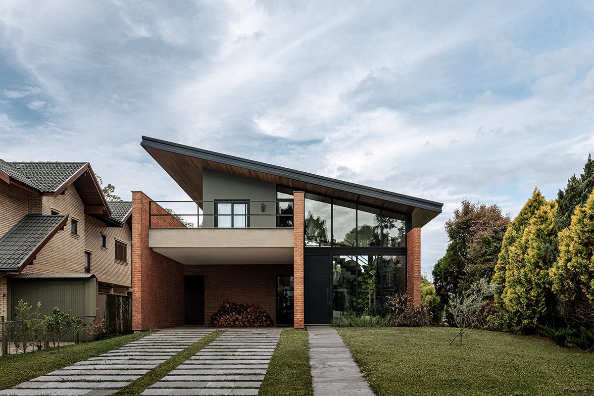 Excerpt: Casa Gralhas by OSPA Arquitetura & Urbanismo is defined by four parallel brick walls that organize the ground floor into a garage, kitchen, living room, and master suite. Above, two suites rest on a concrete slab in a dark rectangular volume, all crowned by an angled metallic roof. The residence emphasizes the dialogue between rustic, imperfect brick and the precision of metal sheets, creating contrast and spatial richness.
