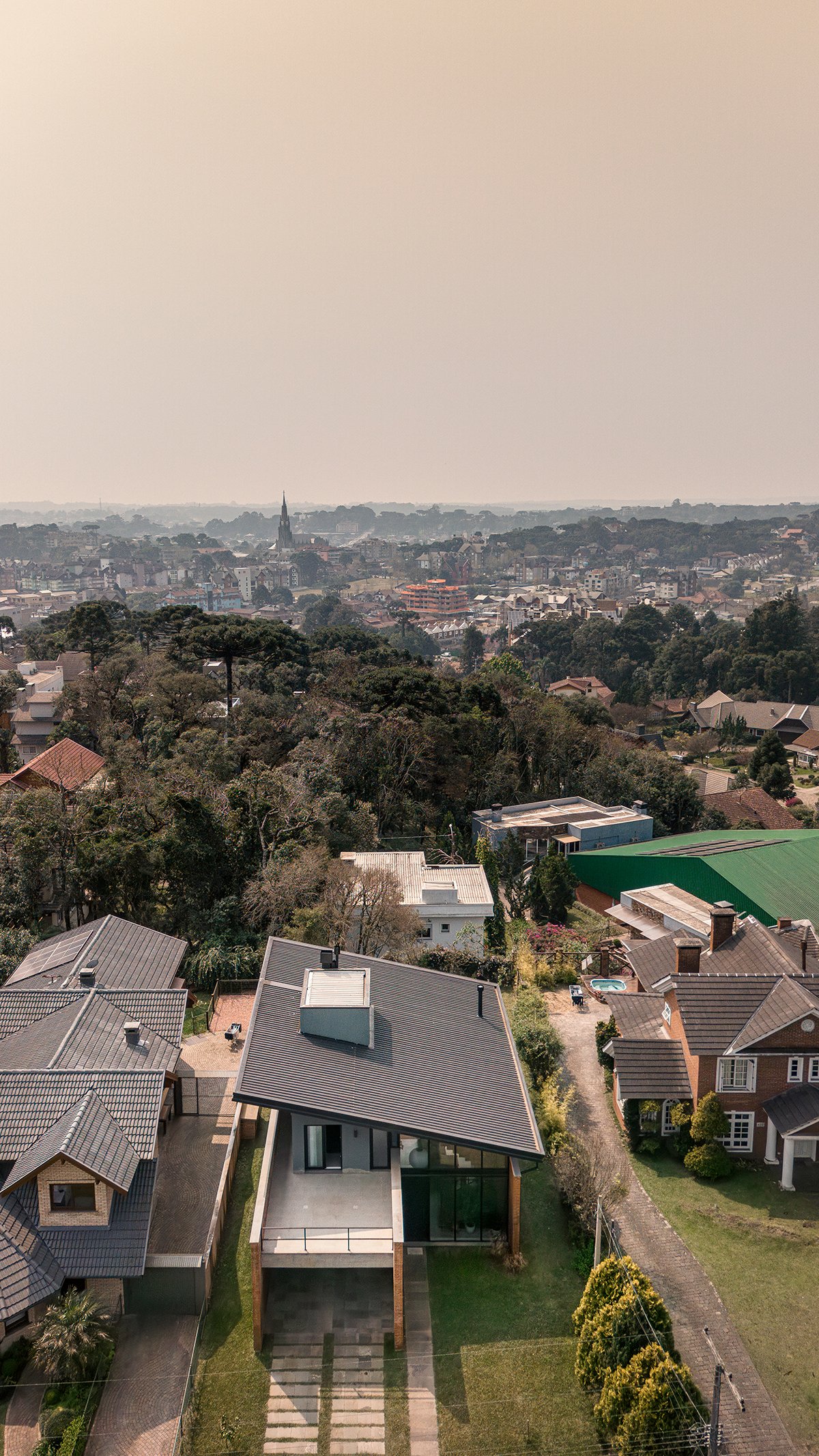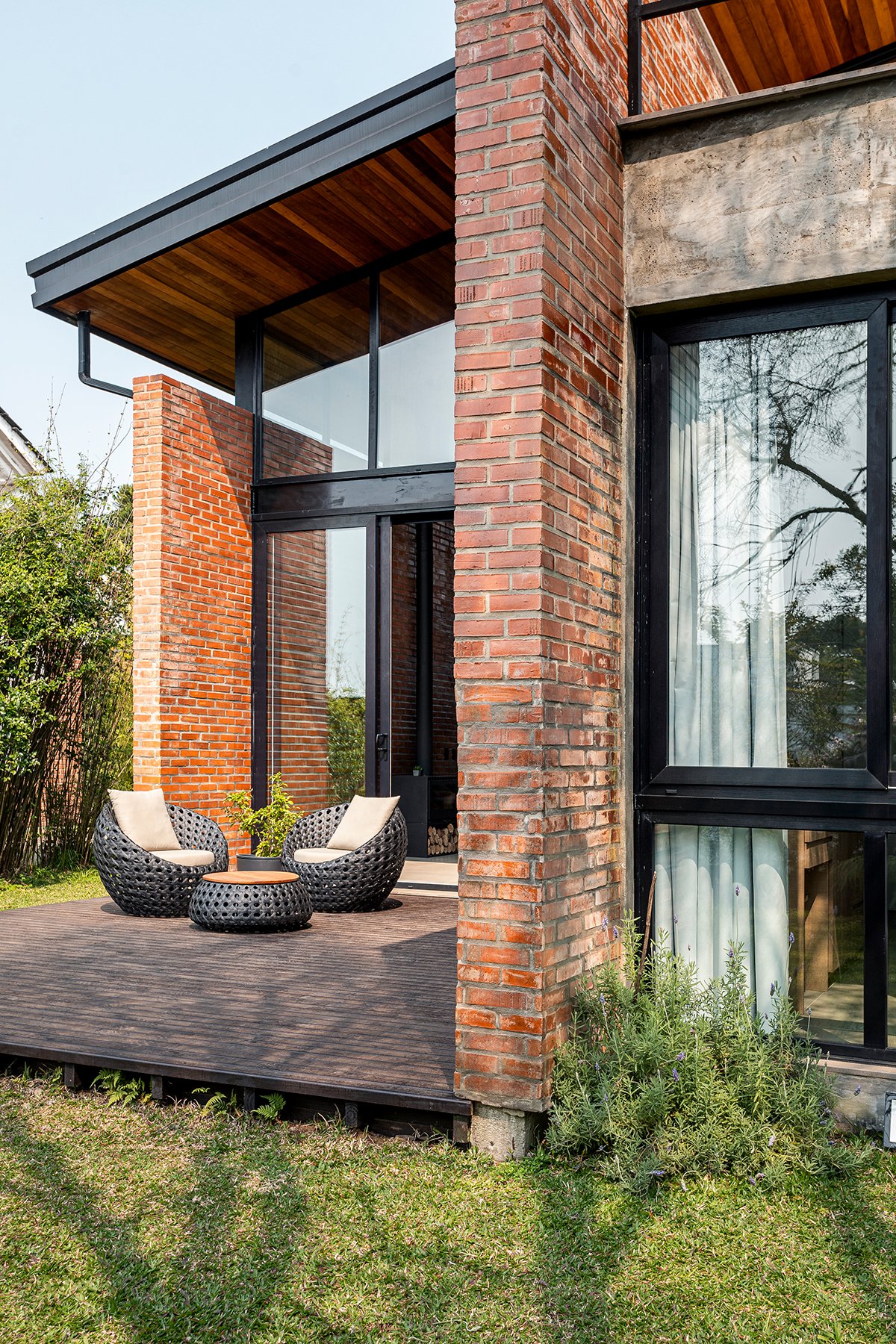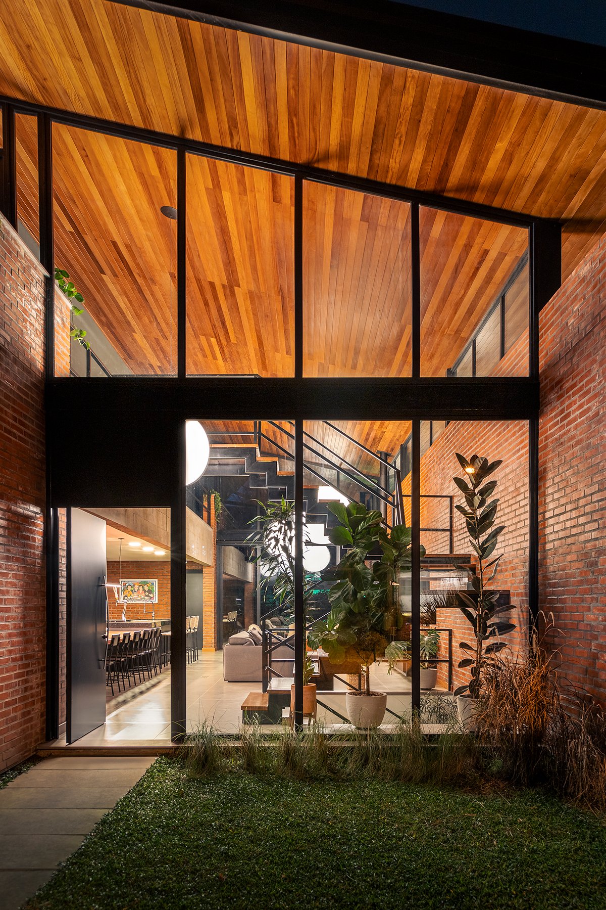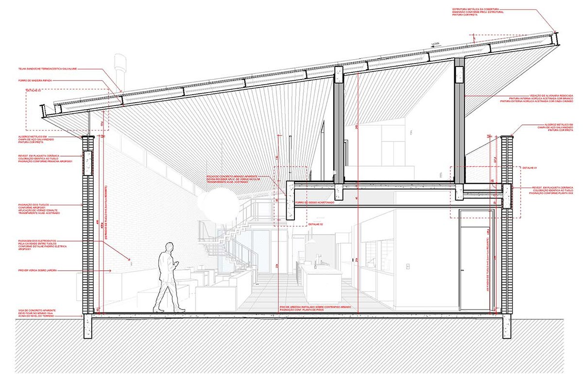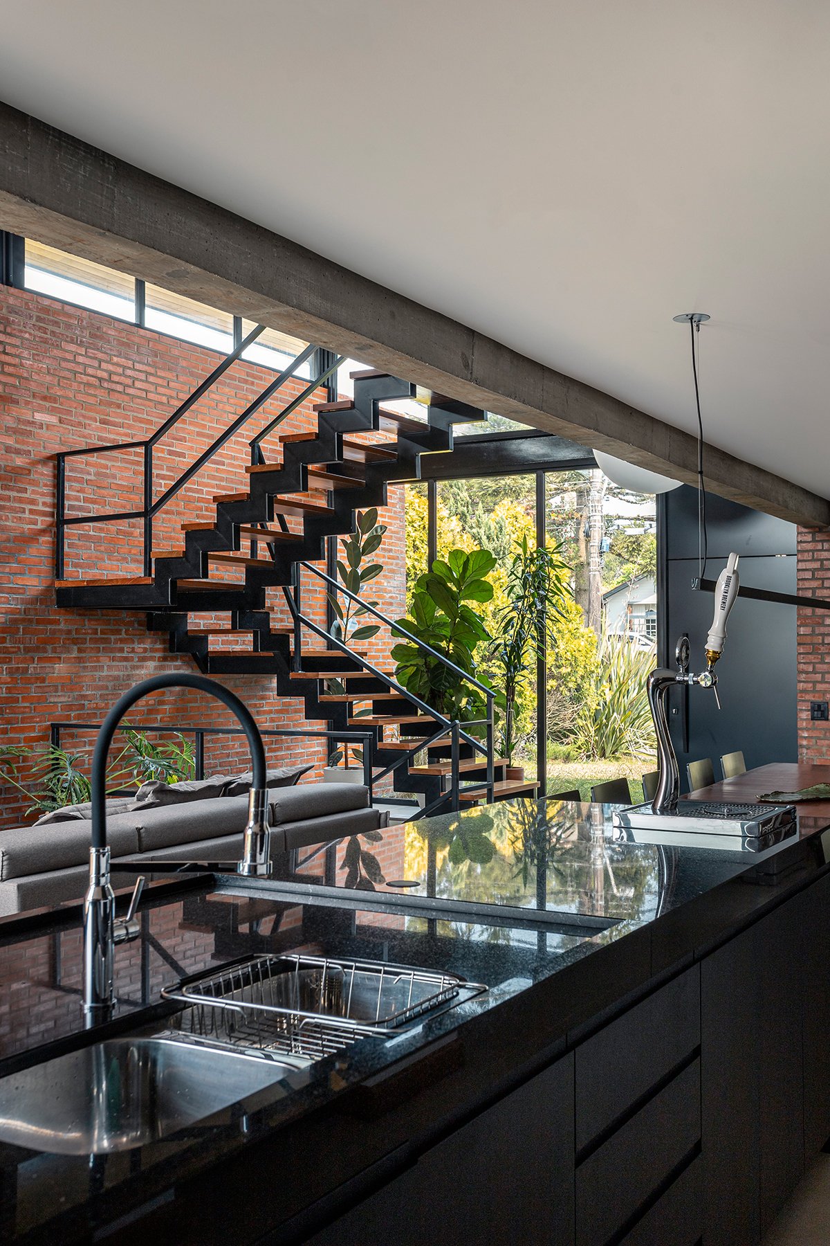 Excerpt: Casa Gralhas by OSPA Arquitetura & Urbanismo is defined by four parallel brick walls that organize the ground floor into a garage, kitchen, living room, and master suite. Above, two suites rest on a concrete slab in a dark rectangular volume, all crowned by an angled metallic roof. The residence emphasizes the dialogue between rustic, imperfect brick and the precision of metal sheets, creating contrast and spatial richness.