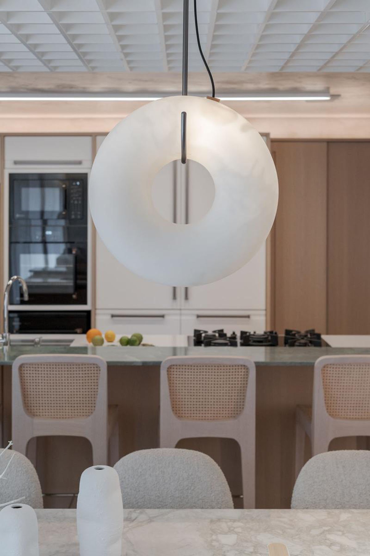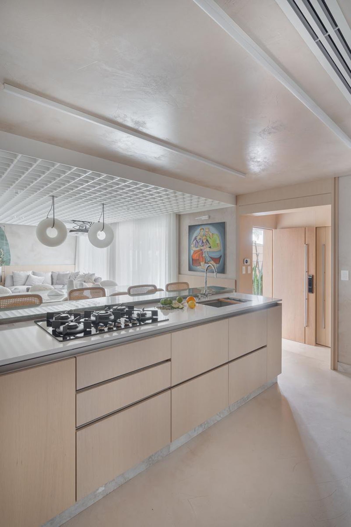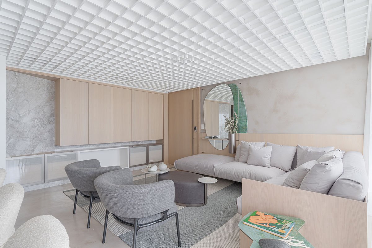 [Text as submitted by architect] In this project, Studiocolnaghi seek for a wide space, using few elements and a neutral color palette. The room perception is much wider than the previous configuration. This is a result of a white wood ceiling spread over the main area. In this element there are audio, video, air conditioning and light solutions. The light wood choice matches to white, creating a timeless background to the design furniture, signed by Jader Almeida for Sollos. The color touch appears on the rug, handmade custom, and emerald green marble.