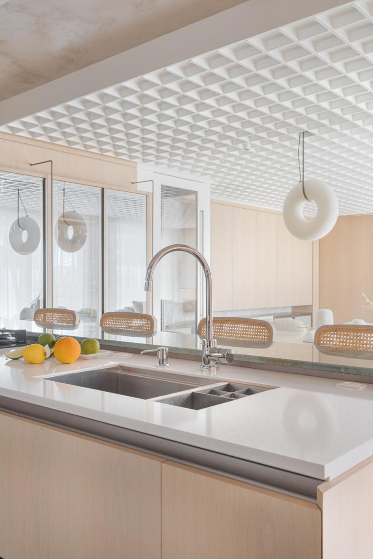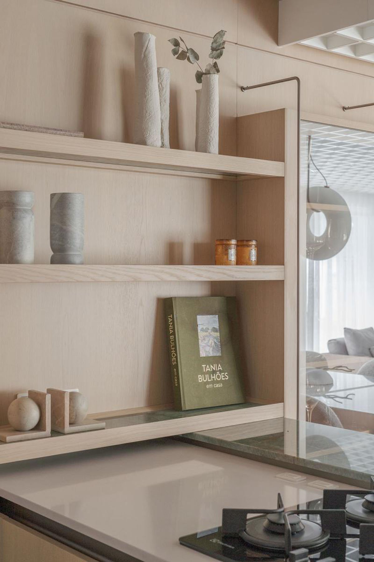 In the kitchen area, there is a glass cabinet which also serves as support to dining table. Some exclusive details were developed to this client, such as velvet cutlery drawer organizers.