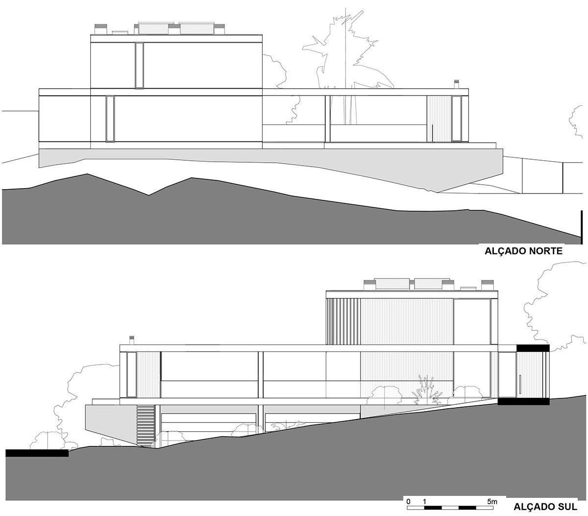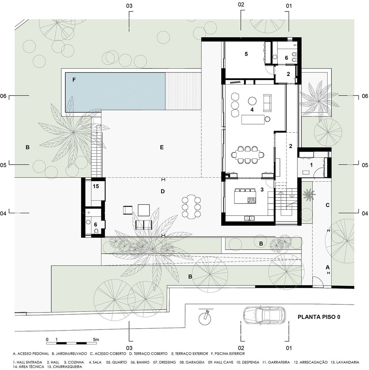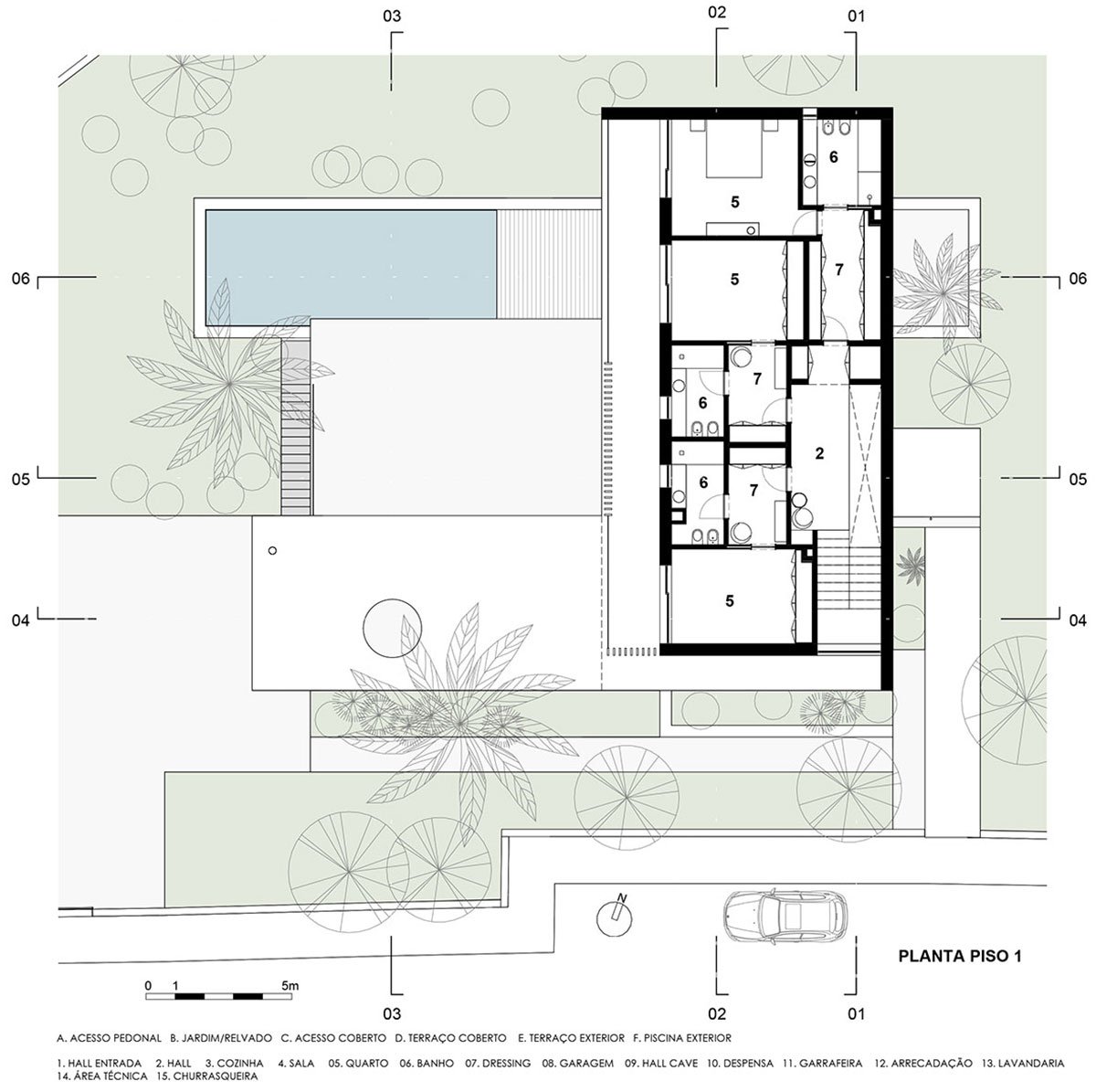 Pedestrian and vehicle access are located at different levels through Rua Dr. Domingos da Silva Coelho, utilizing the natural slope of the road and land. The pedestrian access is situated at a higher level on the ground floor, leading to the house entrance through a flap. The car access is located further west at a lower level, leading to a partly covered patio that connects to the garage and service entrance in the basement. The two levels are externally connected through a ramp located to the south or a staircase that connects the ground floor patio, next to the pool, to the basement parking patio.