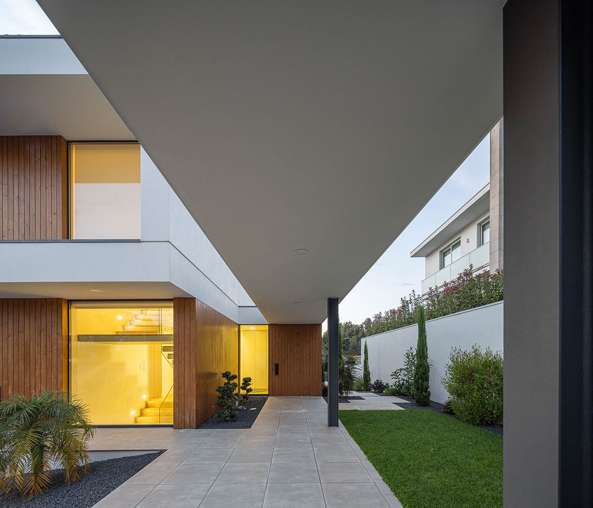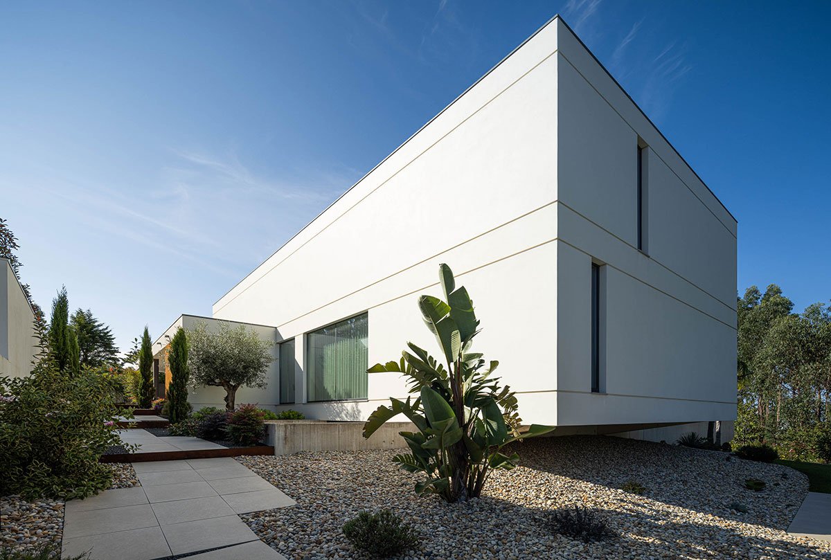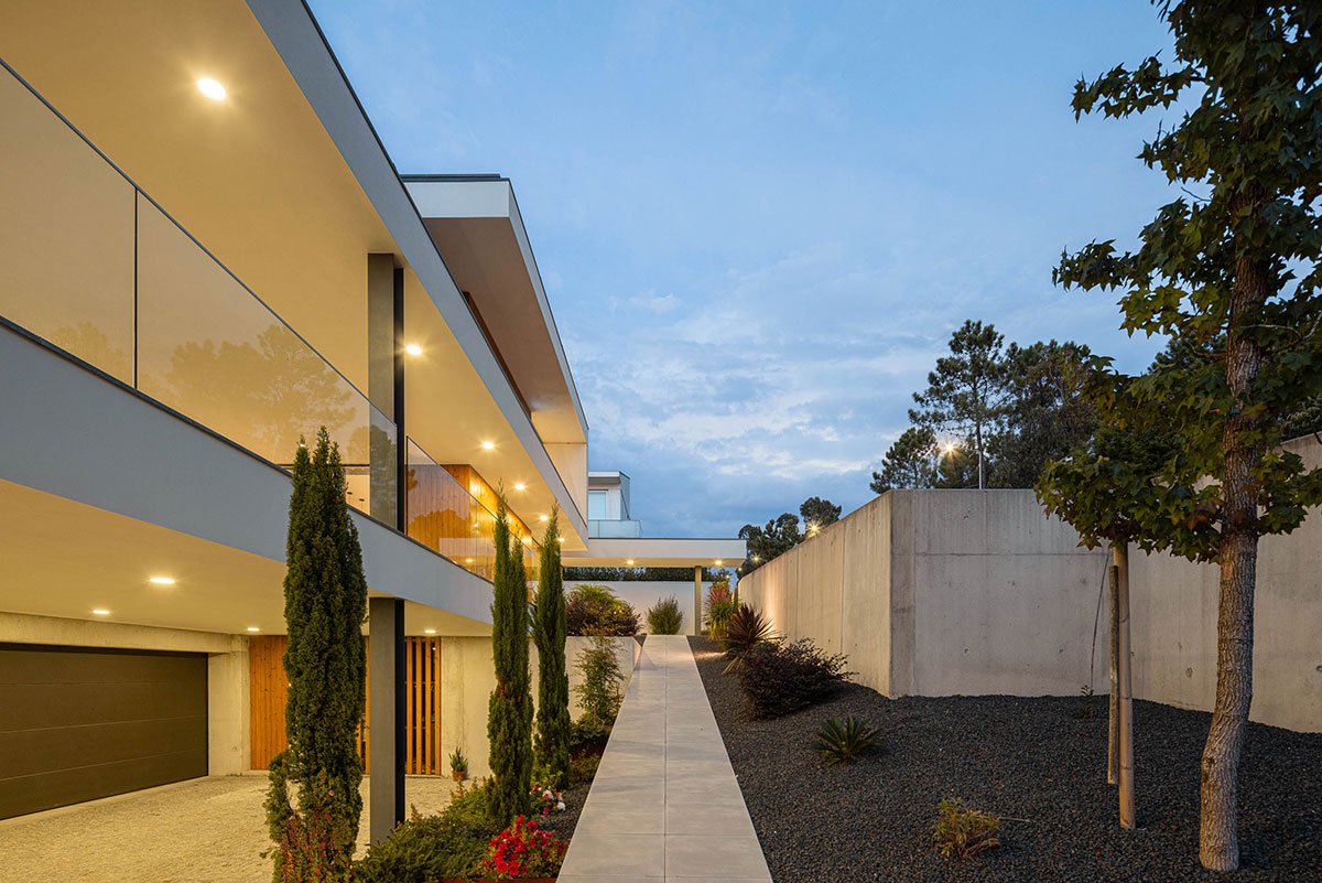 Excerpt: Casa J.M.C., a residence designed by Atelier d’Arquitectura Lopes da Costa, is situated on a triangular plot with a steep slope that influences its volume and shape. The design creates a dynamic and less compact structure through a uniform, formal structure with consistent volume and materials. The exterior design enhances the visual and functional connection between inside and outside spaces while ensuring privacy.