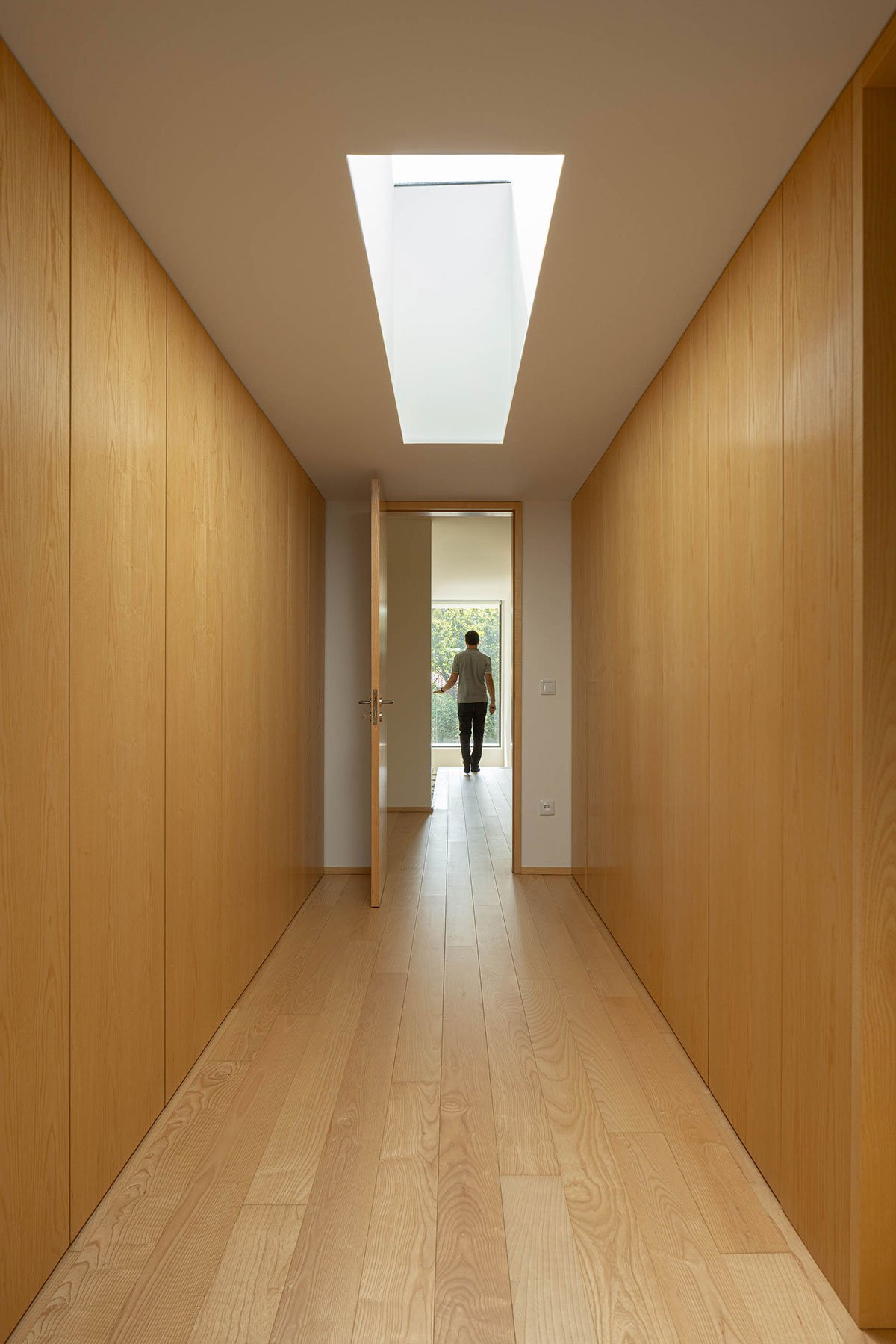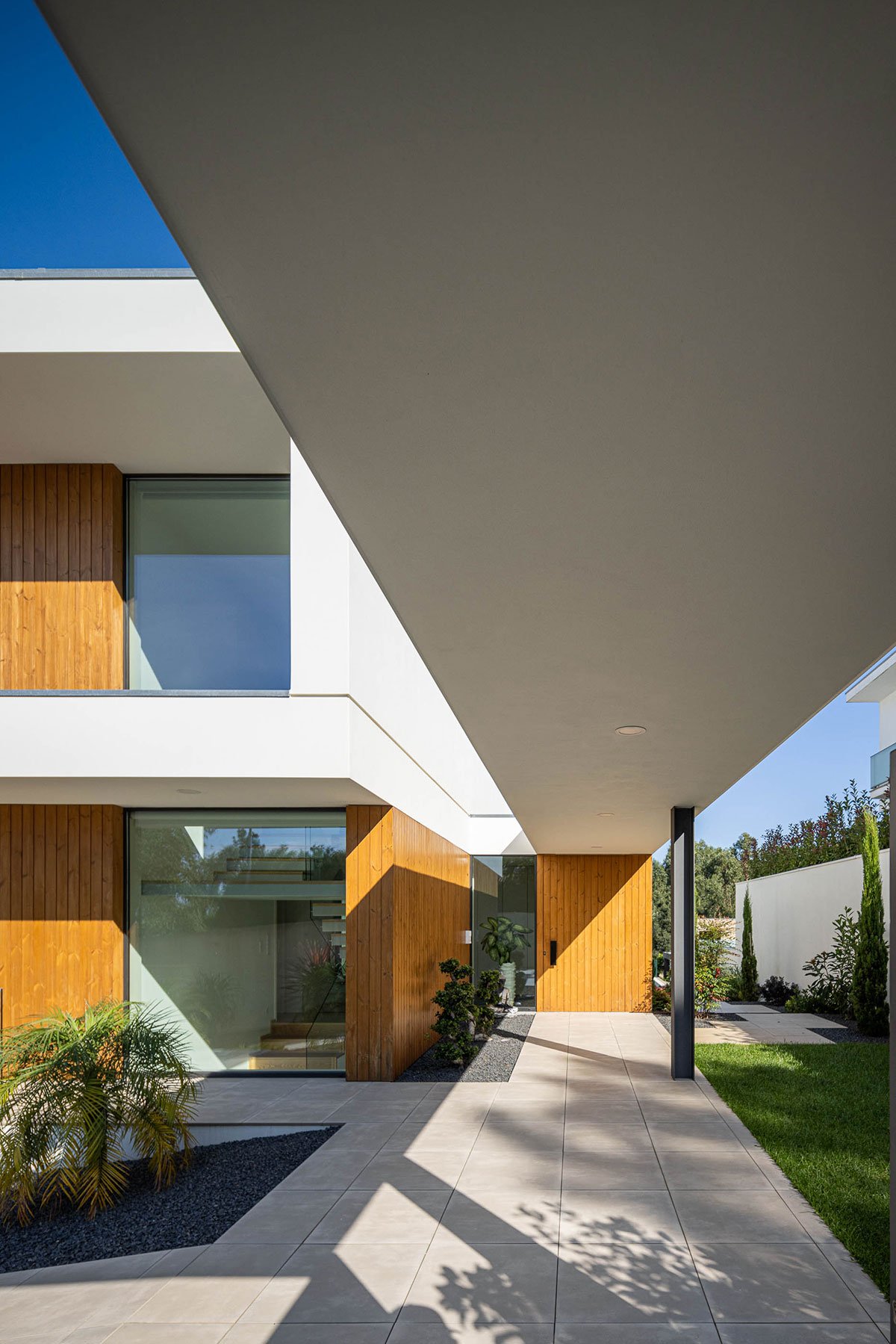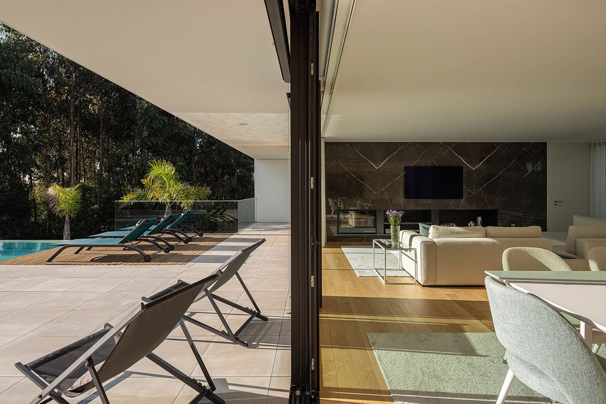 Excerpt: Casa J.M.C., a residence designed by Atelier d’Arquitectura Lopes da Costa, is situated on a triangular plot with a steep slope that influences its volume and shape. The design creates a dynamic and less compact structure through a uniform, formal structure with consistent volume and materials. The exterior design enhances the visual and functional connection between inside and outside spaces while ensuring privacy.