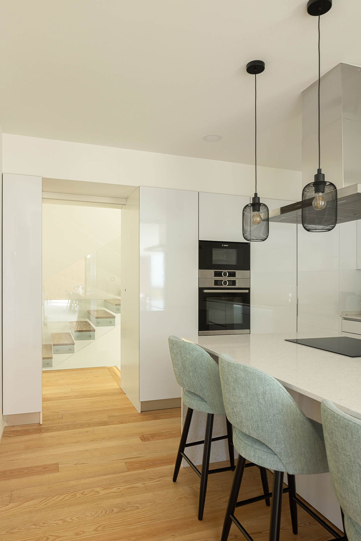 On the first floor, there are three bedrooms, all of which are suites. They are arranged along a corridor that is partially open to a double-height ceiling on the ground floor. The main suite is located to the north, above the bedroom/office on the lower floor, creating a balance between these two floors and the basement floor. The basement contains a garage, pantry, laundry room, bathroom, and multipurpose room that opens onto an East-facing patio. The designers aimed to create a uniform and formal set, with consistent volume and materials that distinguish each floor, resulting in a dynamic and less compact structure.