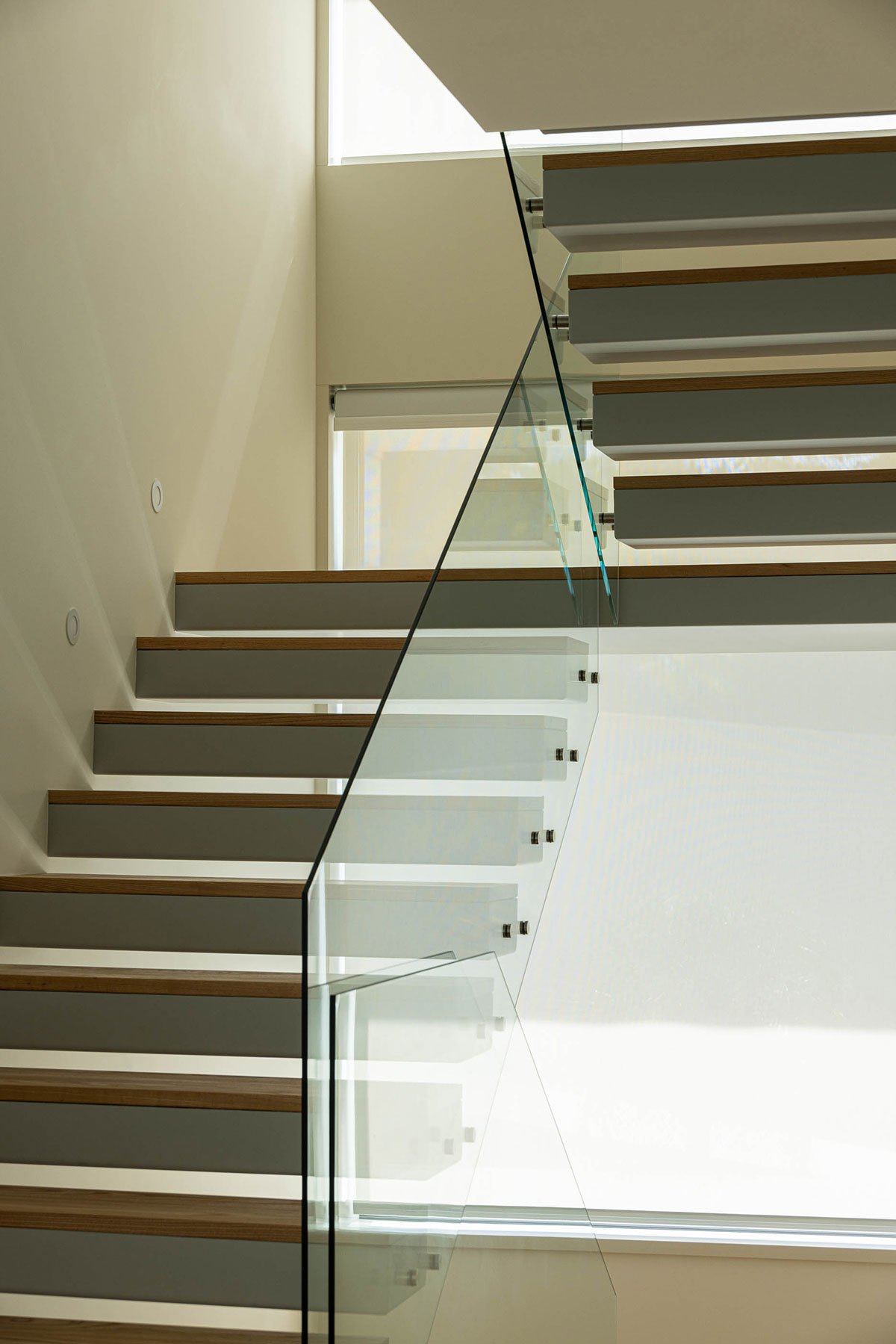 [Text as submitted by architect] The house is situated on a triangular plot with a steep slope along the access street, in the East/West or South/North direction. This has influenced its shape and volume. The construction is positioned at the highest level on the East side, with the house mainly opening to the West. It is distributed over three floors, taking advantage of the slope of the land.