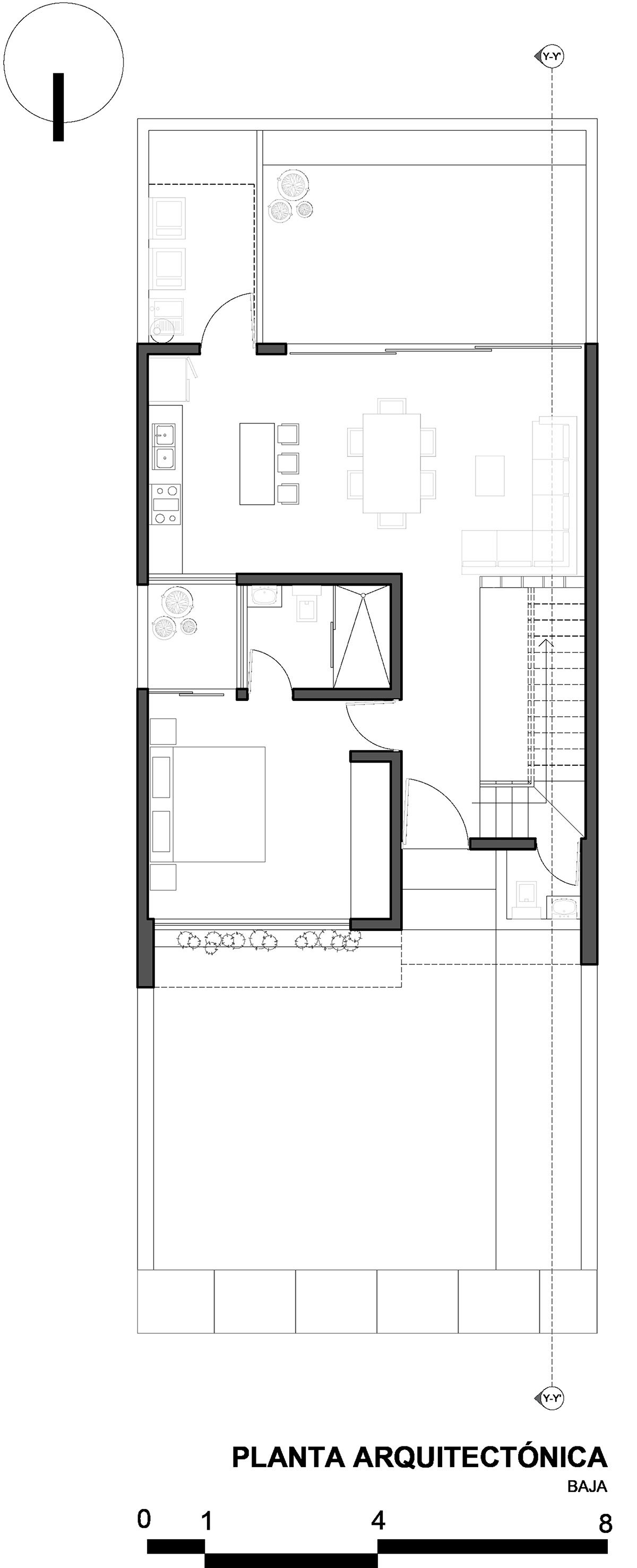 Designed for a small family, the house is situated on an 8.00 x 20.00 m plot. The ground floor includes an open and continuous space integrating the living room, dining room, and kitchen—creating an intimate yet spacious environment. A bedroom with its own bathroom and an internal garden, along with a high-walled courtyard, provide natural lighting and ventilation while ensuring privacy for the residents.