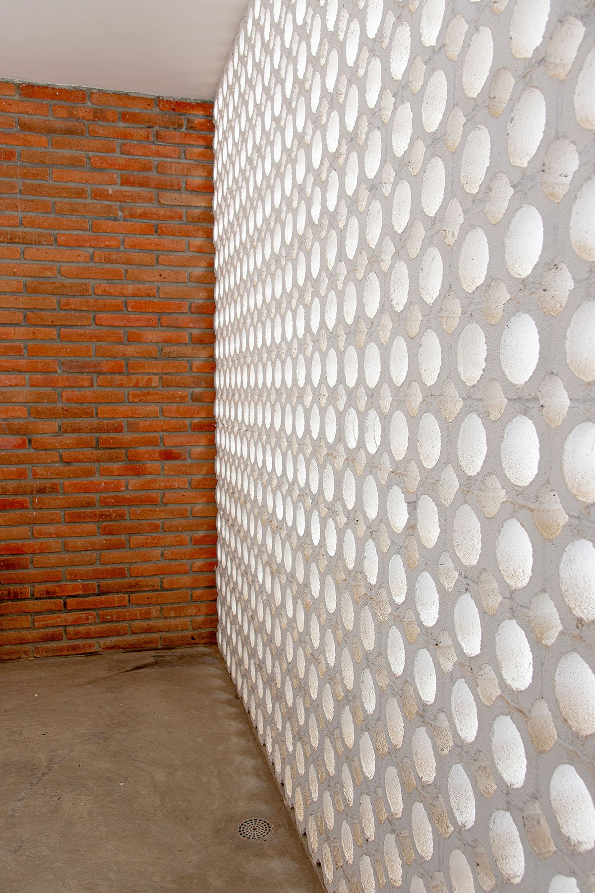 The exposed red brick was handcrafted by local brickmakers and carefully laid by regional workers. A special mold was created to conceal the tie columns and bound beams. This not only enhances the continuous warmth of the brick but also provides exceptional thermal properties. The polished natural-colored concrete floors complement the brick, reinforcing the warm ambiance sought for the project.