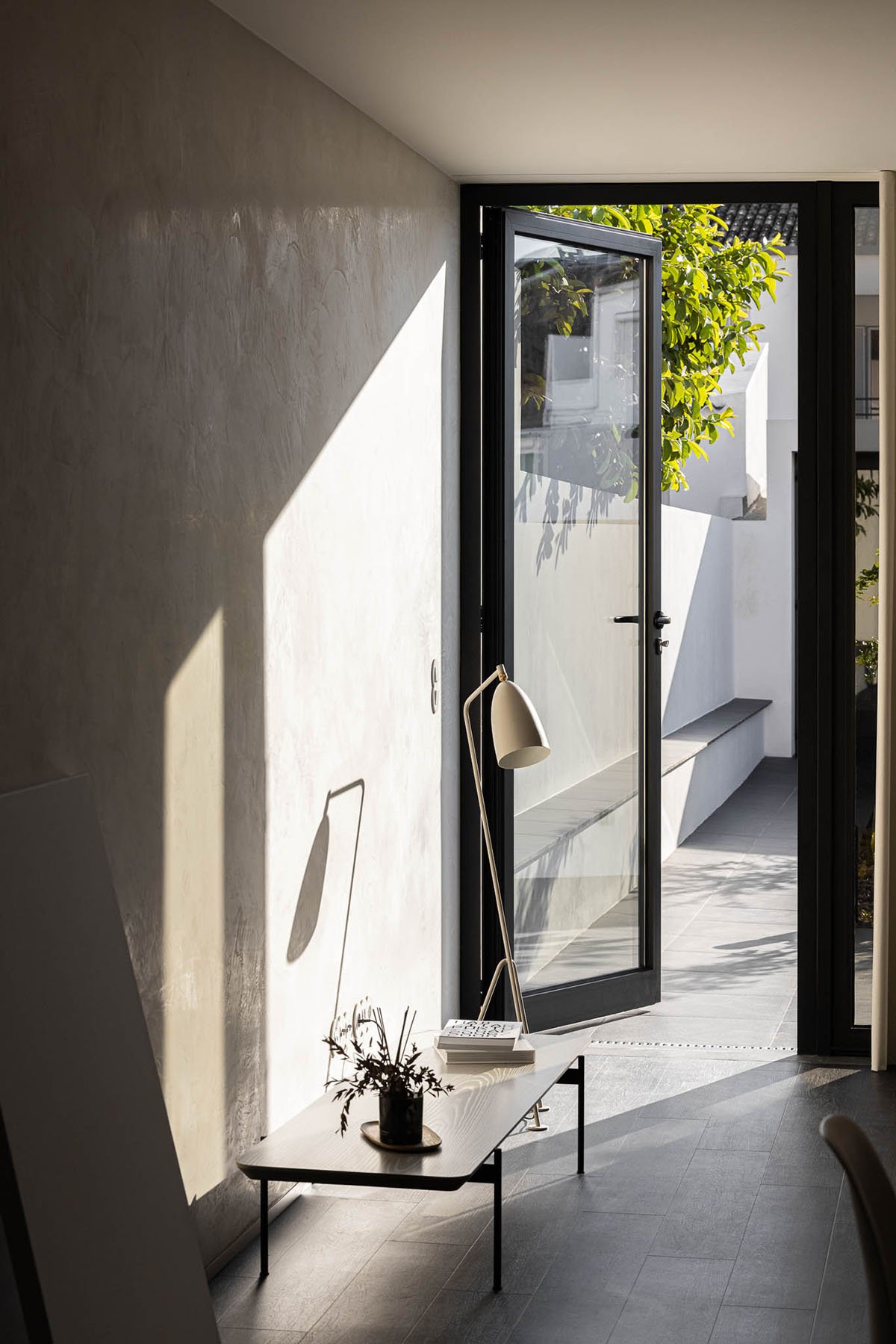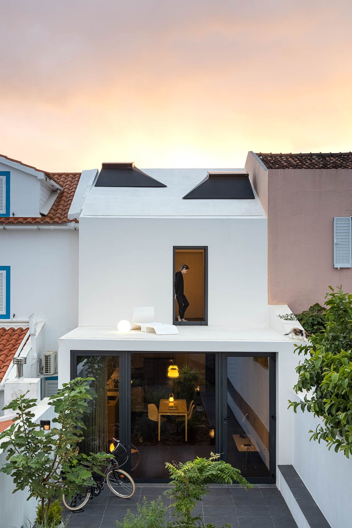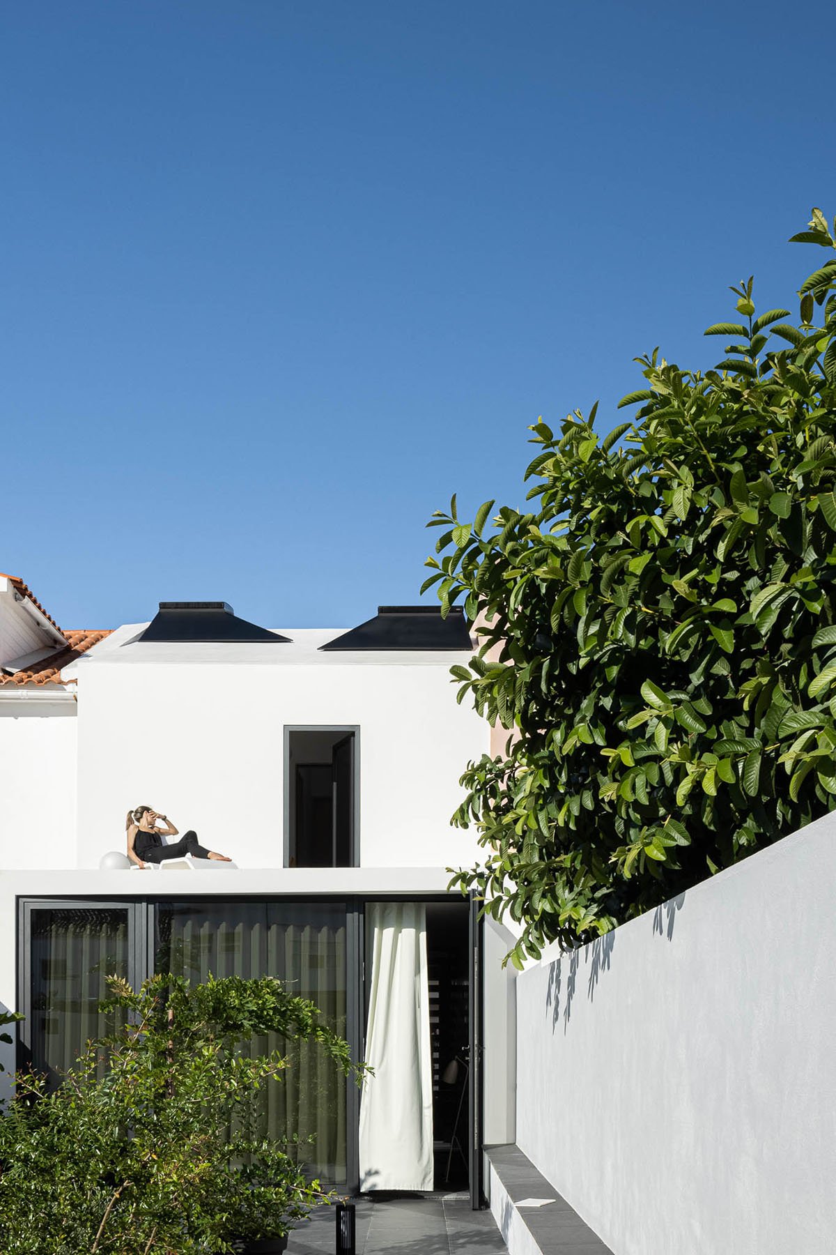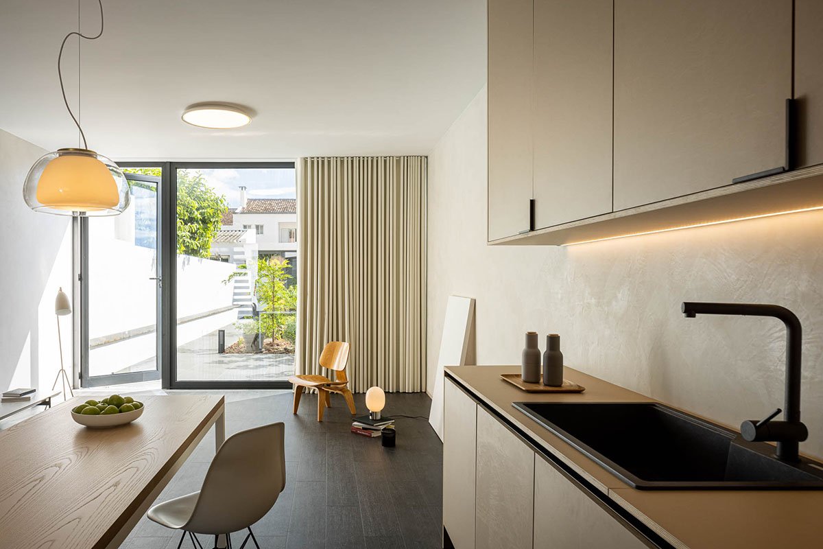 Excerpt: Casa moinho de vento, designed by BOX arquitectos, answers to a program for an extremely small single-family house. The main facade is exclusively the boundary between interior and exterior, with no reason for a relation between both, besides being in its way. The only social space of the house gains dimension in its depth when it finds the garden at the end of the space.