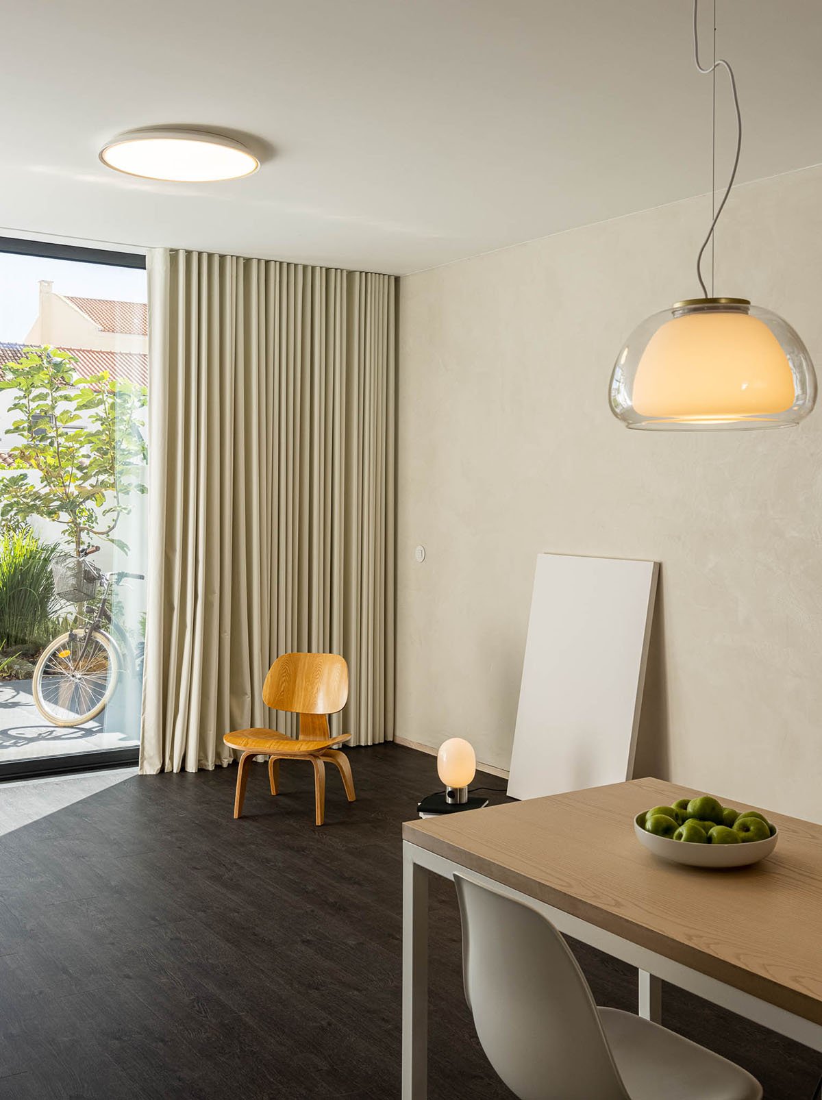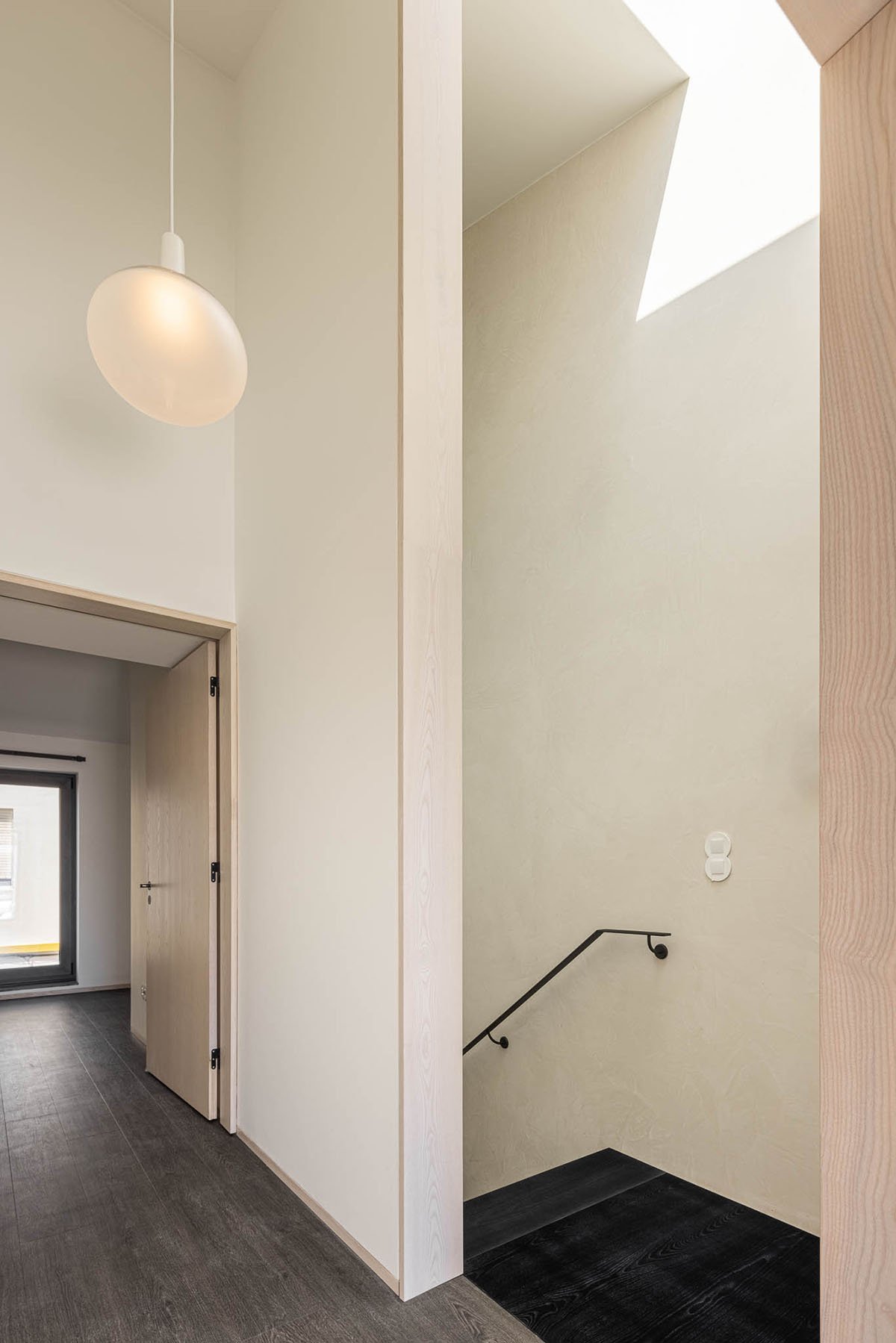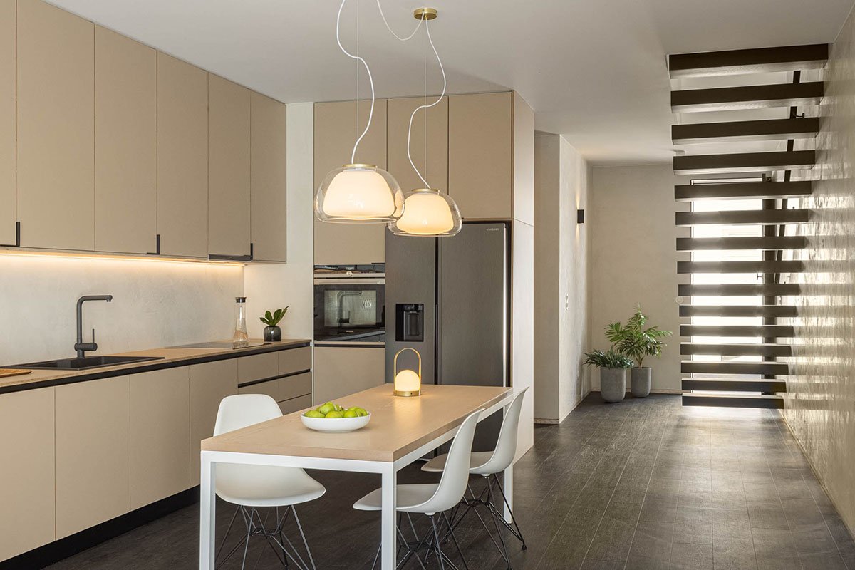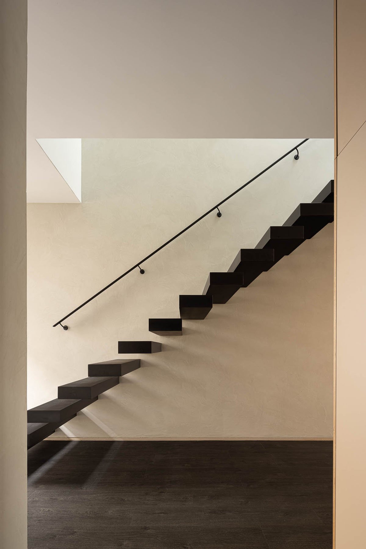 The necessity to simulate a greater spatial amplitude is made possible by the skylights in the pitched roof, which receives the light and spreads it throughout the interior spaces, working as a “diaphragm”, increasing the “vertical perspective”.