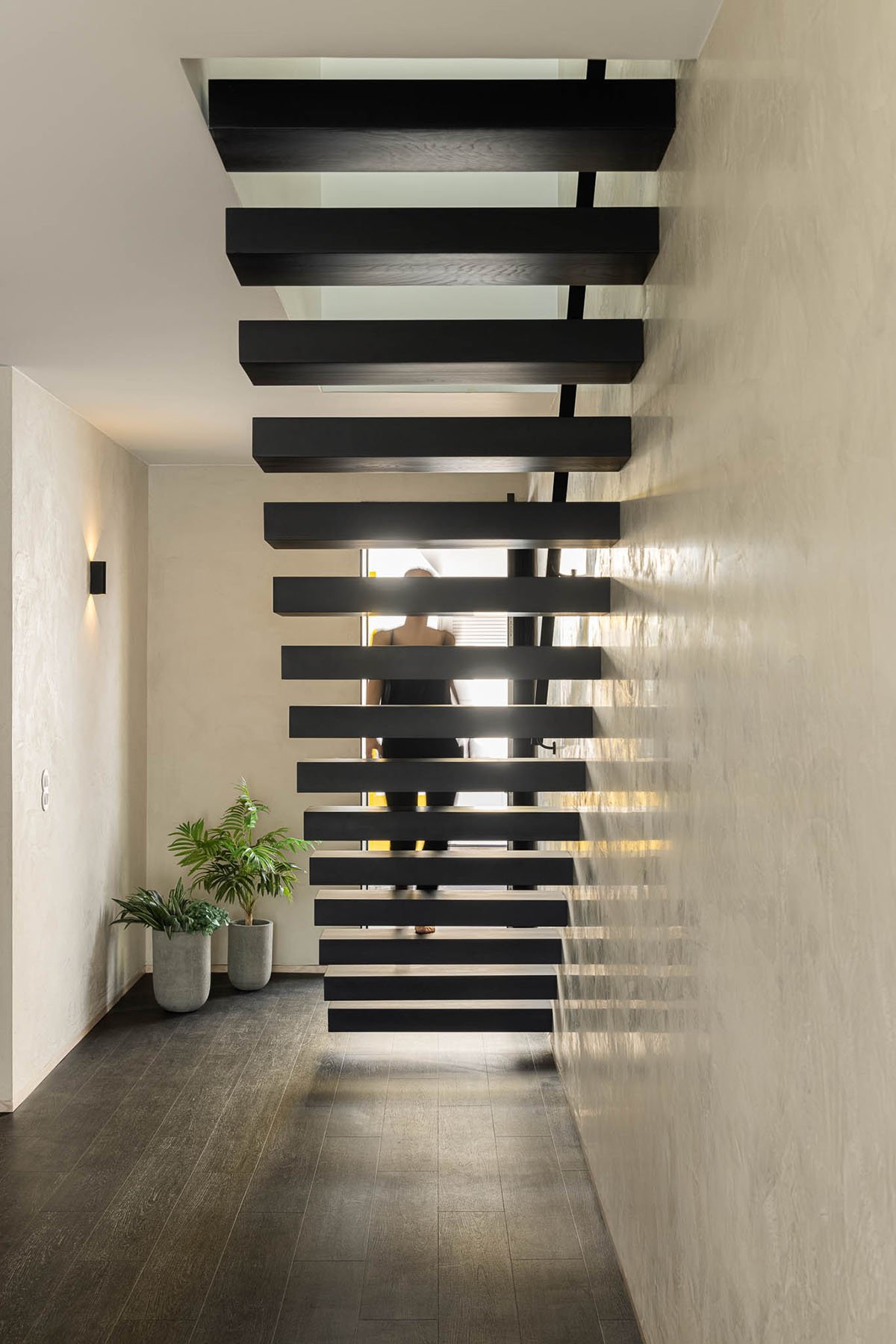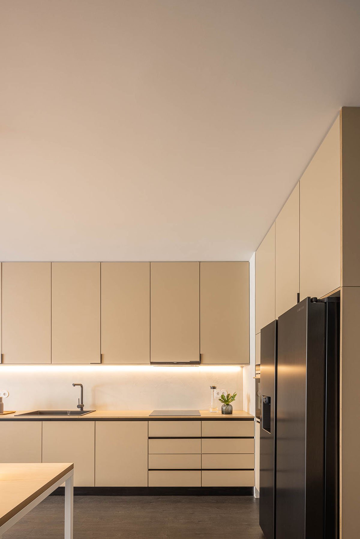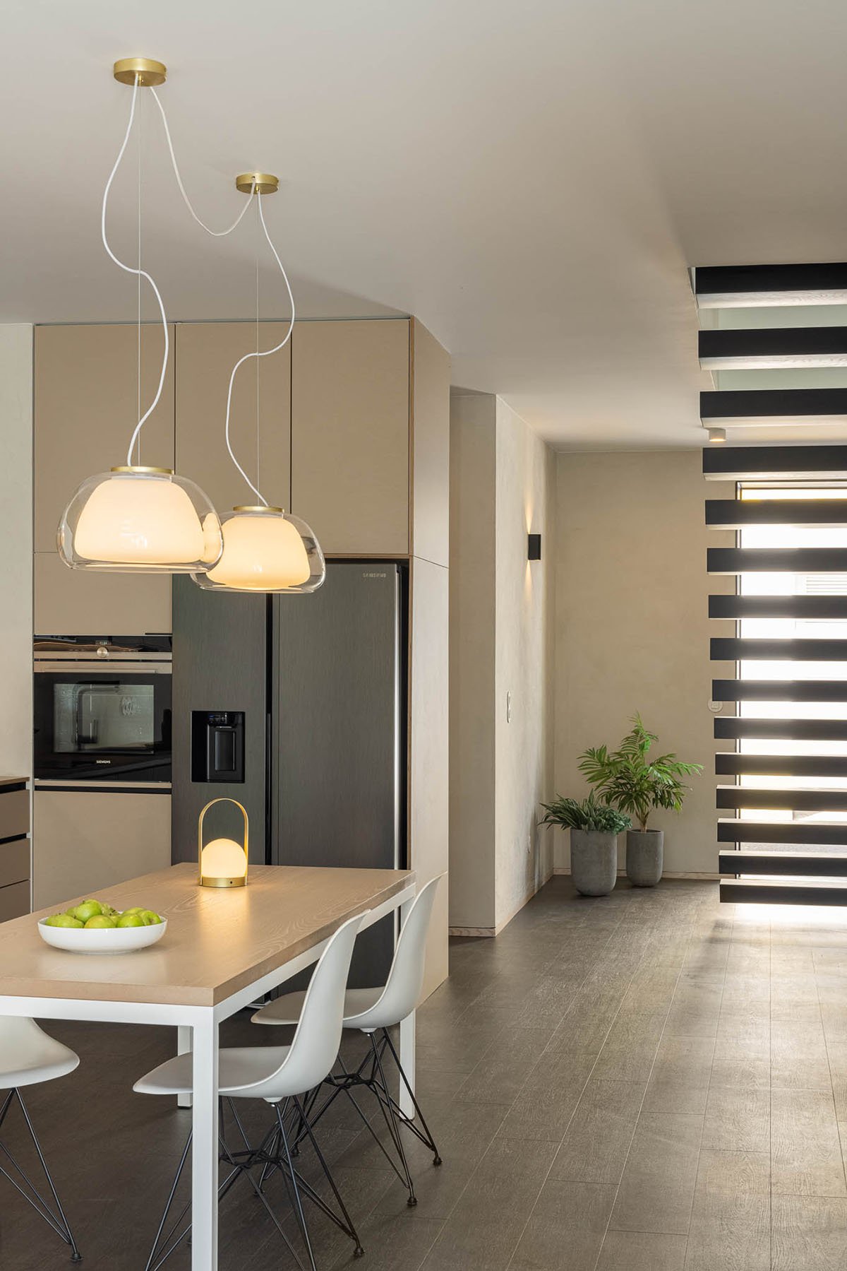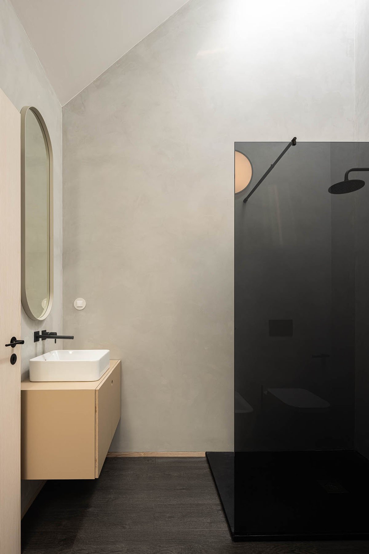 The necessity to simulate a greater spatial amplitude is made possible by the skylights in the pitched roof, which receives the light and spreads it throughout the interior spaces, working as a “diaphragm”, increasing the “vertical perspective”.