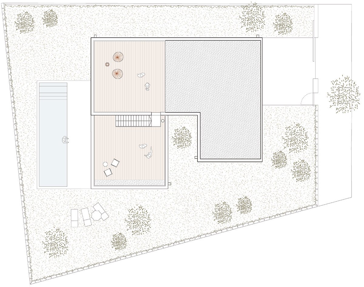 The housing program had to integrate family uses and a professional office, each of which was to have its own exterior access, while also creating an interior connection between the two uses and a separation of the visual connections with the undeveloped spaces of the plot, so that the family areas and the professional zone would neither directly face each other nor share interior-exterior views.