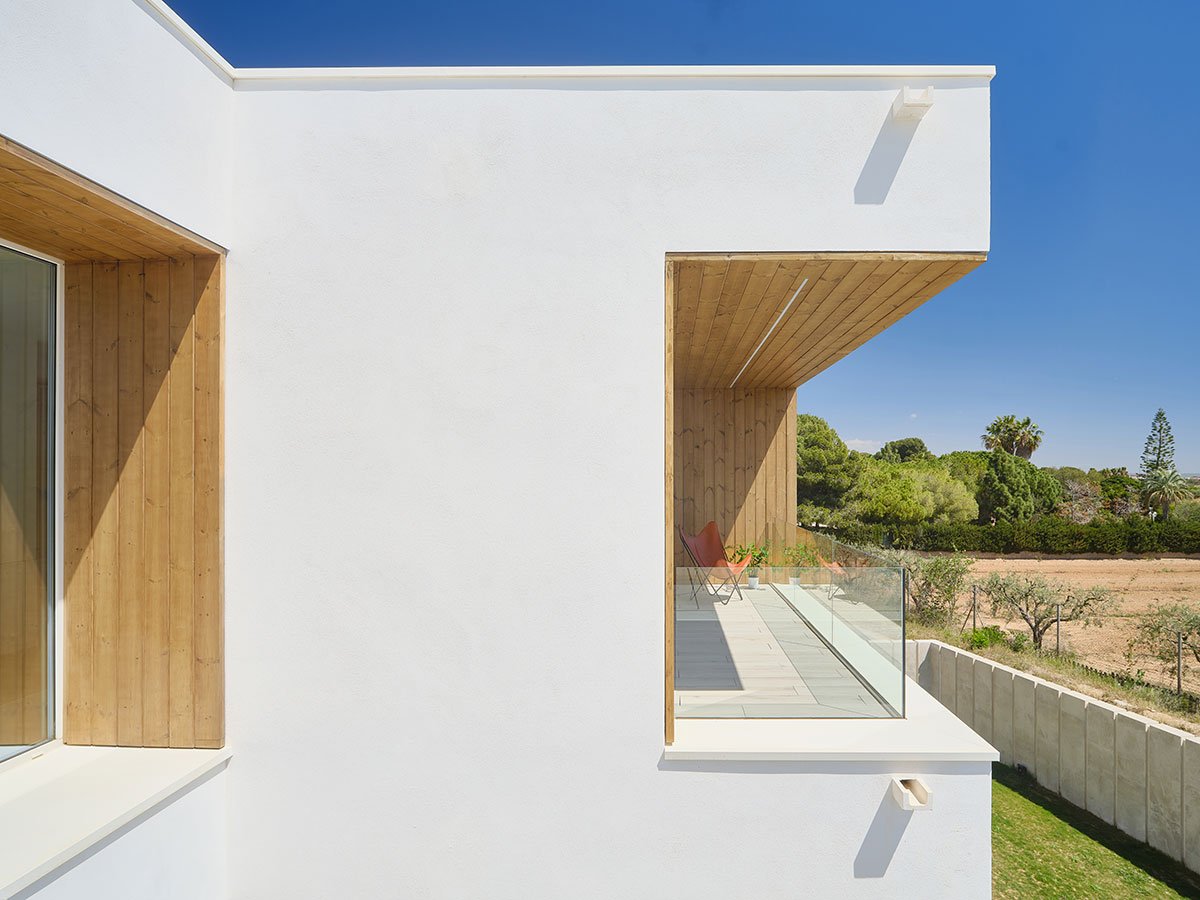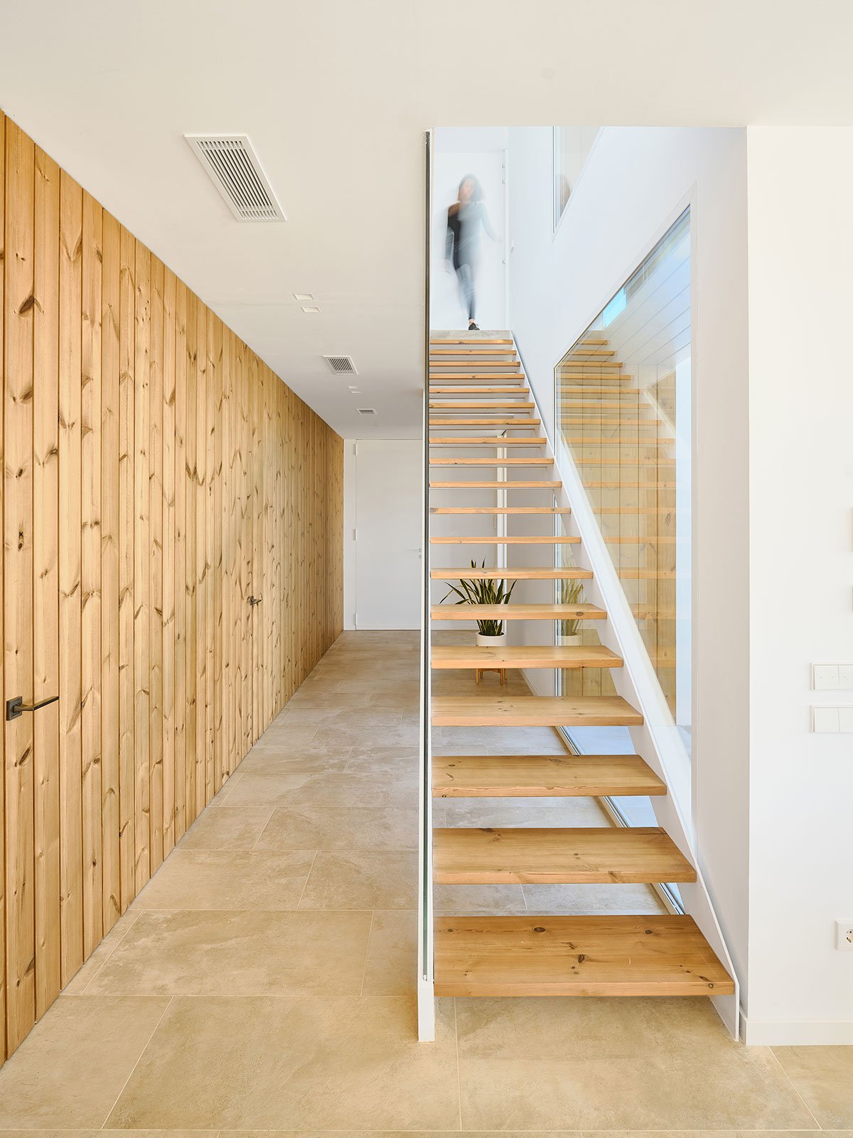 The house organizes its vertical circulation structure through the staircase, which becomes the main feature inside. It is placed in a specific and precise location to ensure that the connection between the two floors occurs at the optimal point, and in a way that it participates in the circulation areas, which have been minimized as much as possible. The housing program is completed with a walkable terrace on the first floor and a second terrace-viewpoint on the roof, from which various characteristic visual landmarks of the surrounding area can be seen, such as the pre-coastal mountain range.