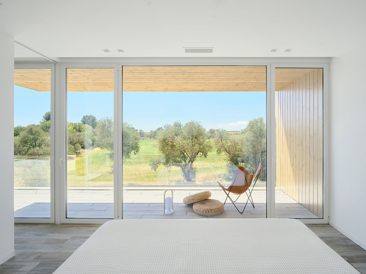 In response to the initial premises and analysis, Casa ON proposes a volumetric layout with four clearly differentiated façades: the two facing the neighbour and the street have a smooth, opaque appearance with minimal and necessary openings, while the two with southeast/southwest orientation aim to frame the surrounding landscape, adopting an organic character and a volumetric arrangement that integrates voids, solids, and various elements of passive solar architecture.