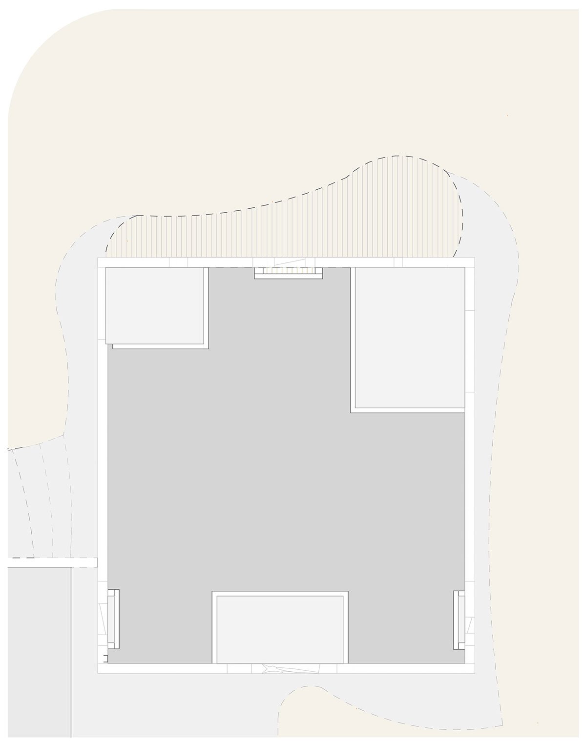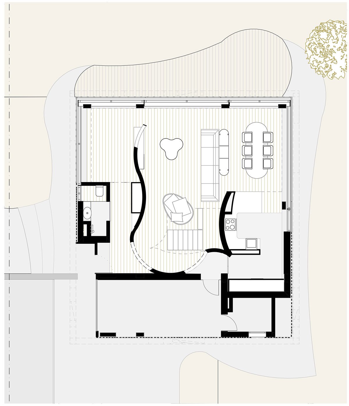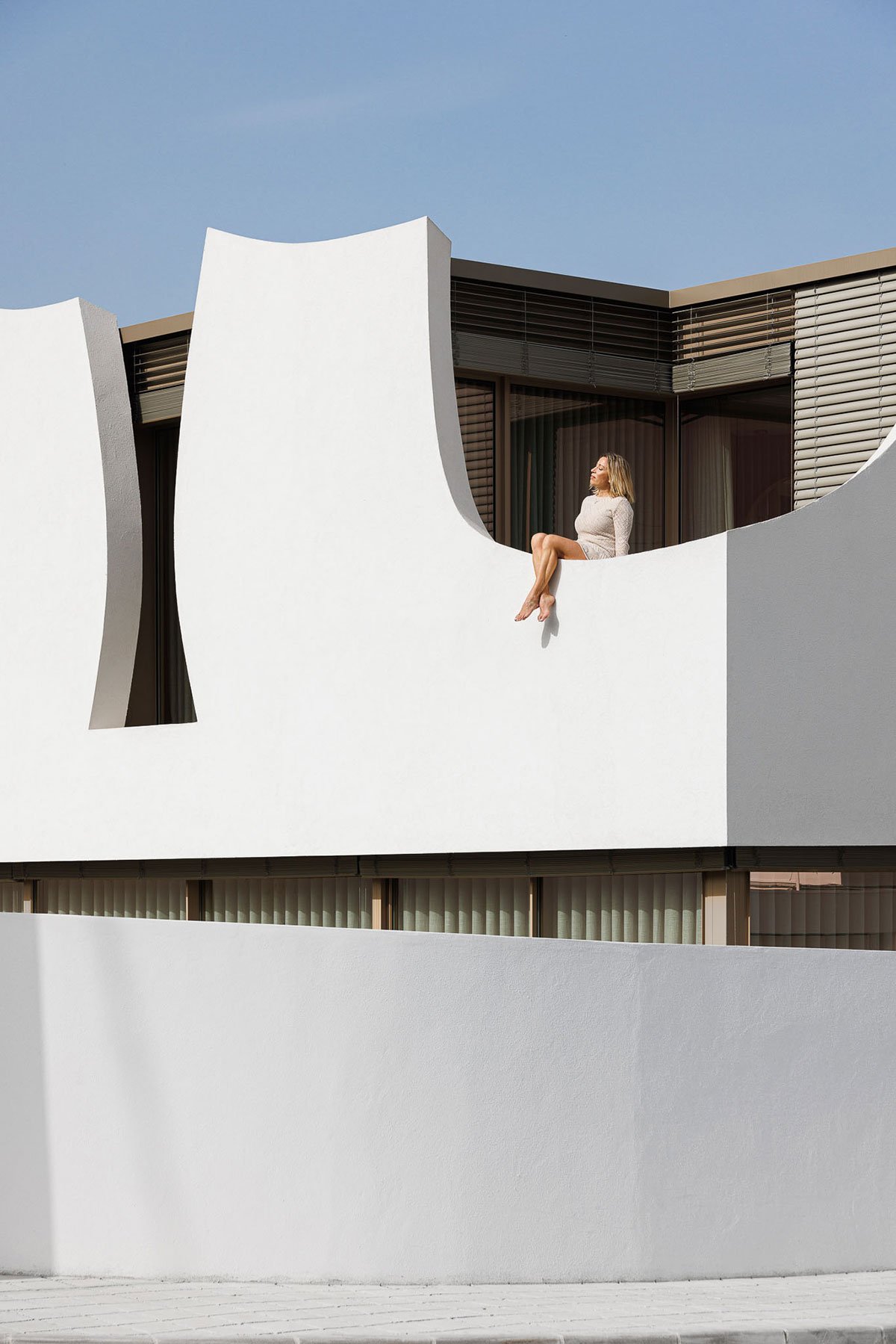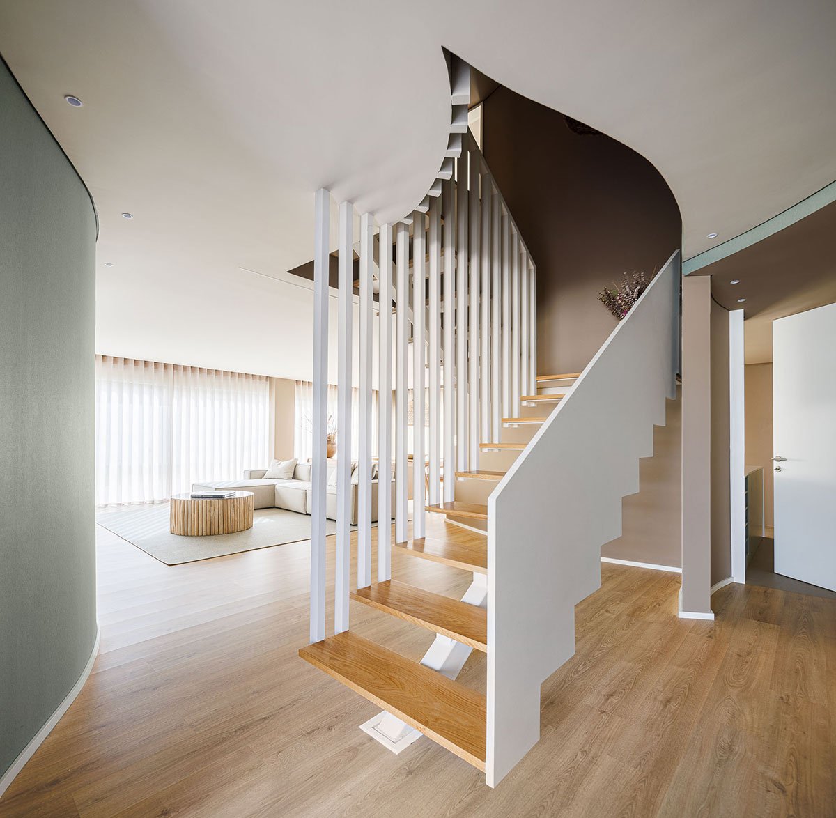 Inside the flower, as already mentioned, a wall with its curves and counter-curves organizes, creates transitions, directs… or not… to the different spaces that appear… Fluid, we connect from space to space, visually or physically… A floor developed in an “open space” concept but with its own moments that give them autonomy and privacy. Stairs define the heart of the home. And it is here that continuity is felt from one floor to another, from the sinuous, curved, structural wall. Three suites lie ahead. Each one communicates with its patio that, with its rose petals, snuggles us.
