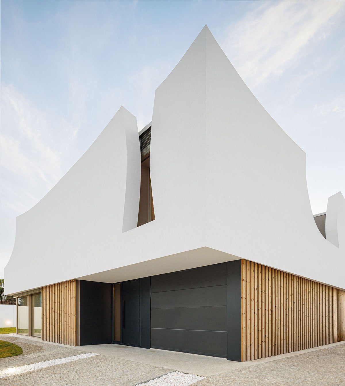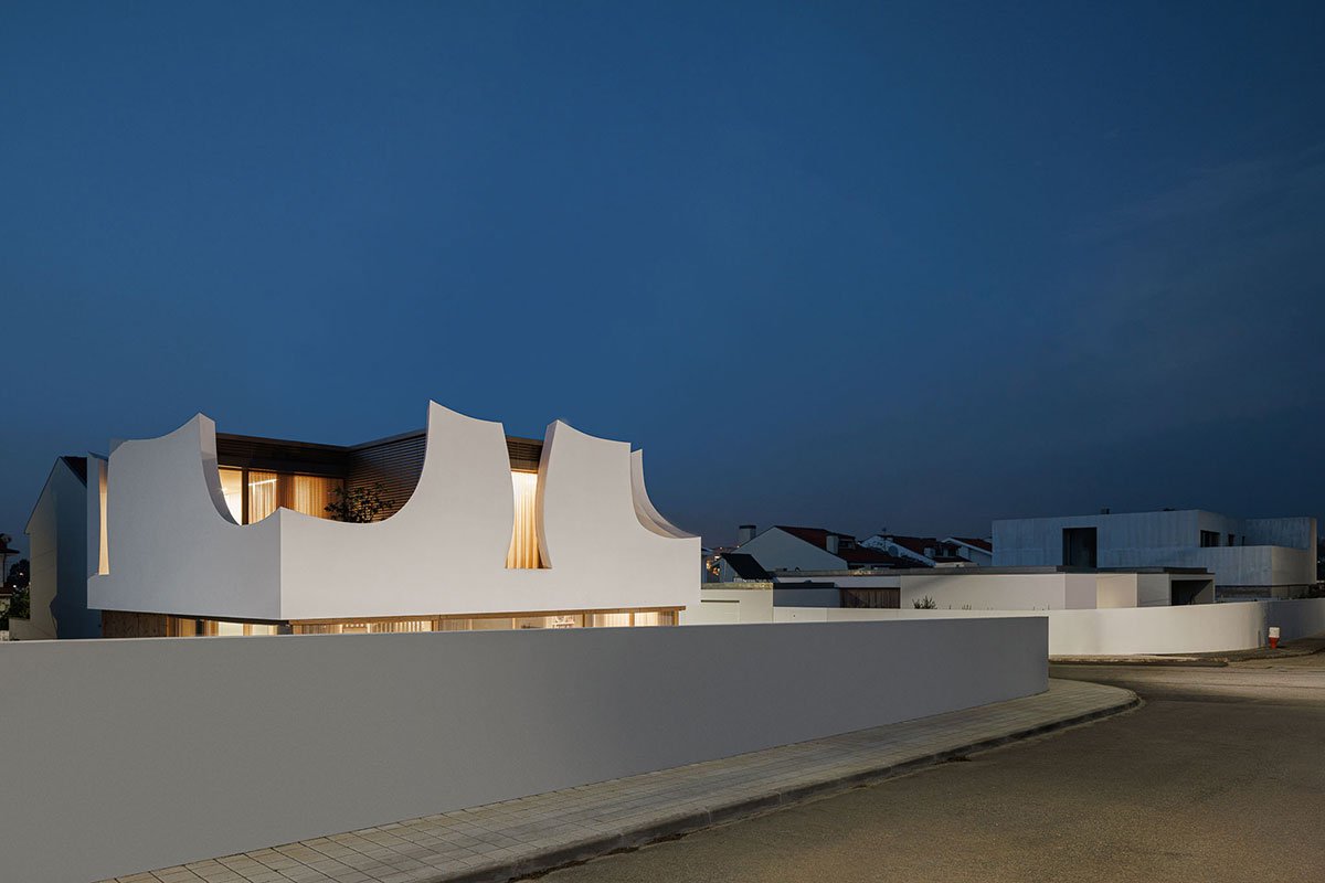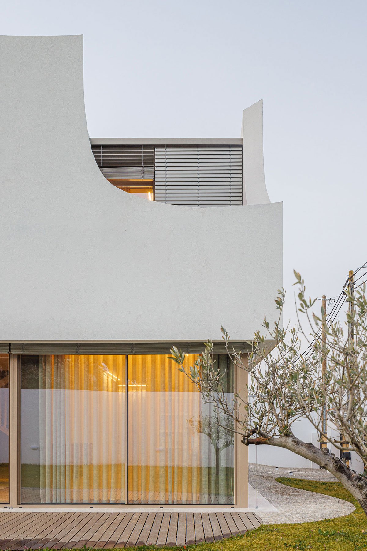 Excerpt: Casa “Pátios de Pétalas”, designed by Sandra Micaela Casinha Atelier, uses three major materials: White, which draws the petals, aluminium and glass. A wall with its curves and counter-curves creates transitions to the different spaces in the interior.