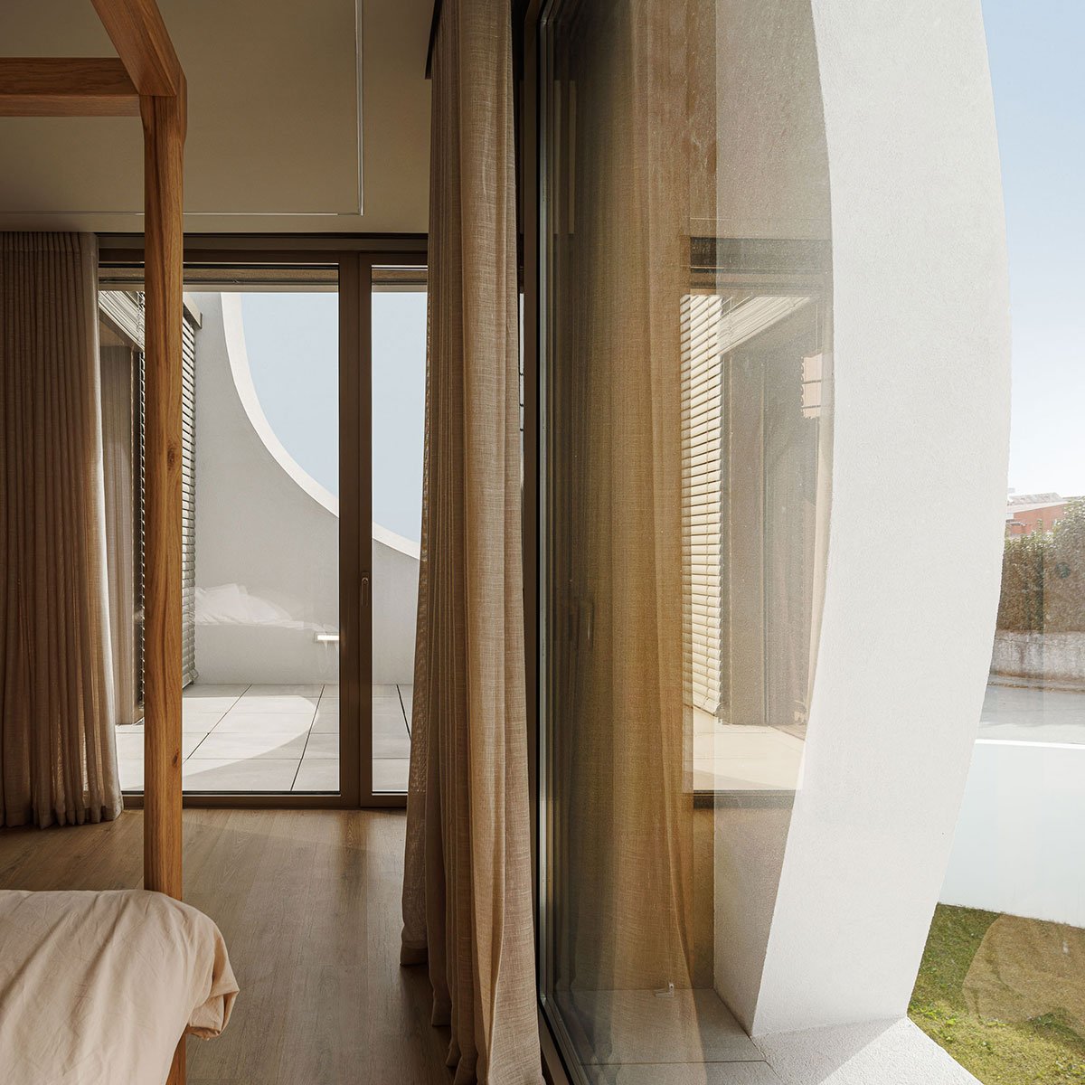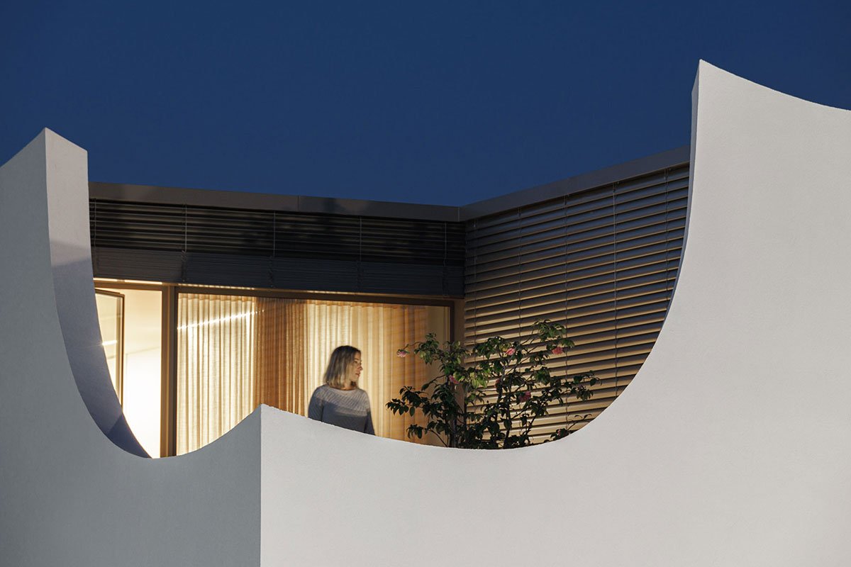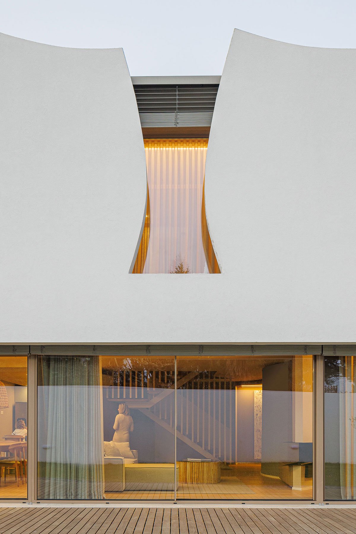 Excerpt: Casa “Pátios de Pétalas”, designed by Sandra Micaela Casinha Atelier, uses three major materials: White, which draws the petals, aluminium and glass. A wall with its curves and counter-curves creates transitions to the different spaces in the interior.