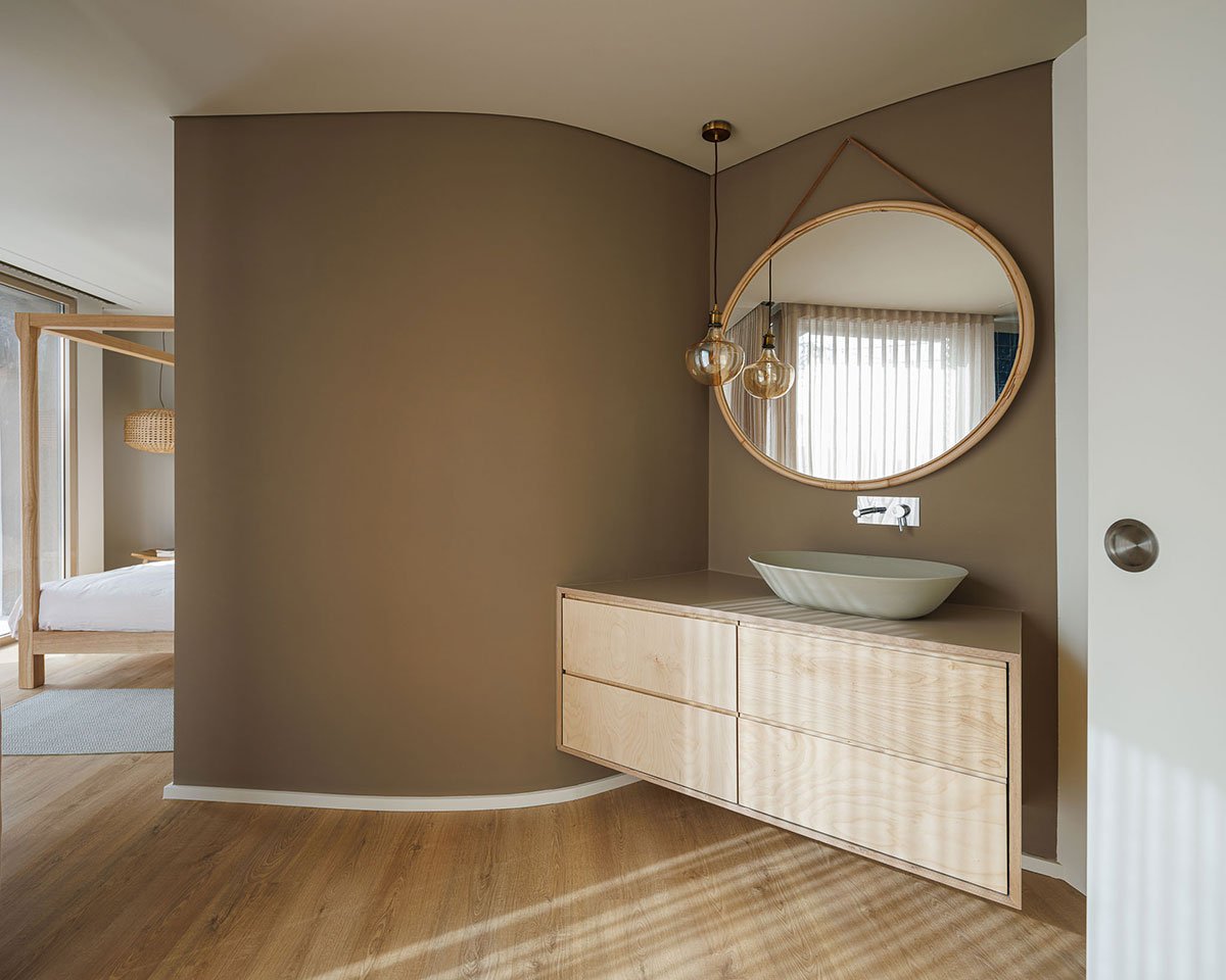 In the decoration, you can feel the palette of pastel and “raw” colours used in architecture. Furniture that enhances the tranquillity of the place, casual comfort, natural materials, and simplicity. For this, we use textiles and neutral colours and from time to time you can see pastel green on the chairs, which emphasises the colour of the kitchen furniture and the wallpaper in the living room.