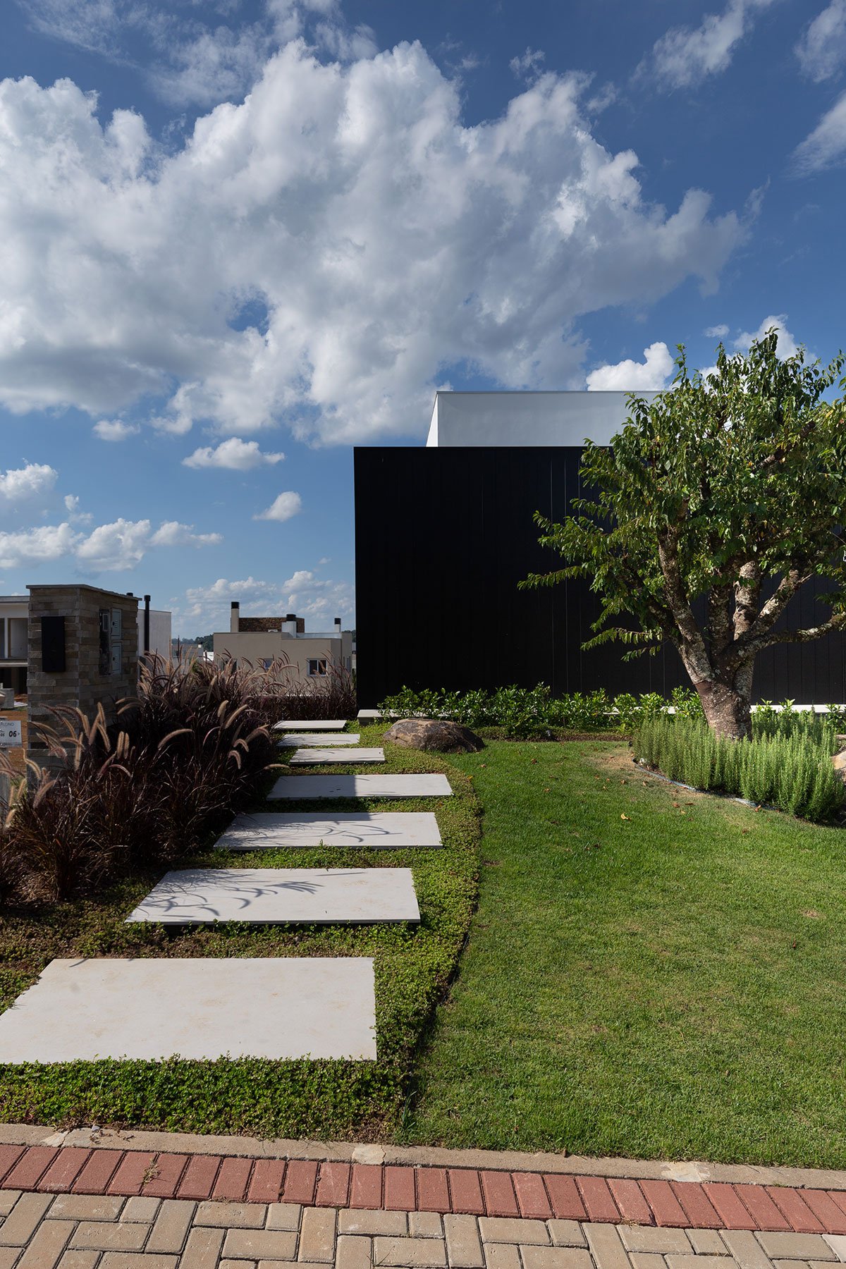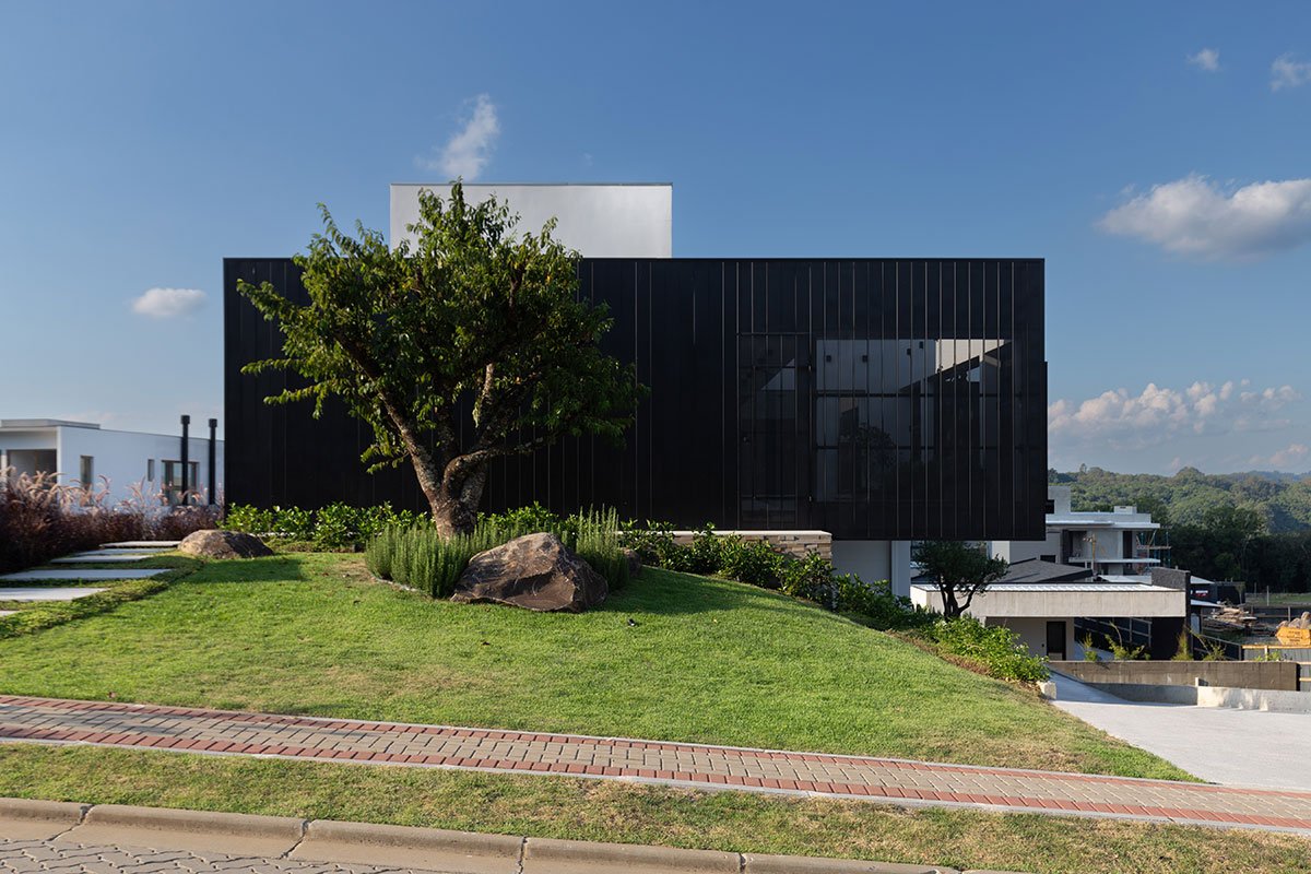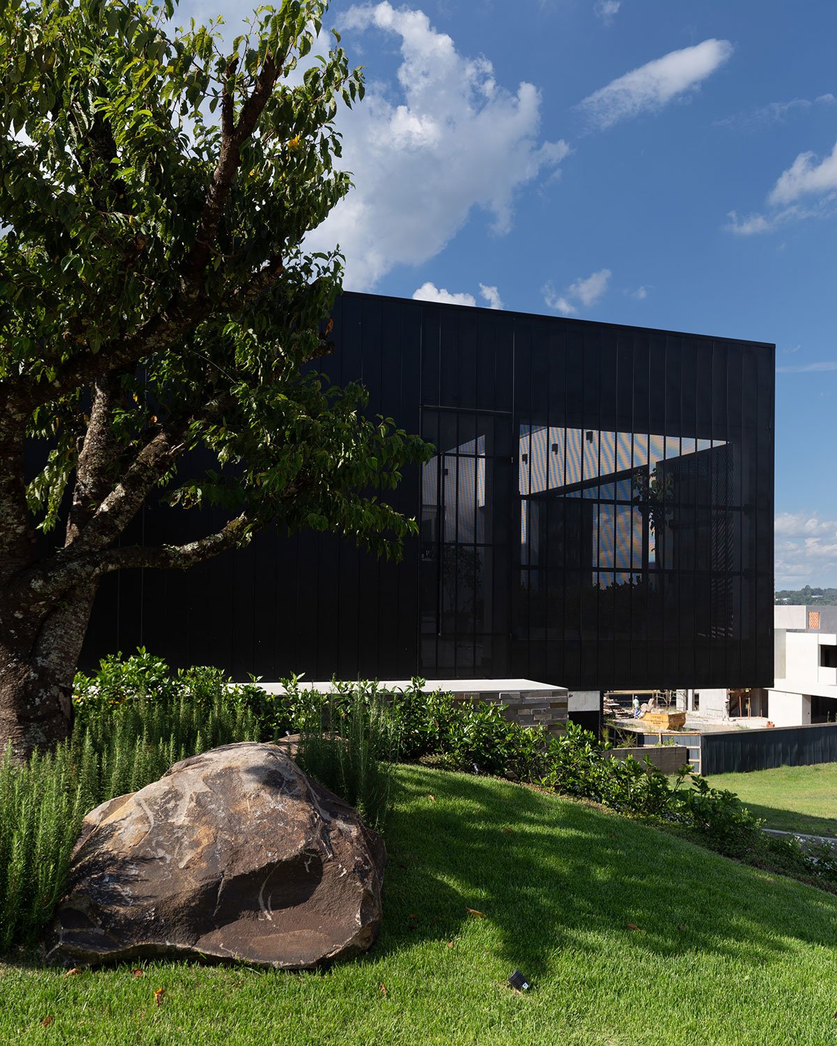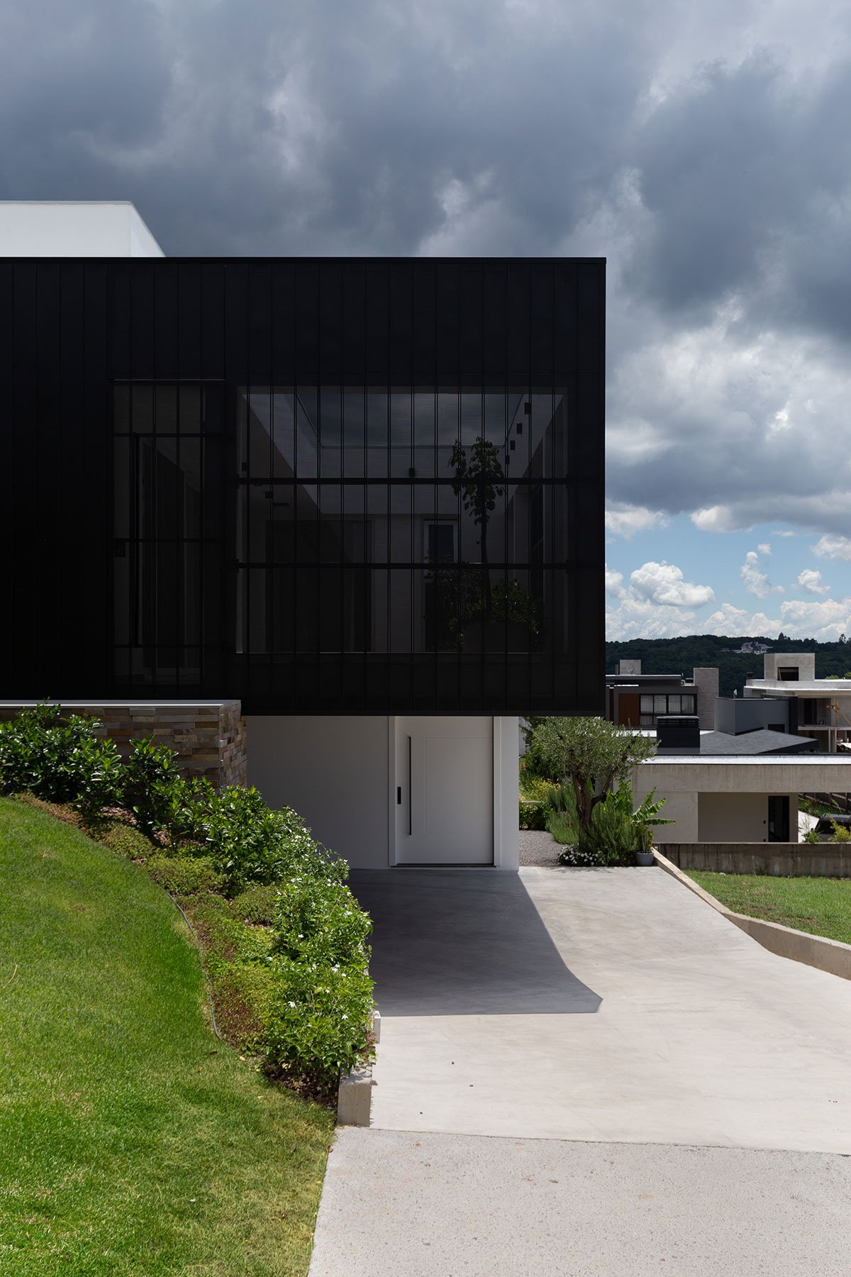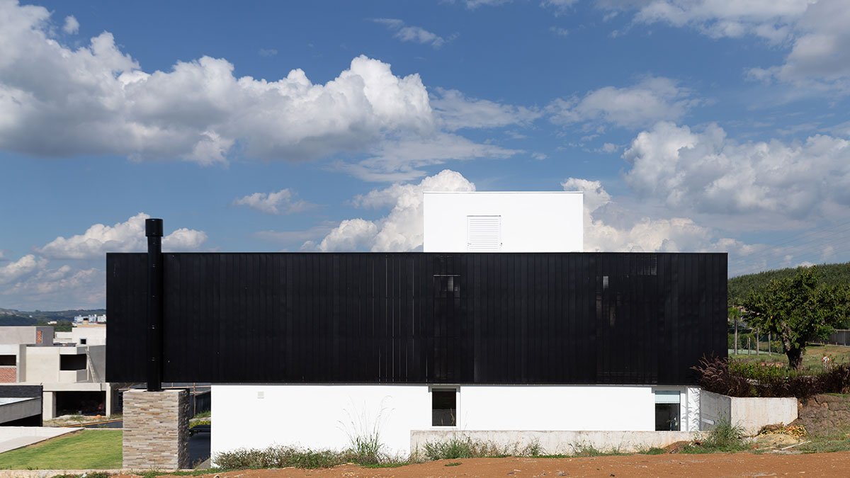 The need for privacy was a starting point of the project. Sobriety in the openings and a game of planes and volumes that protect the resident and create a reserved atmosphere. The house is a monolithic block carved and covered by light cladding. It is a rectangular volume over another pure geometric prism. Portions were extracted from the volumes that create spaces for use. Contained terraces, balconies, open balconies, gardens, balcony and garage. These extractions create spaces for ventilation, recreation, contemplation and car shelter. The upper volume, entirely covered in black aluminum, accommodates the roof for the balcony and garage. The monolithic aspect of the house with subtractions and large blind panels create silent facades that are parallel to the ground, forming screens. Black and white screens.