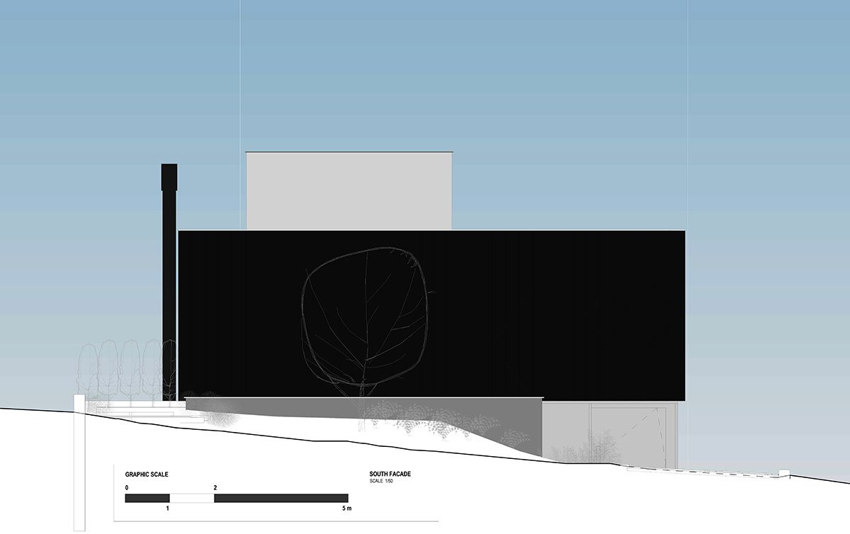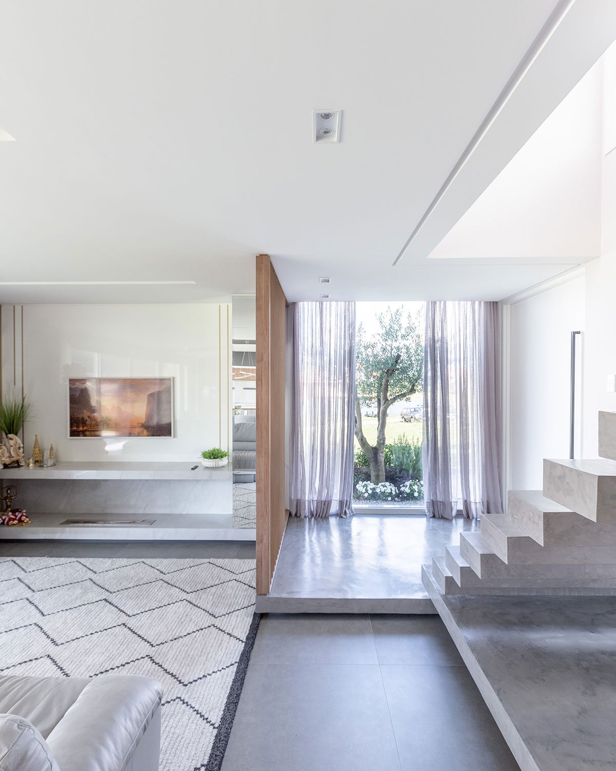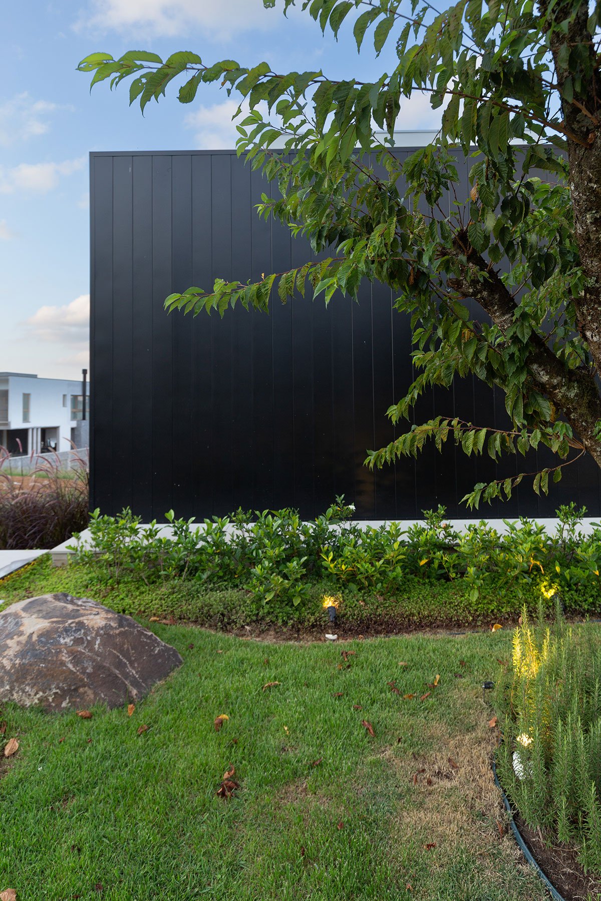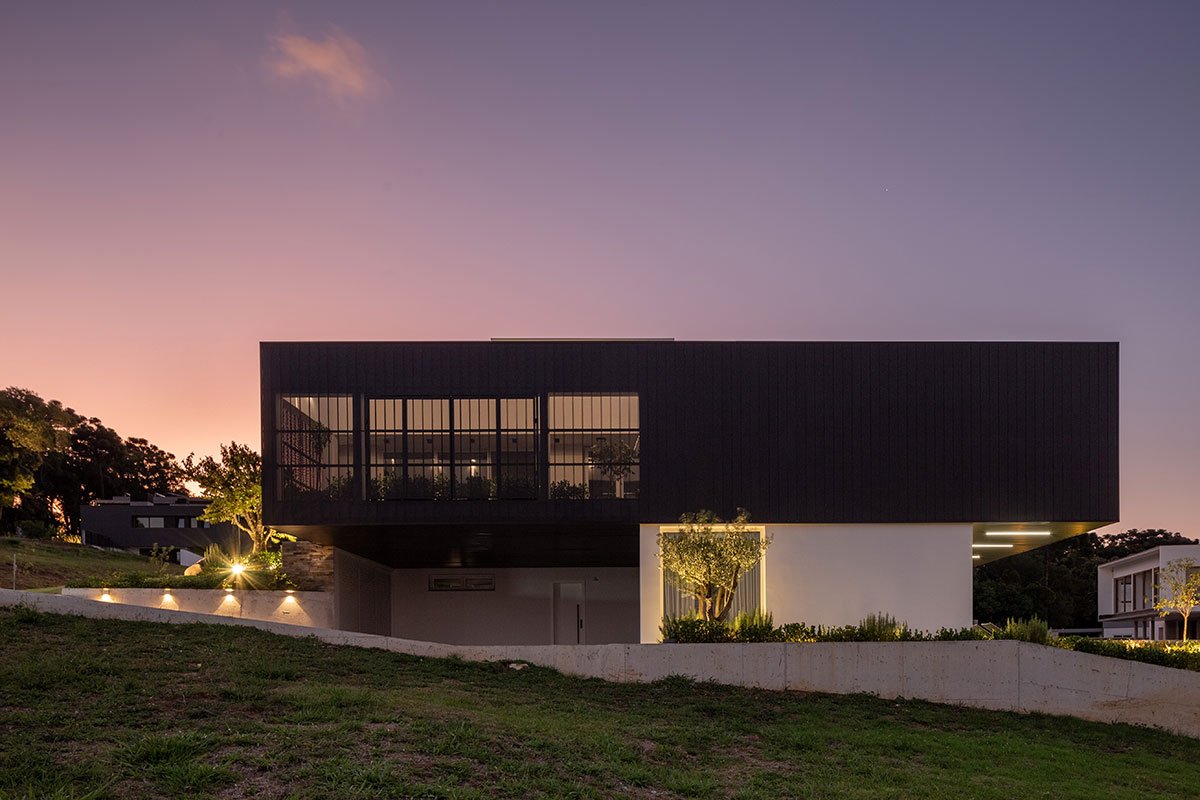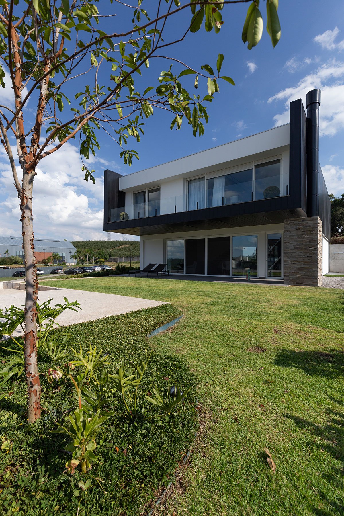 The need for privacy was a starting point of the project. Sobriety in the openings and a game of planes and volumes that protect the resident and create a reserved atmosphere. The house is a monolithic block carved and covered by light cladding. It is a rectangular volume over another pure geometric prism. Portions were extracted from the volumes that create spaces for use. Contained terraces, balconies, open balconies, gardens, balcony and garage. These extractions create spaces for ventilation, recreation, contemplation and car shelter. The upper volume, entirely covered in black aluminum, accommodates the roof for the balcony and garage. The monolithic aspect of the house with subtractions and large blind panels create silent facades that are parallel to the ground, forming screens. Black and white screens.