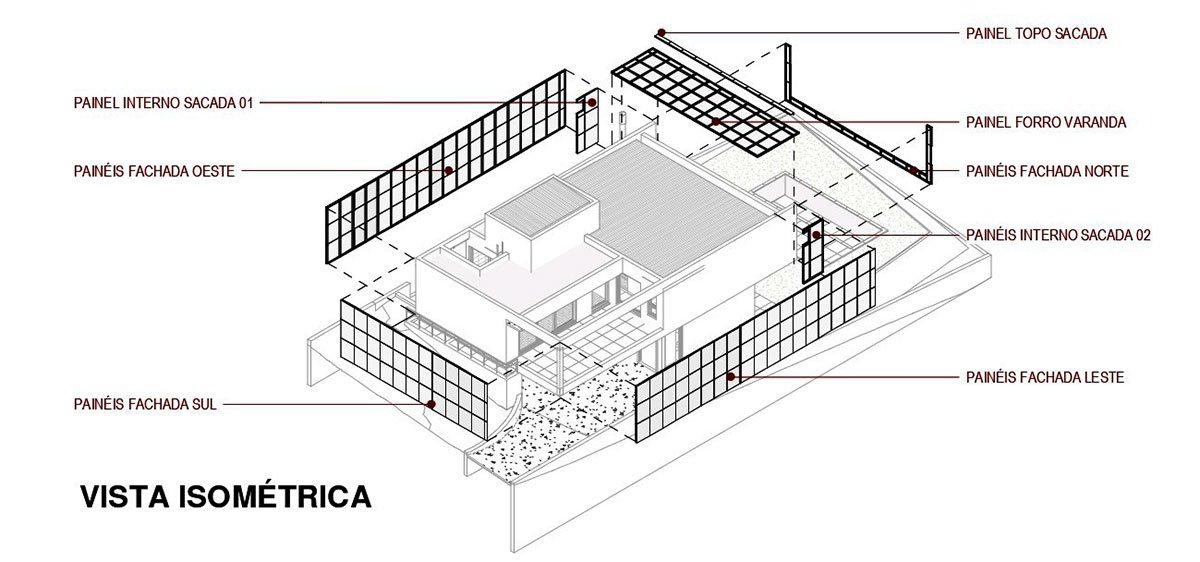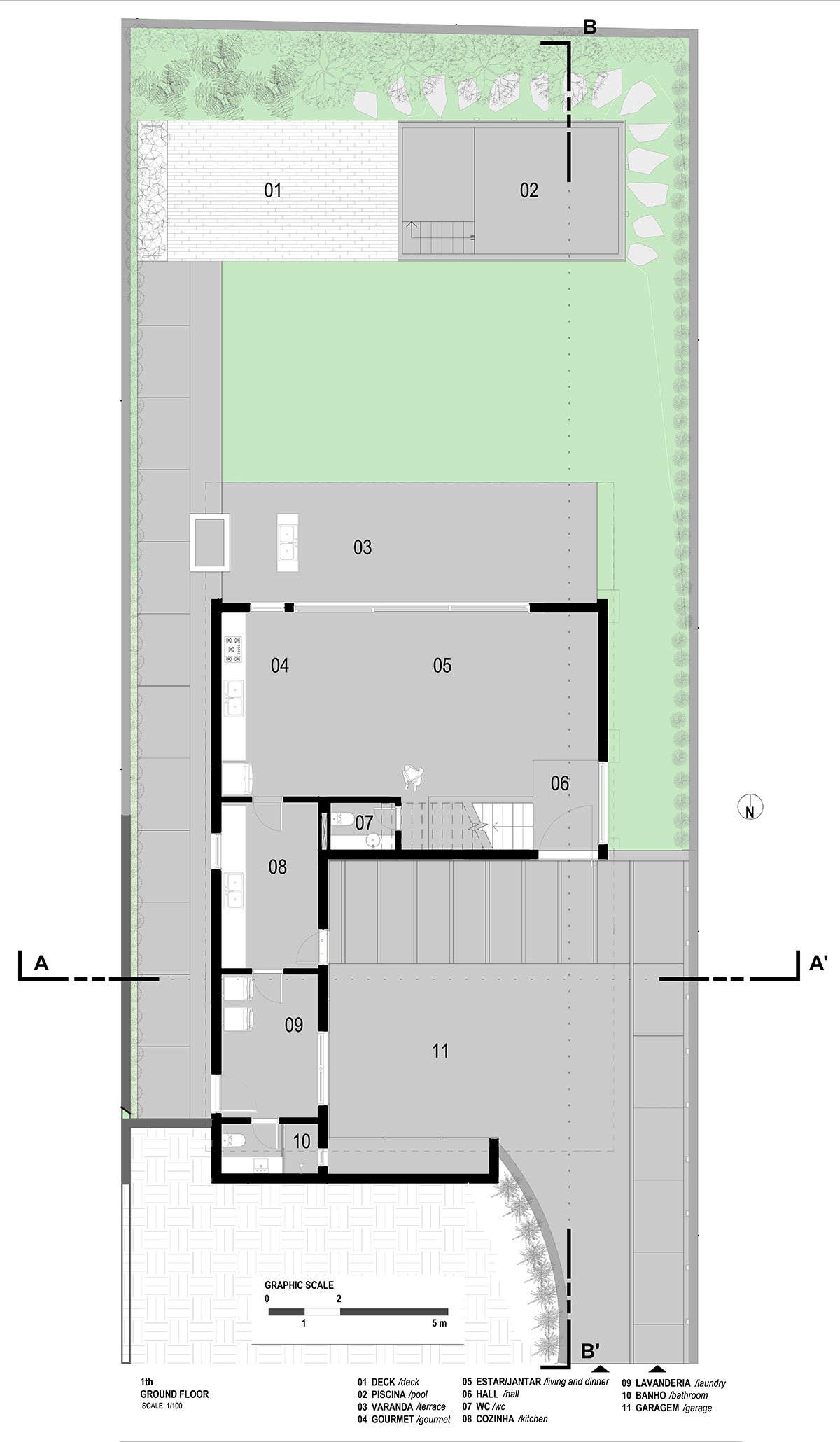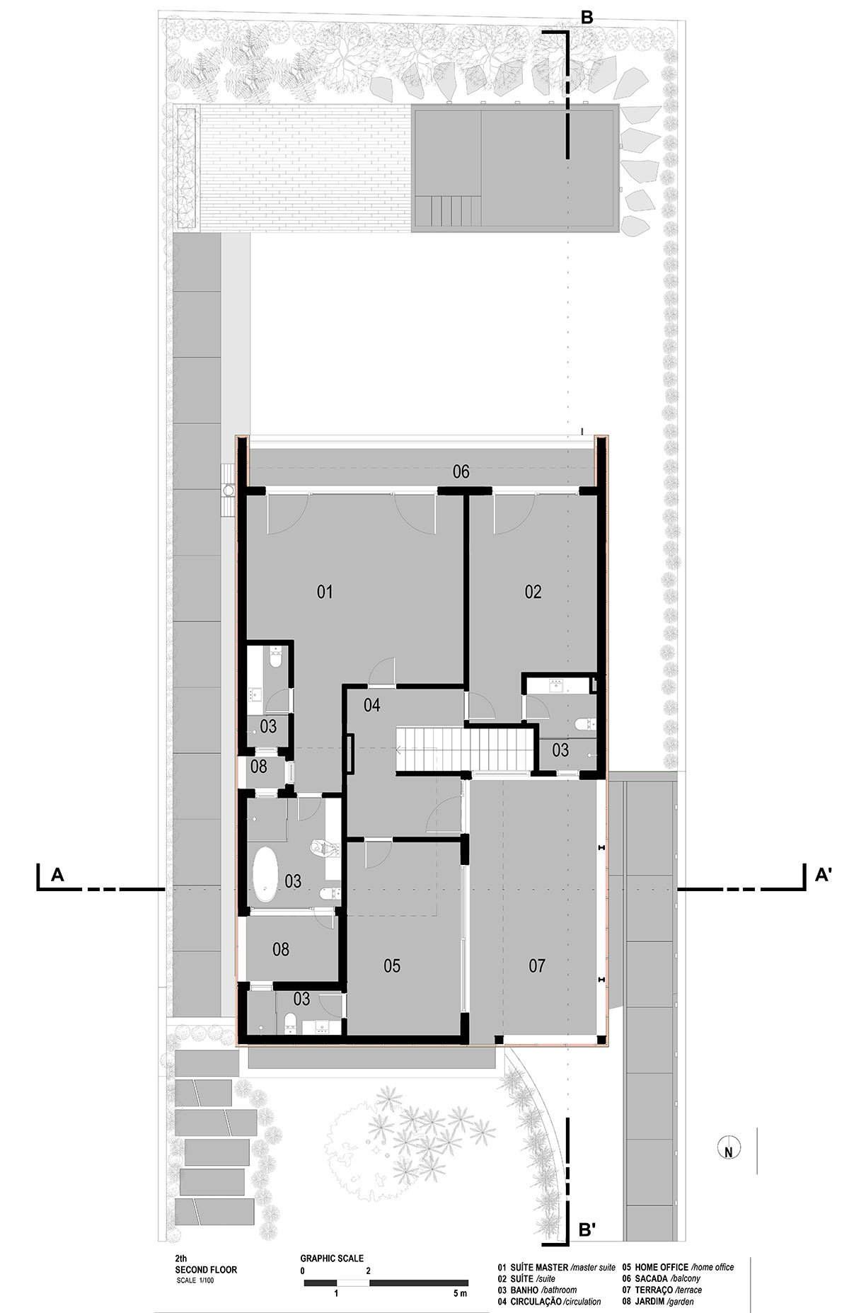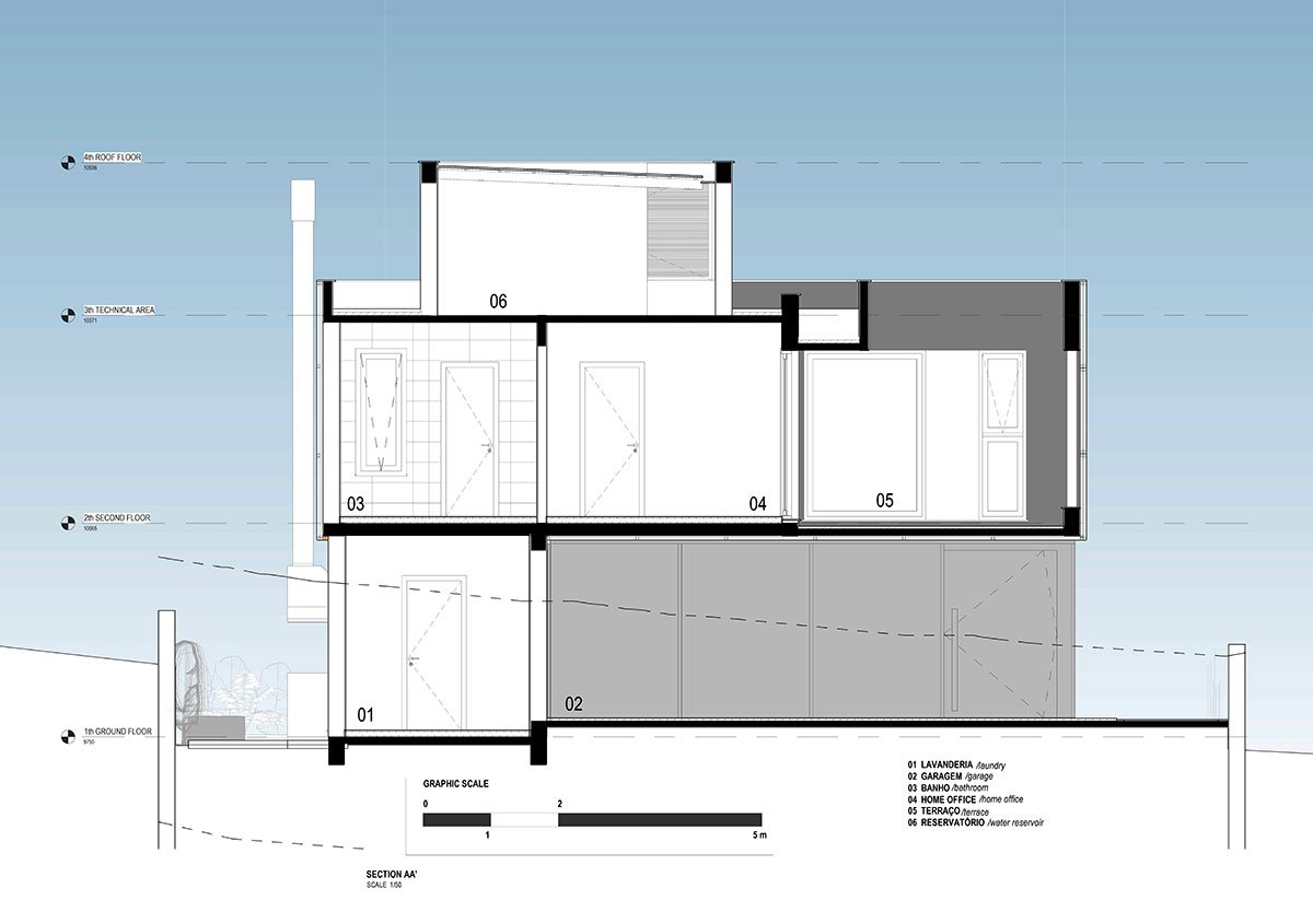 The zoning of the house is organized on two floors, social and intimate. Social at internal courtyard level and intimate at street level. The house appears shy on the land, as if it had been there forever, it barely distorts the natural level of the lot. People have access at both levels. Cars descend to reach the garage. On the first floor at the internal courtyard level are the social living areas, kitchens, laundry room, balcony and swimming pool. On the second floor there are bedrooms, office and terrace. The building was completely oriented towards the north, the main parts open to the courtyard and the sun. Social leisure, bedrooms and a balcony overlook the garden and swimming pool.