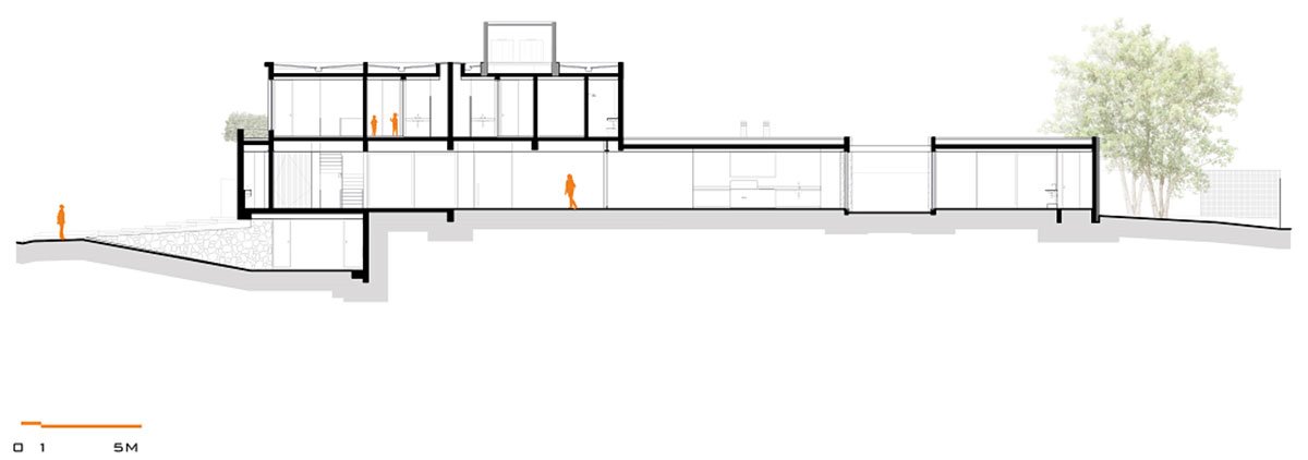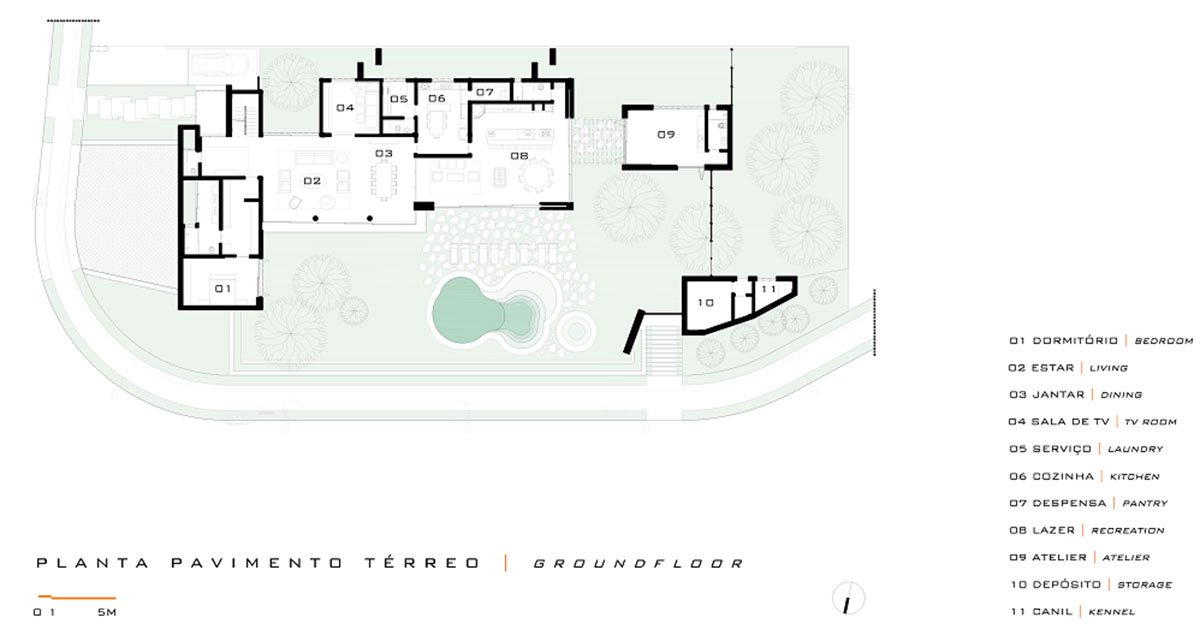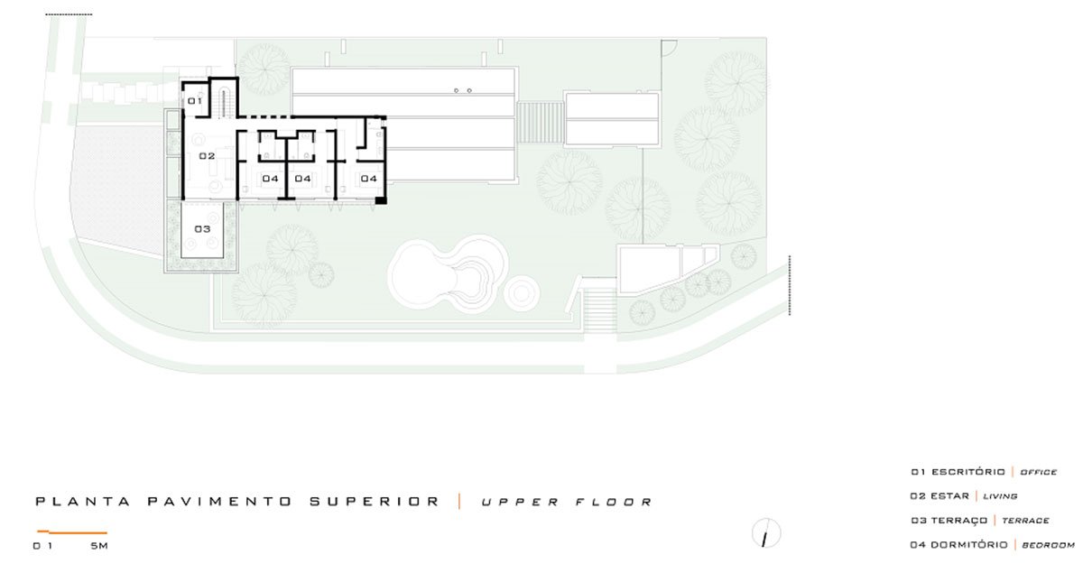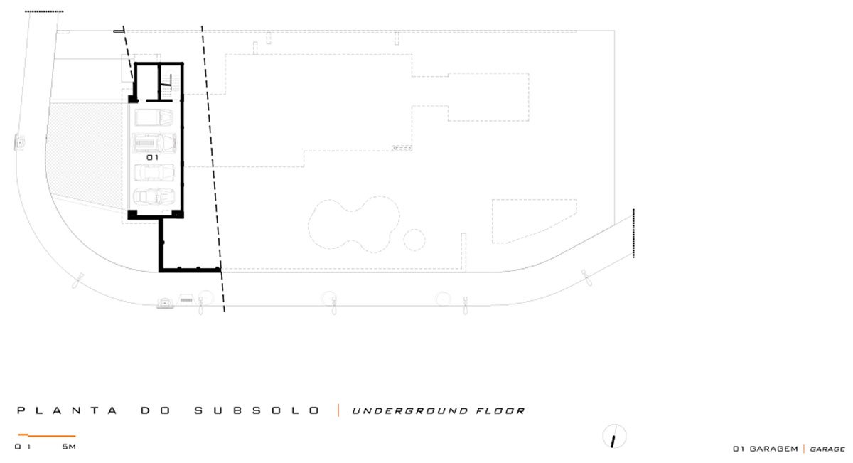 The deployment is made up by distinct and perpendicular volumes, which envisioned the organization of spaces and functions creating two plateaus. In the first, there are the accesses and garage. In the second, all integrated leisure area, in addition to the couple's bedroom, studio, services, vegetable garden and orchard.