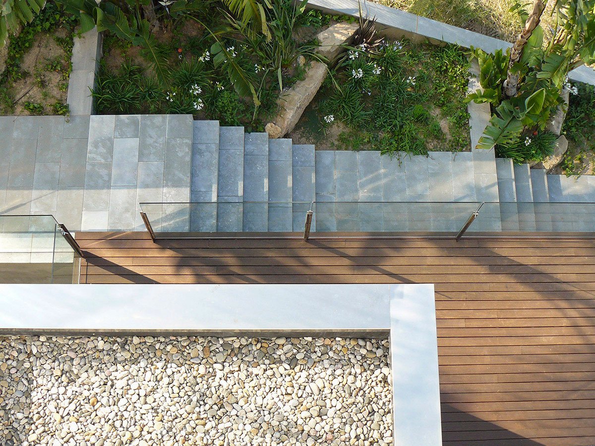 [Text as submitted by the Architects] The plot is located in an urban residential fabric with low density, surrounded by natural areas and close to the sea. Plots shape a big part of the sector with steep slopes. The initial inspection of the site and its surroundings underlined that the most dwellings followed the same premise: to be placed in the highest place of the plot, by an as wide as possible transversal volumetry, letting the rest of the plot be a garden on a slope, in fact with a problematic use and with a bit of relationship with the interior spaces.