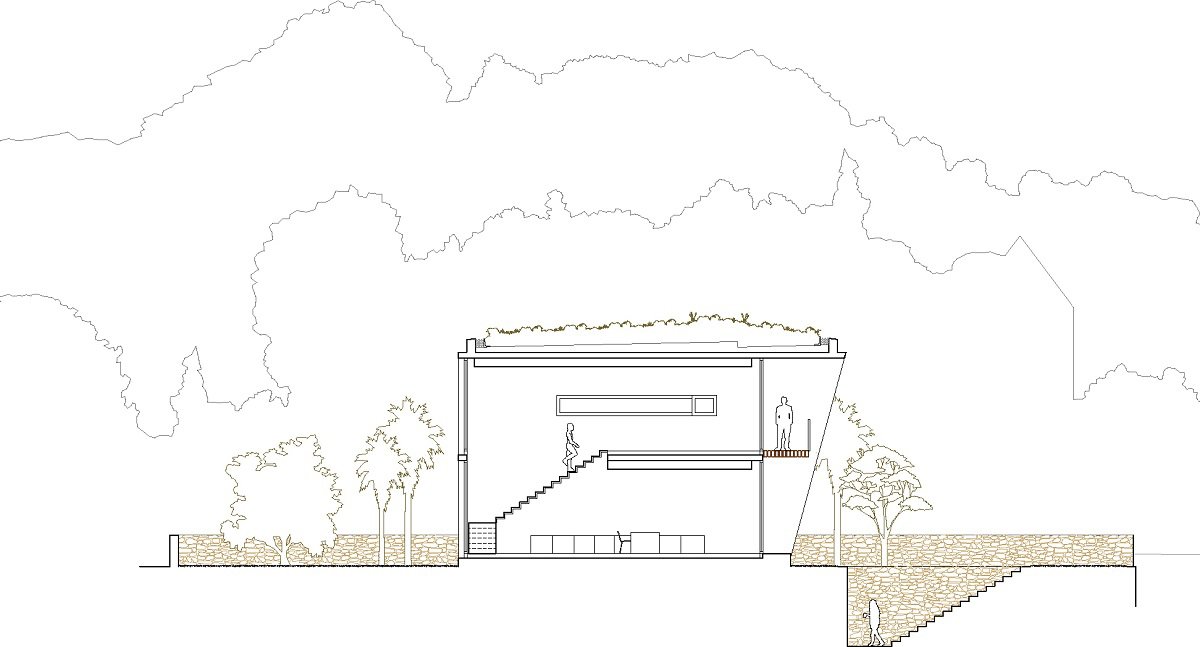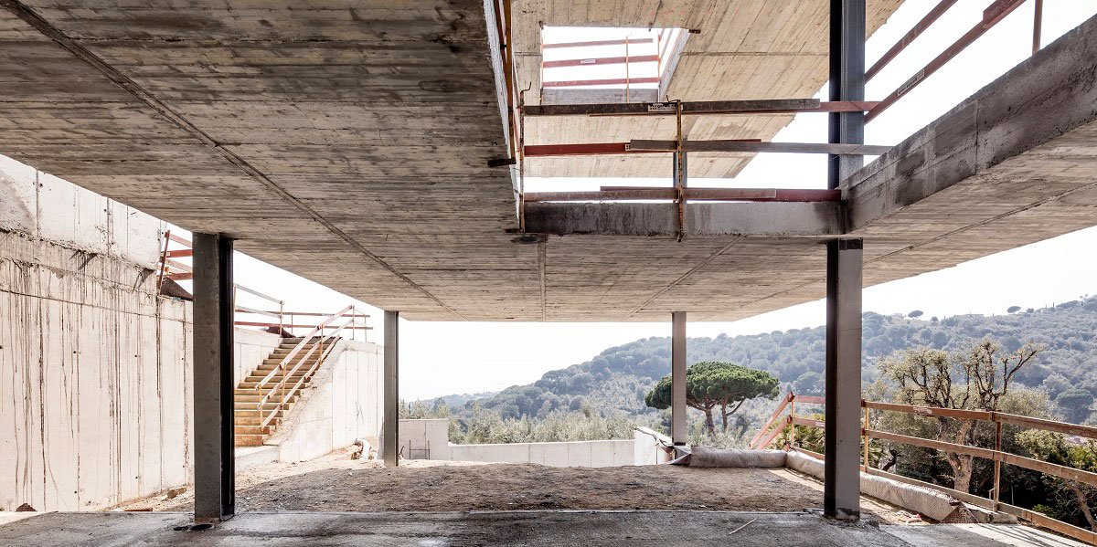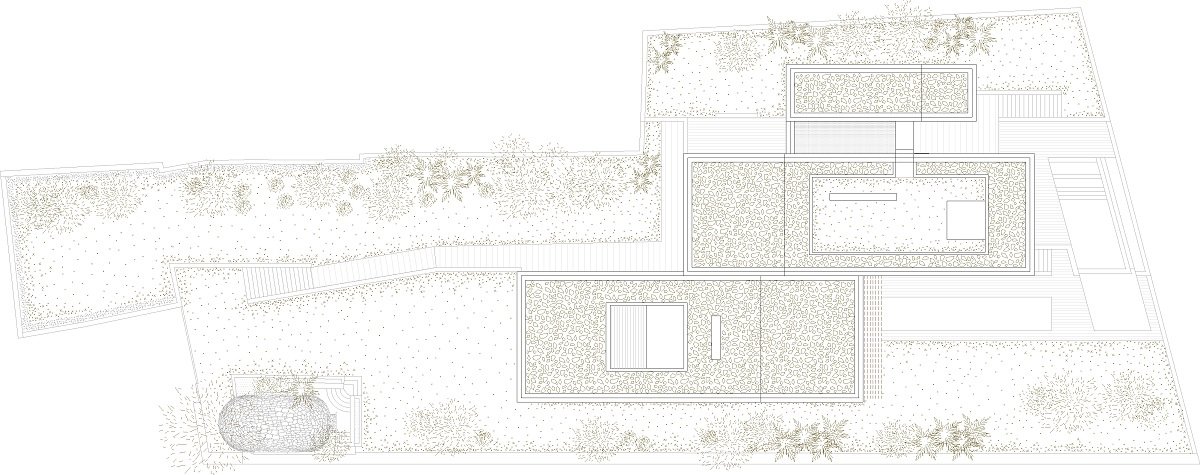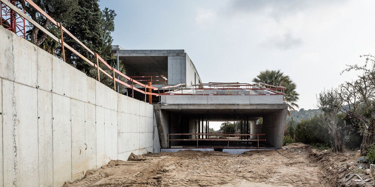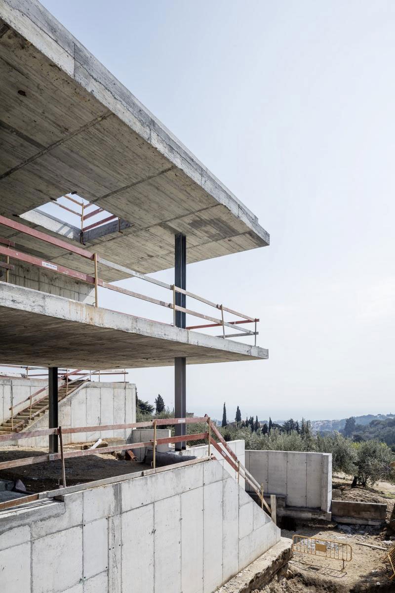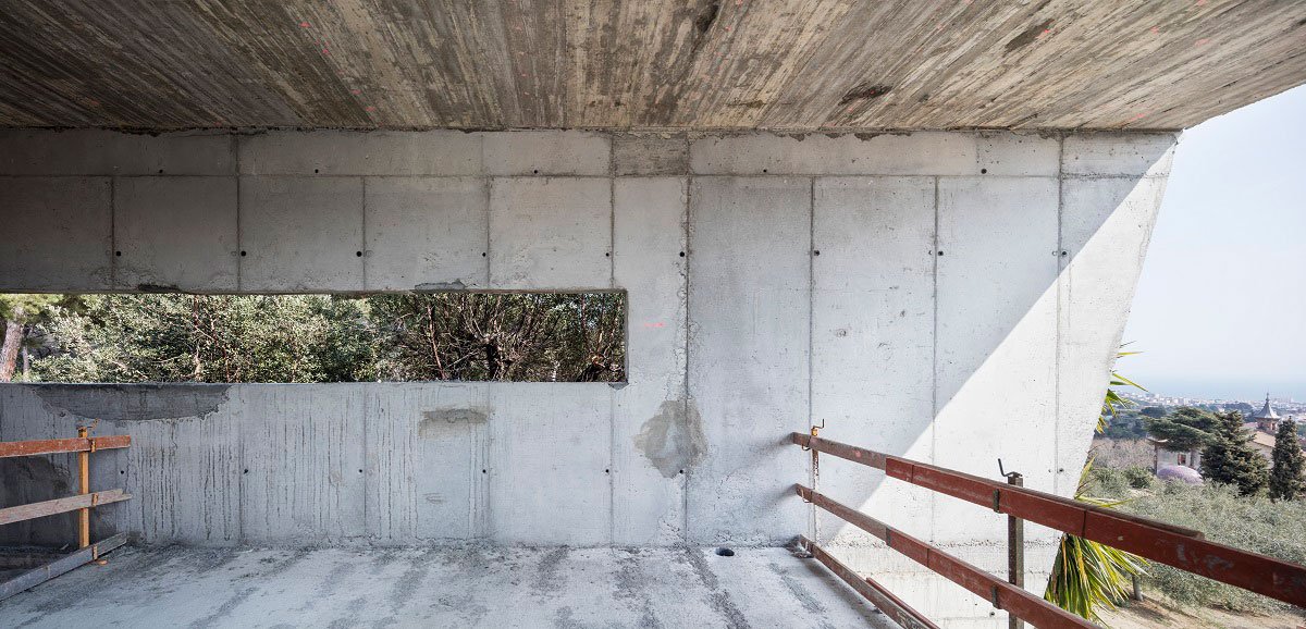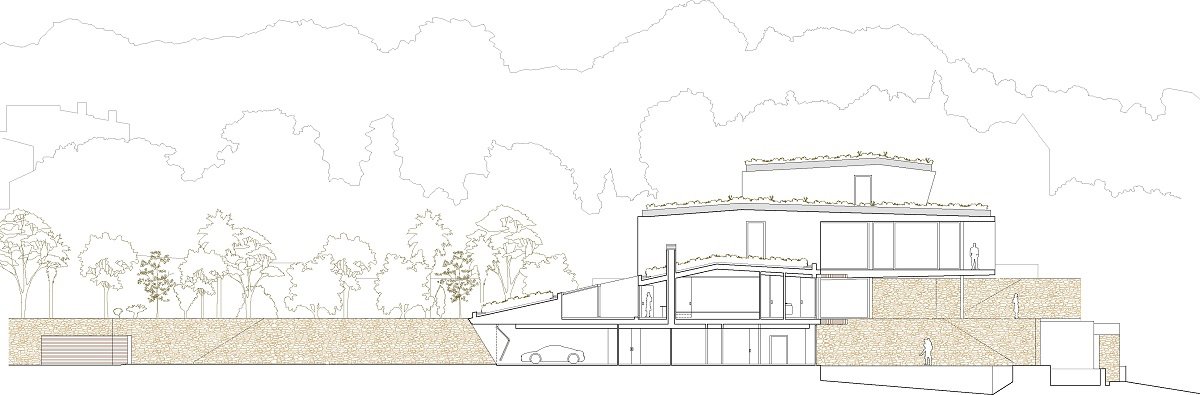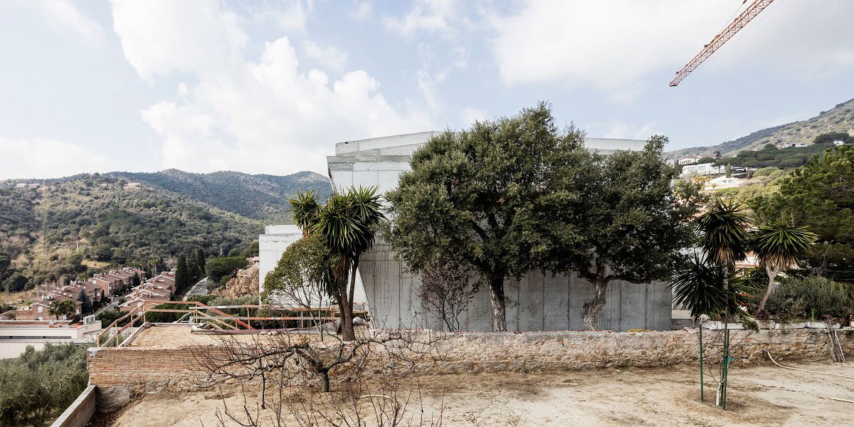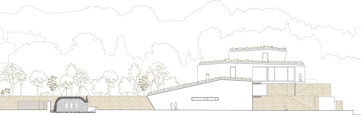 The housing program consists of a living room, dining room, kitchen, rooms, studios, bathrooms, cinema, wellness area, parking for vehicles and spaces for storage, services and facilities; with a constructed surface resulting from 869m2, and therefore, a size more typical of the old stately houses existing in the municipality of Alella than of the houses built in the last half-century. Due to the dimensions of the program, a strategy of implementation and hybrid landscape integration is included which includes two concepts: harmonization and monumentalization. The harmonization in terms of using the same stone in the area with which the chapel is made to finish pre-existing retaining walls, plant new Mediterranean vegetation in line with the existing one and place wood and stone together with elements of water. And the monumentalization to create a monolithic structure of reinforced concrete, punctually supported by steel pillars and lime mortar lined with the will to be a Mediterranean sculpture that emerges from a natural field that maintains its historical roots.