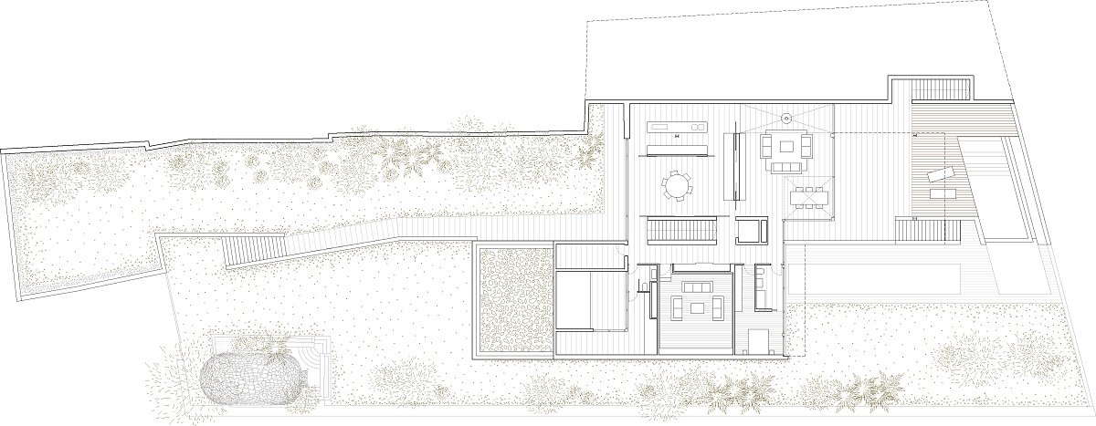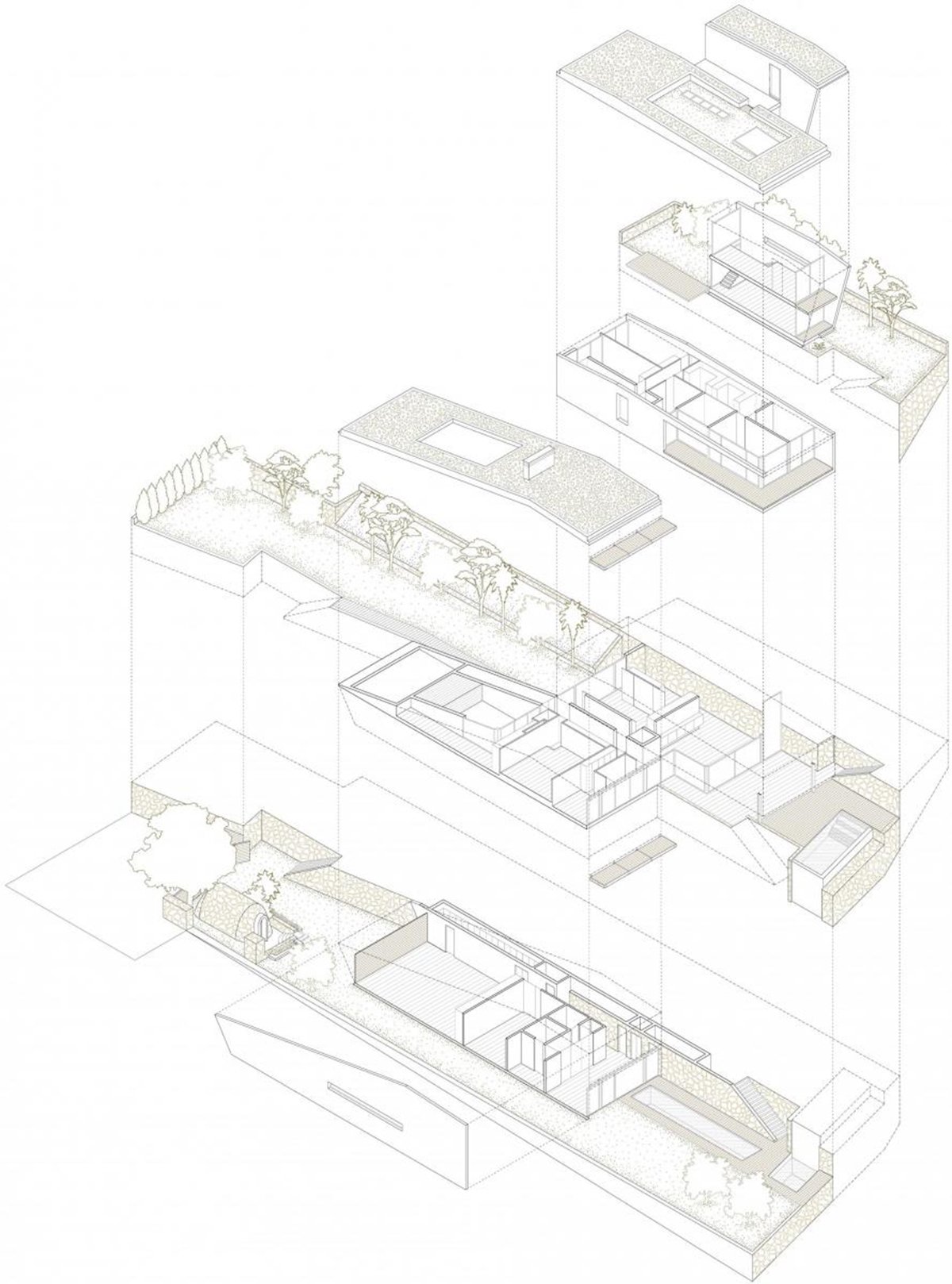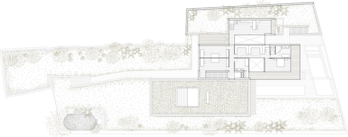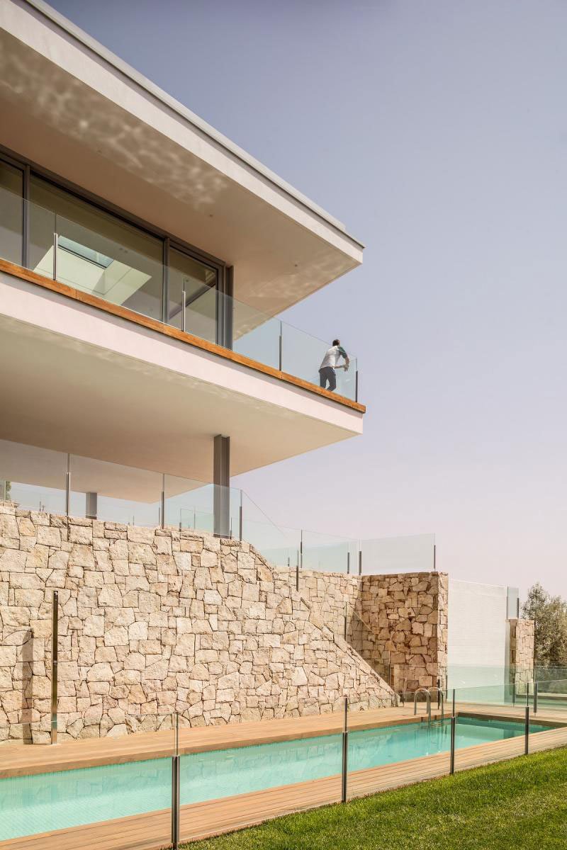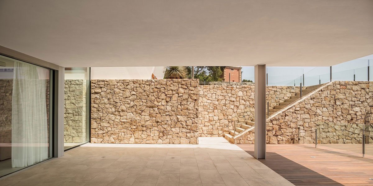When analyzing the program and the size of the housing required, the volumetry is implemented through two floors in each preexisting terrace, concentrating the larger volumetrics on the two lower terraces, so that the terrace most visually exposed has the smaller volumetry. The house is structured in four differentiated levels: 181, 184, 187 and 190. Floor level 181 contains parking, wellness space, and storage areas; floor level 184 contains the day zone; floor level 187 contains the night area and floor level 190 contains a study that connects with a green terrace. Each one of the rooms focuses on the different visuals that the landscape offers: the sea, the valley, the olive fields and the small neighbouring pond. As for the pre-existing stonewalls, once rehabilitated and covered with dry stone from the area, they go through the house coinciding with the most relevant spaces. The covers are landscaped with varying degrees of inclination, with the intention of visually collecting the landscape, pretending to be part of it and also pretending that from a bird’s sight the presence of the house is not perceived, but rather a completely naturalized terrain.