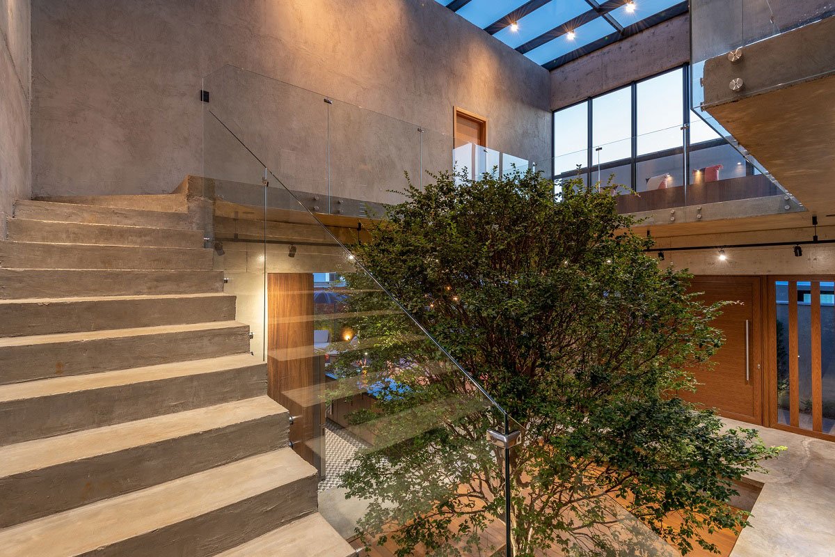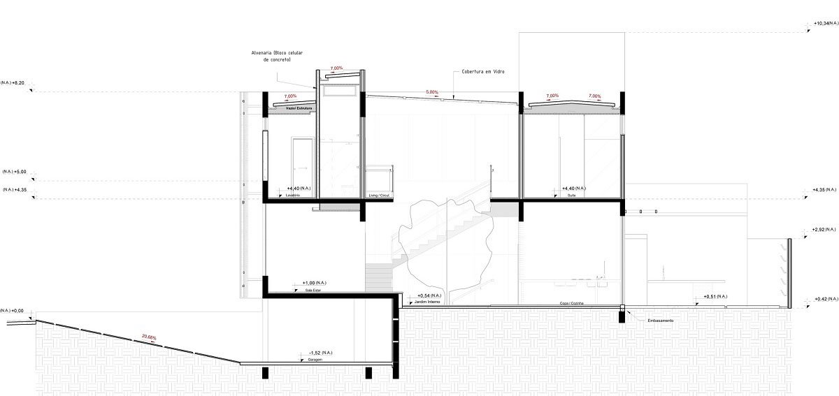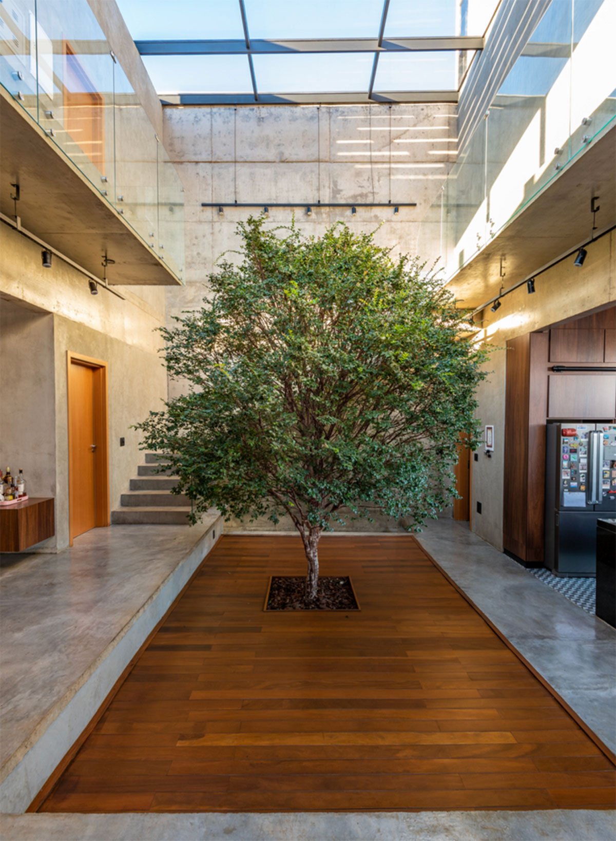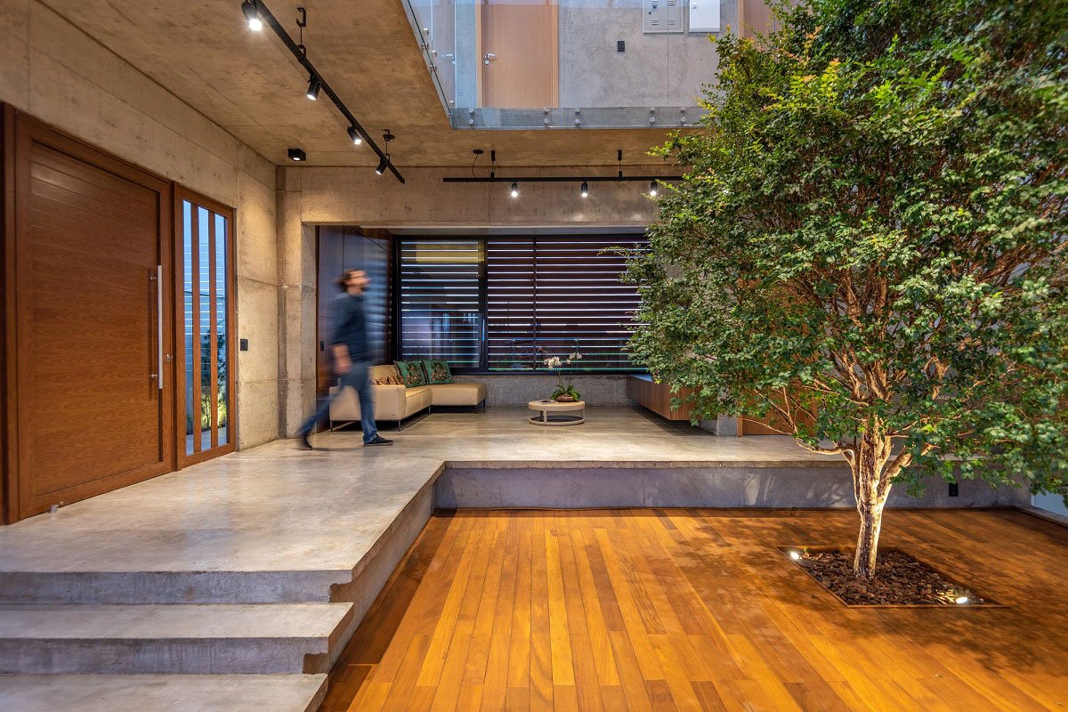 The visual effect caused by the fruitful tree can be observed from all the angles of the residence: a result achieved by the act of circulating between the connected floors from a same perspective (spiral), which allows the access from the garage to the master suite, avoiding opening doors and passing through environments.