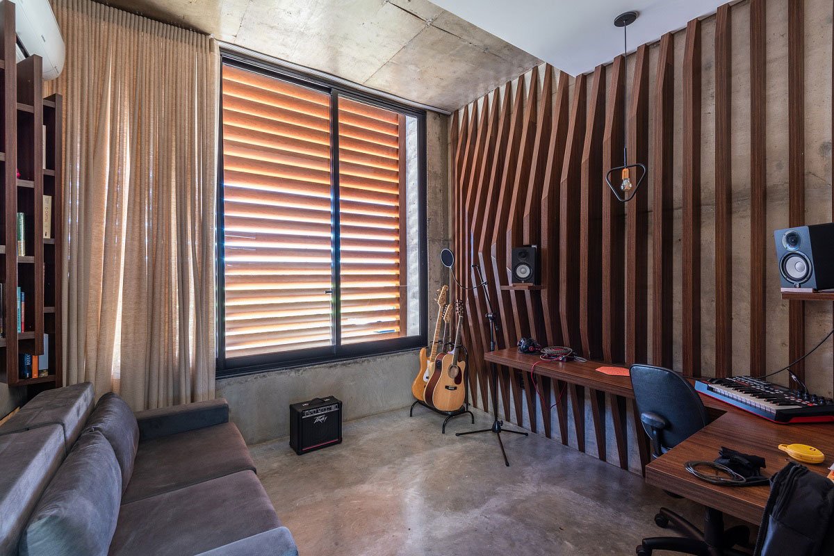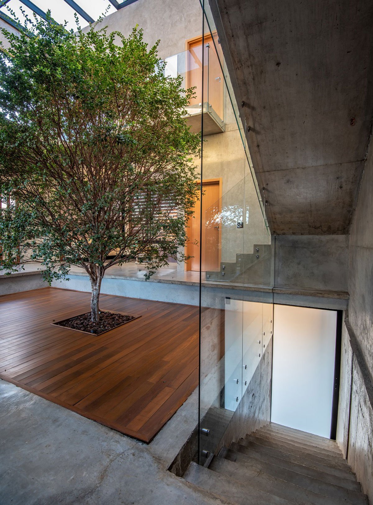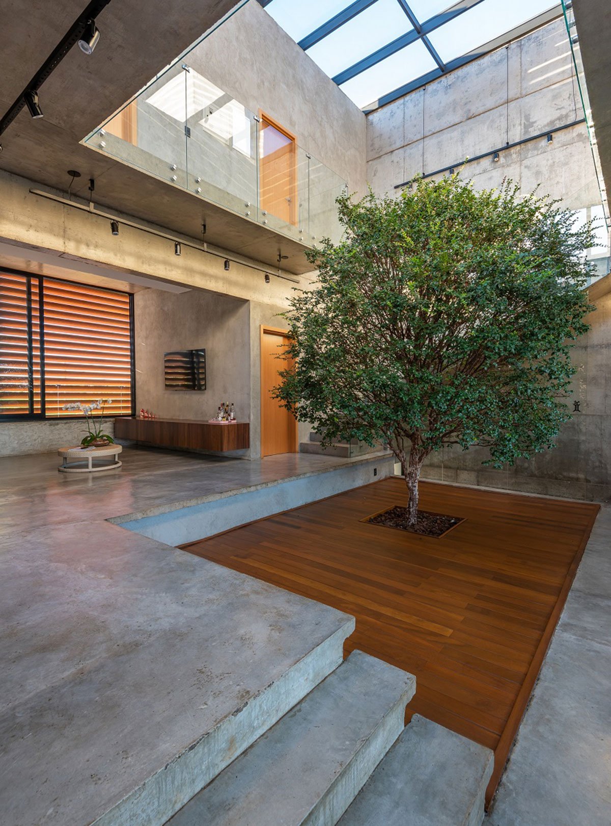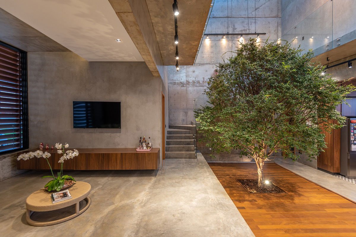 On its materiality, the project has strengthened the game of the contrast between the concrete and the elements made of cumaru wood. The union of these materials gives the effect of comfort, easing the residents’ agronomy. Another important thing about the Box House is the internal and external landscaping element that has always shown the residence’s will of being alive. For this, inside the cube was insert a Jabuticaba tree, adapted to be grown in interiors.