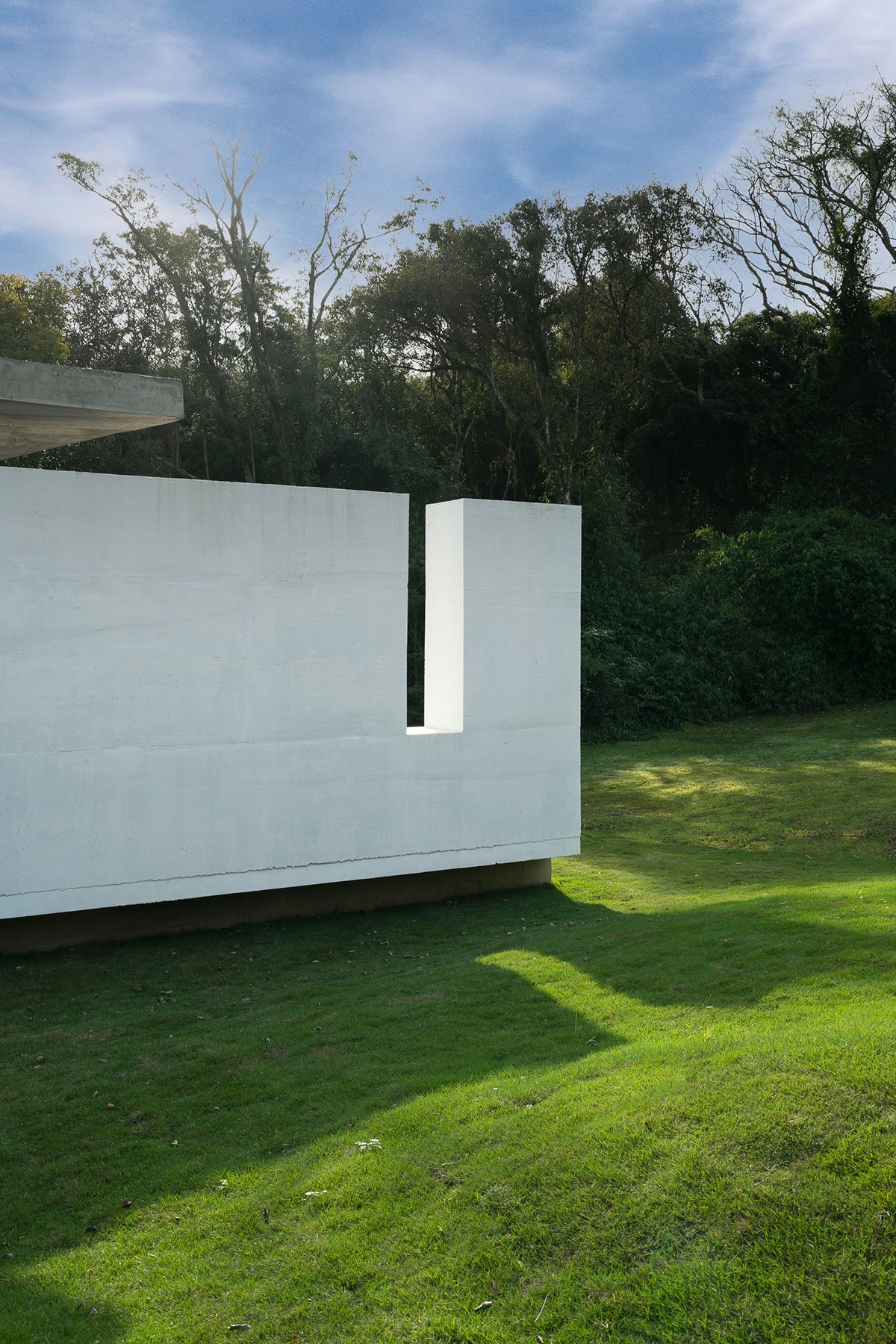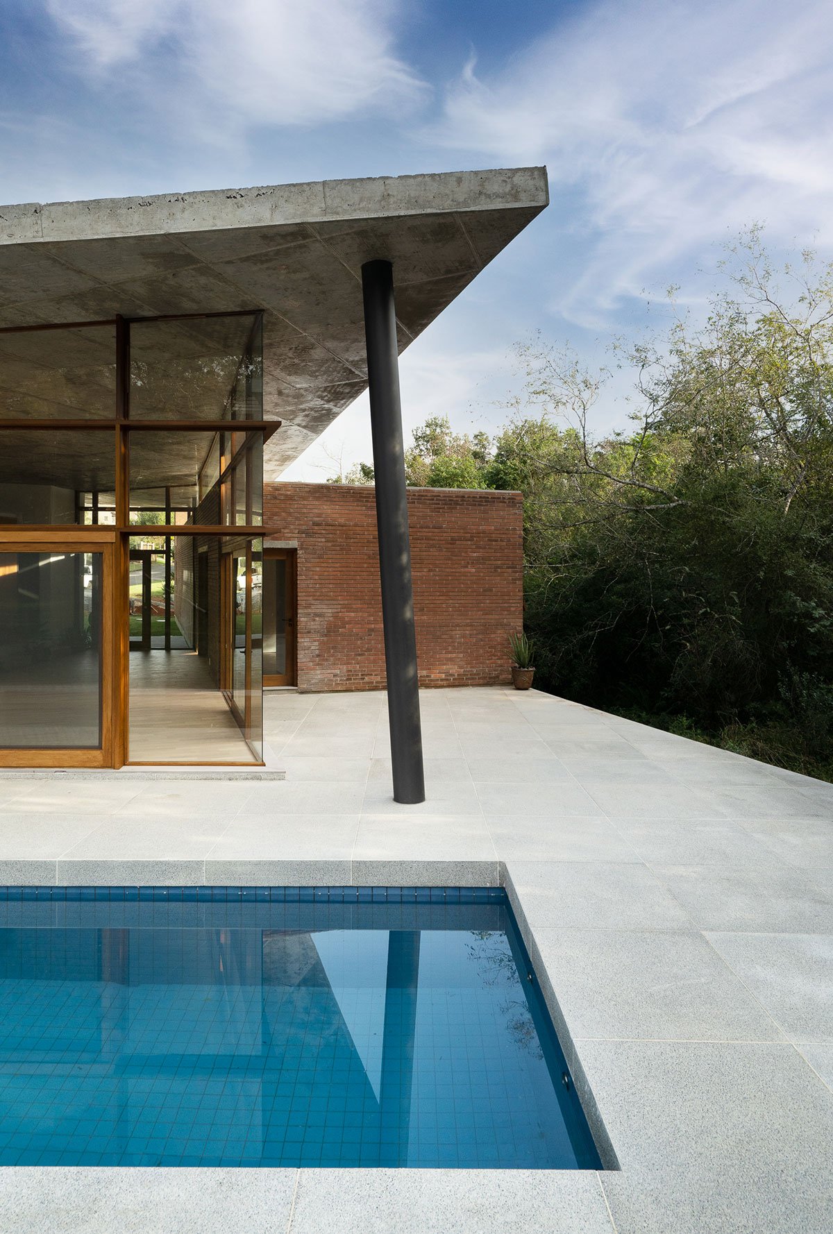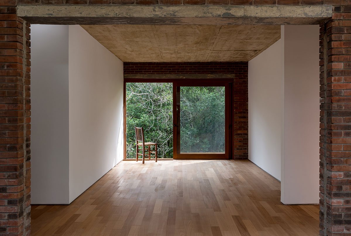 The volume that houses the intimate areas of the house is solid, almost completely opaque, opening only to the forest and ceiling, it is made of exposed ceramic bricks and is extruded to accommodate a water reservoir and laundry. The kitchen volume is decomposed into three volumes: one that articulates the access vestibule and the lavatory, another that is the facade of the building and organizes all the functions of the kitchen; and a third – containing the fireplace and barbecue – defines the spatial boundary between kitchen and living. Over the living and kitchen volumes, the roof is a flat slab of exposed concrete in a trapezoidal shape. A diagonal fold enhances structural rigidity and allows rainwater drainage; the edges of the trapezoid are lifted to different levels, raising the ceiling height of the social area for a greater incidence of light, and lowering it in the kitchen to provide coziness.
