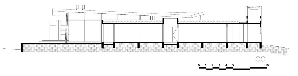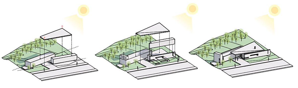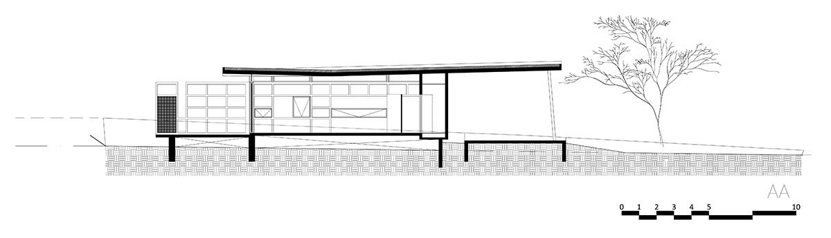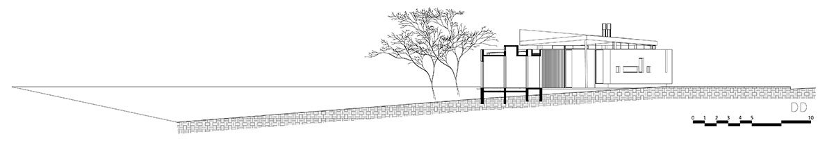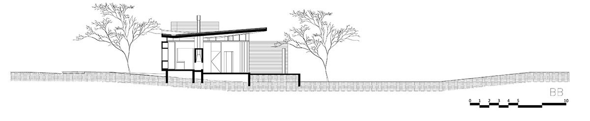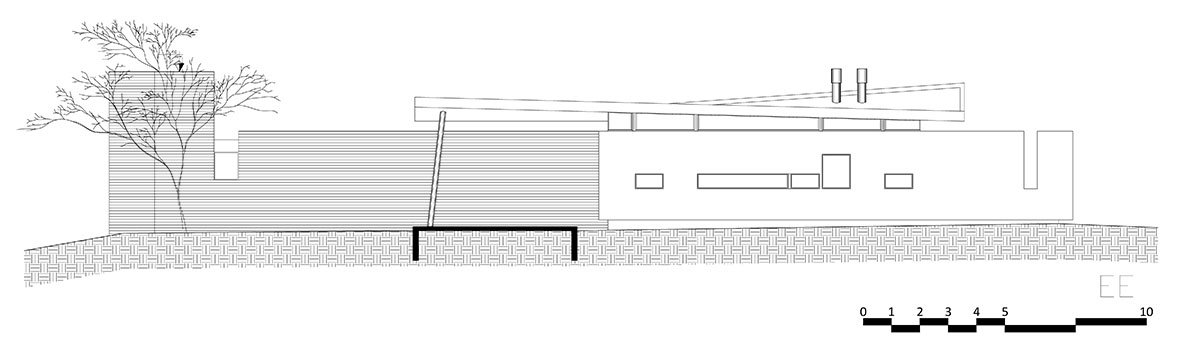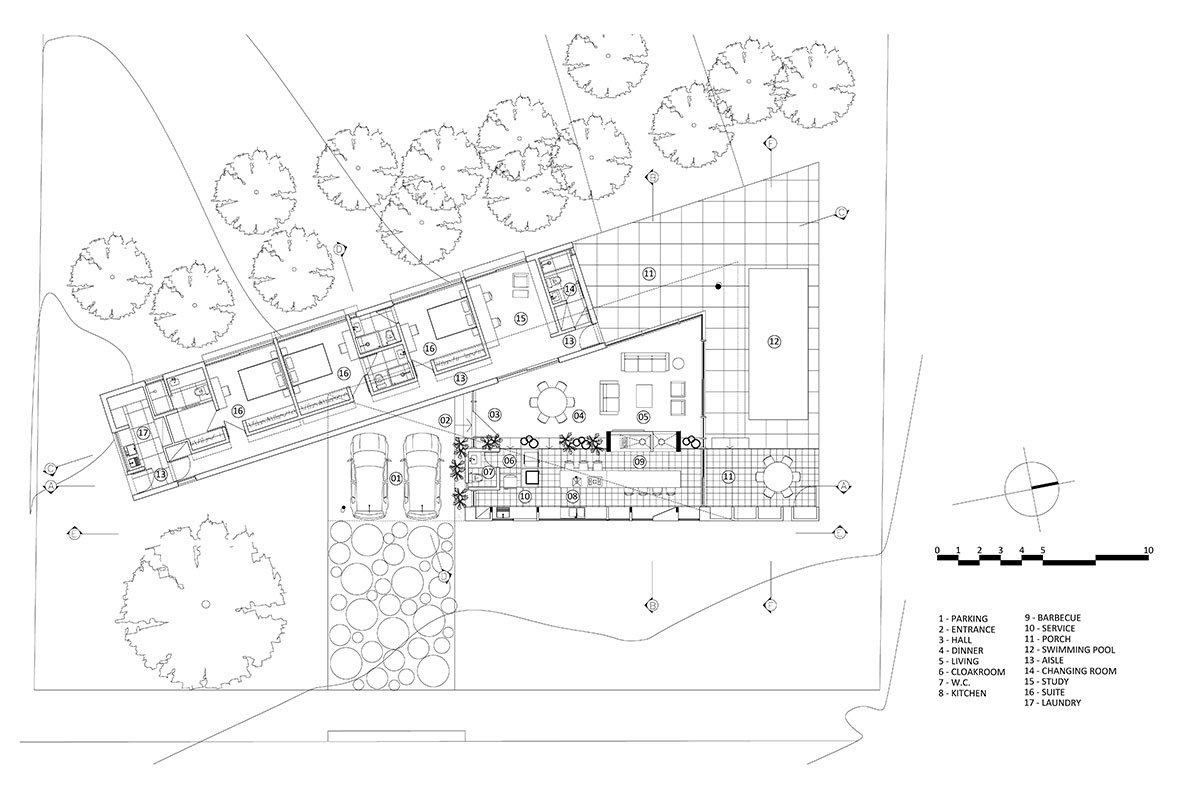 The volume that houses the intimate areas of the house is solid, almost completely opaque, opening only to the forest and ceiling, it is made of exposed ceramic bricks and is extruded to accommodate a water reservoir and laundry. The kitchen volume is decomposed into three volumes: one that articulates the access vestibule and the lavatory, another that is the facade of the building and organizes all the functions of the kitchen; and a third – containing the fireplace and barbecue – defines the spatial boundary between kitchen and living. Over the living and kitchen volumes, the roof is a flat slab of exposed concrete in a trapezoidal shape. A diagonal fold enhances structural rigidity and allows rainwater drainage; the edges of the trapezoid are lifted to different levels, raising the ceiling height of the social area for a greater incidence of light, and lowering it in the kitchen to provide coziness.