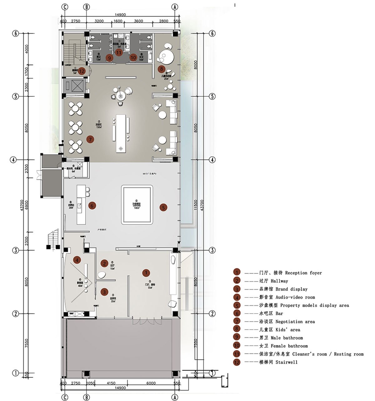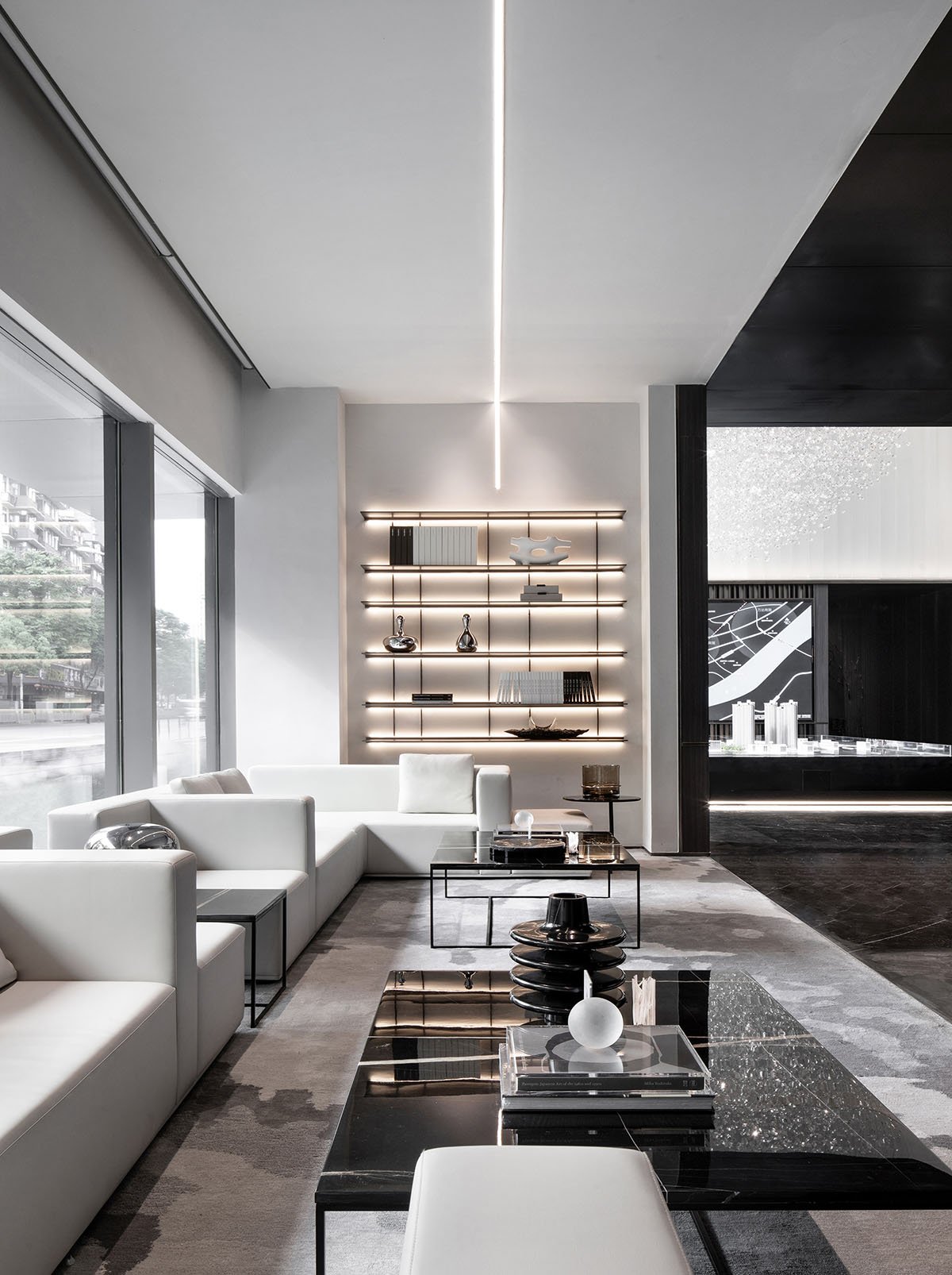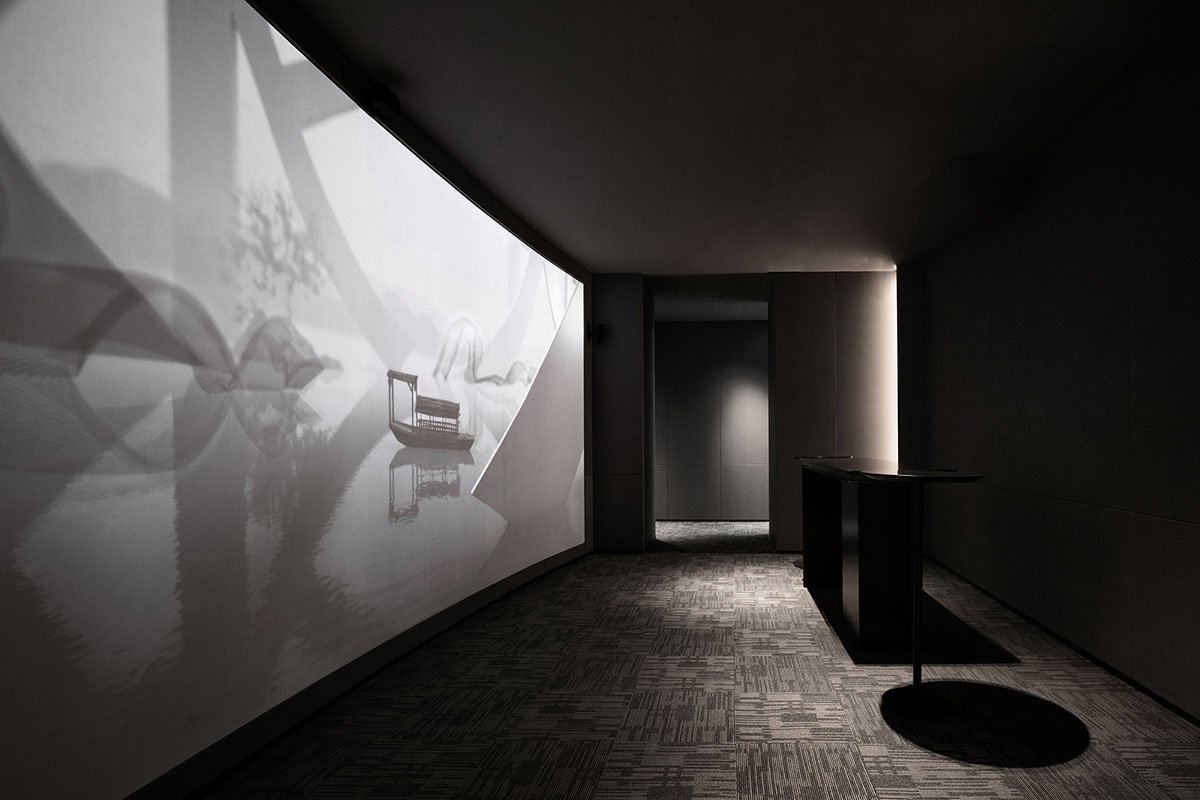The overall design of the sales center is based on black and white tones, and conceives a contemporary context to present the local mountain and water landscape. Black, white and grey hues dialogue with material textures, and the large area of geometric imagery and touching details create distinctive aesthetic scenes in different functional areas. The spatial layout combines solidness and void, the real and virtual, and the rhythmic circulation route enhances spatial experiences.