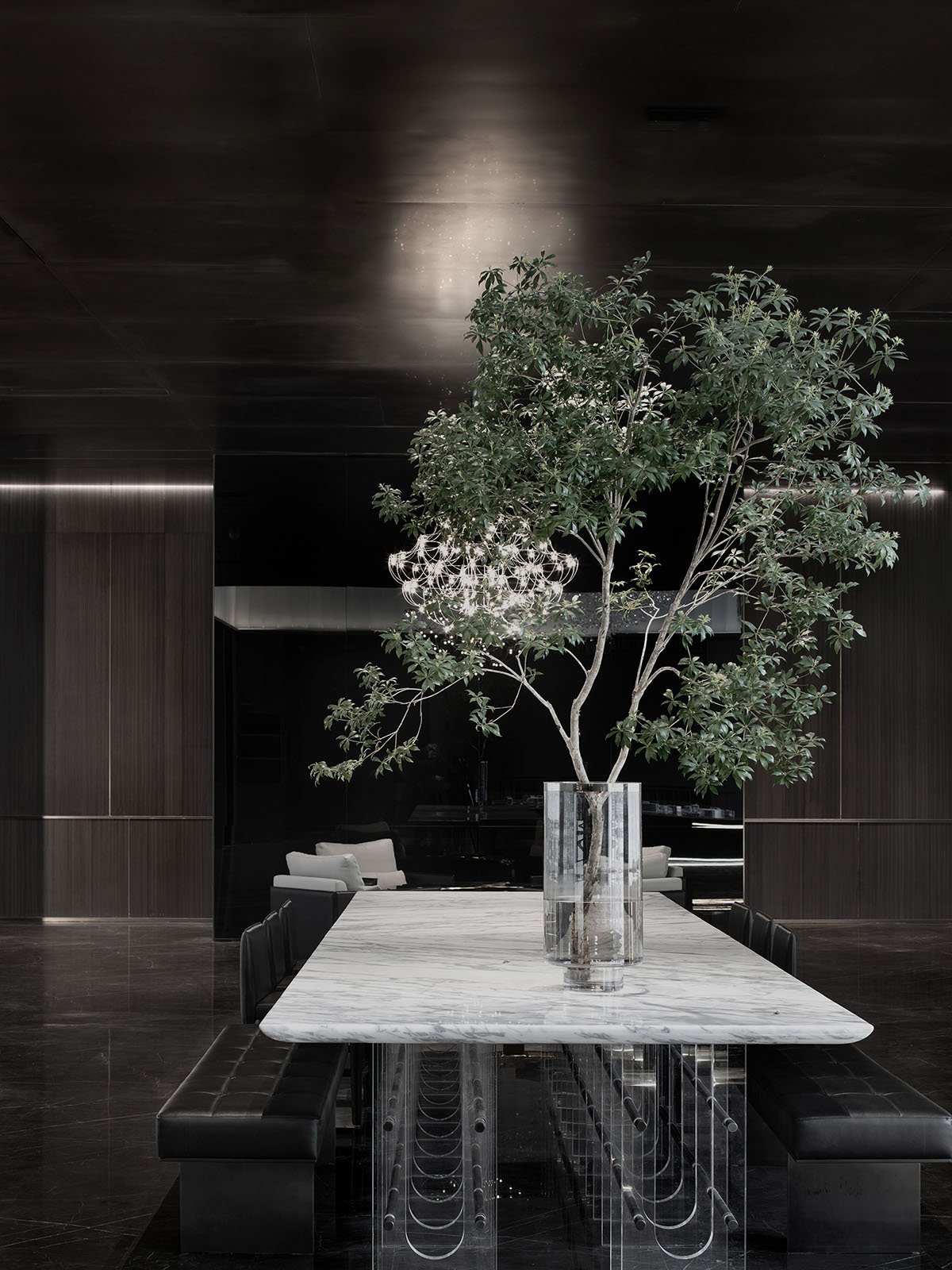 The negotiation area is organized with a dark central axis and two light-colored zones on its sides, visually extending the geometric structures of the space. The combination of dark titanium ceiling and grey marble flooring visually generates a symmetrical aesthetic on the central axis. A long, light-colored marble table is set at the center, producing a harmonious aesthetic, as time seems to stop here. The fresh green plant on the table adds an elegant touch to the black and white space. The black mirror attached to the background wall beside the independent sofa reflects the space, enhancing the visual depth. In contrast, the light-colored negotiation sections on both sides are spacious and bright, helping enhance dramatic tension of the space.