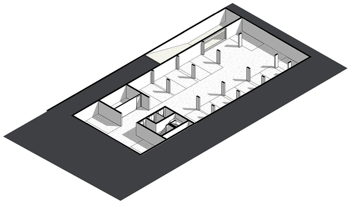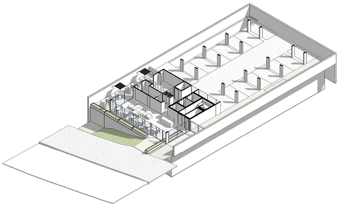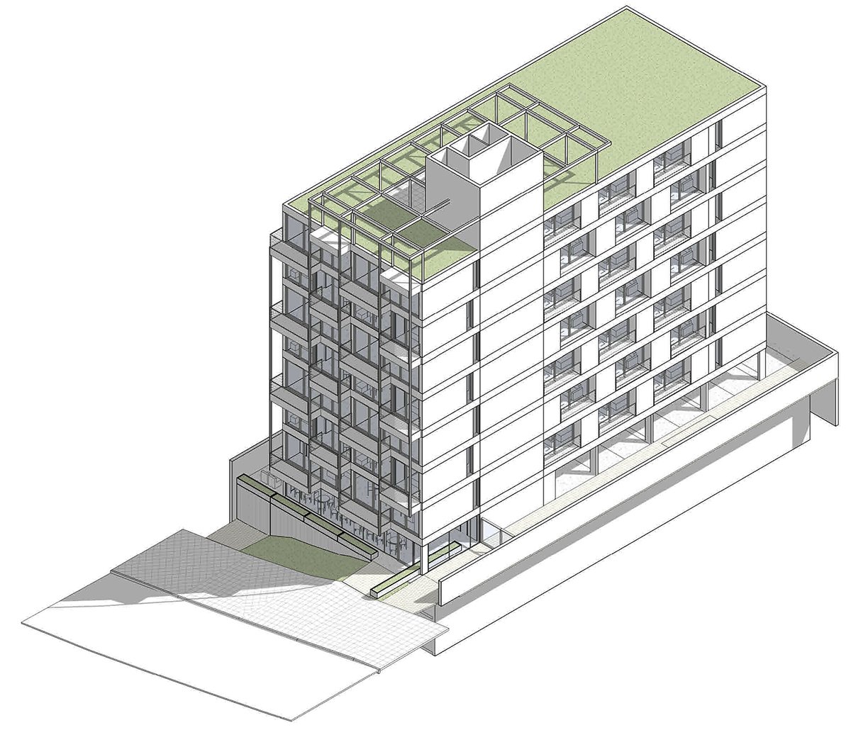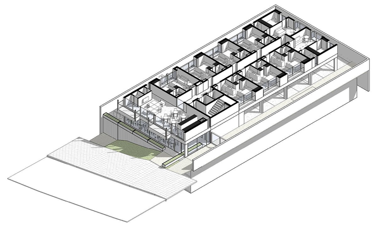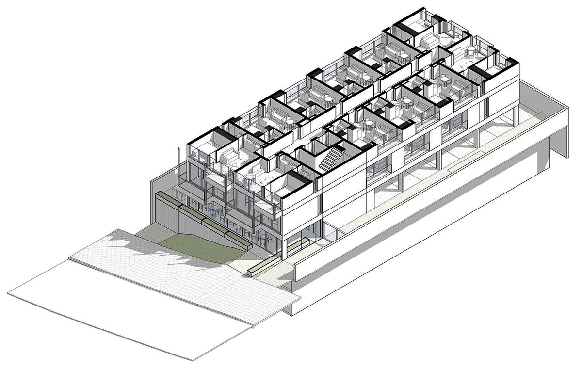 The building is situated on a common-use base, which includes shared services for users such as work areas, vending machines, laundry facilities, a gym, and parking spaces. Within the tower, there are loft units with either enclosed or integrated bedrooms. All apartments feature balconies with alternating openings on different floors, adding dynamism to the regular volume.