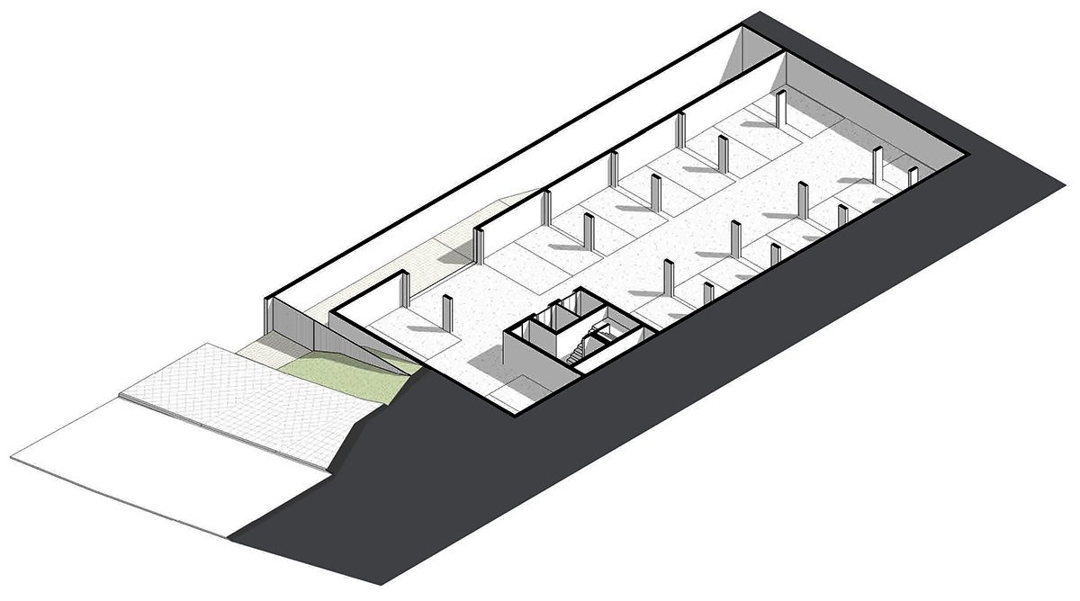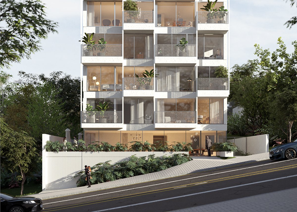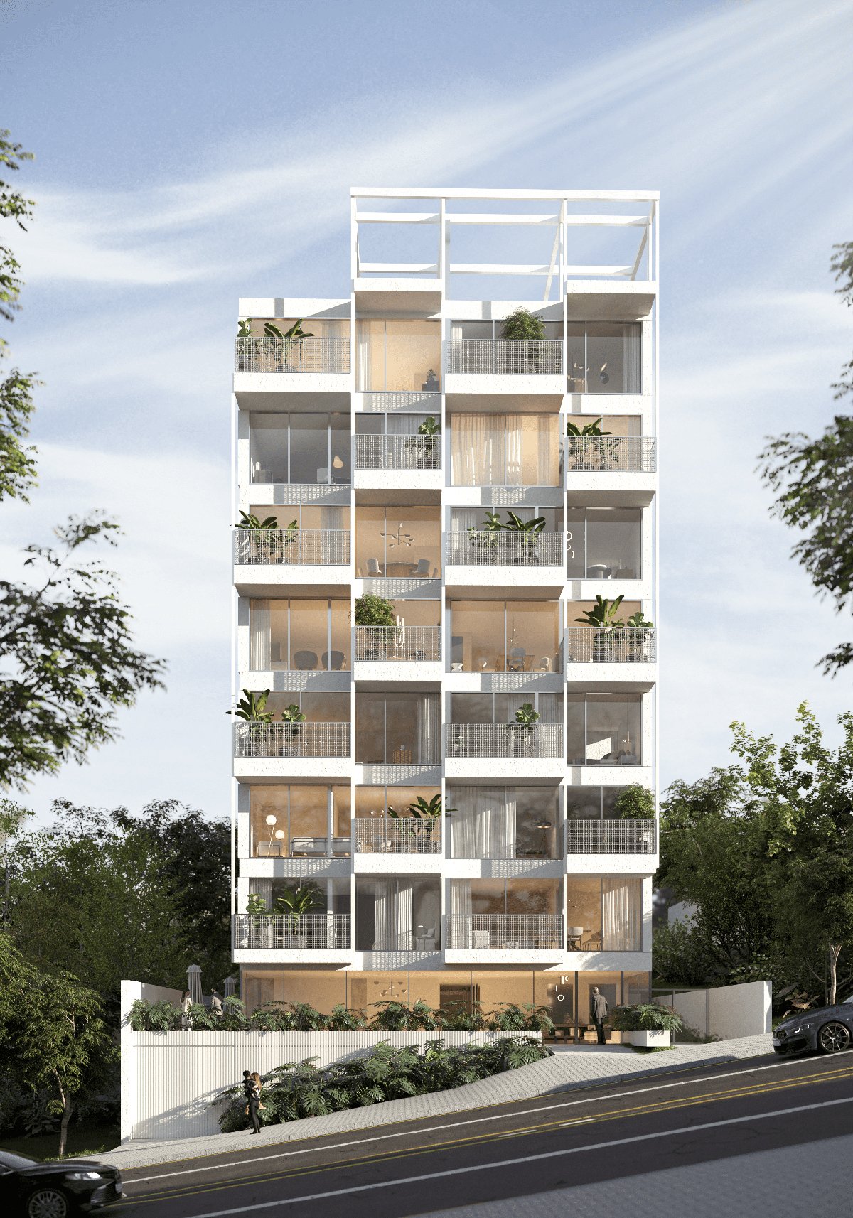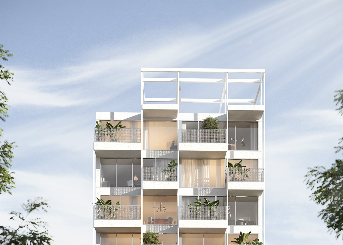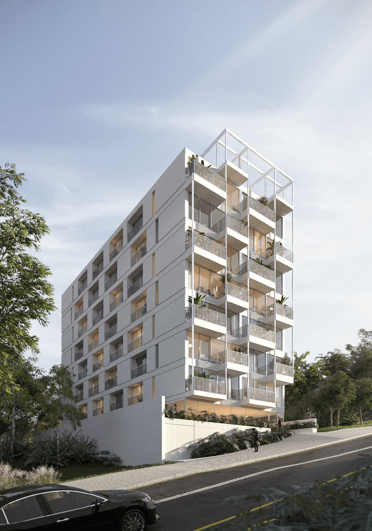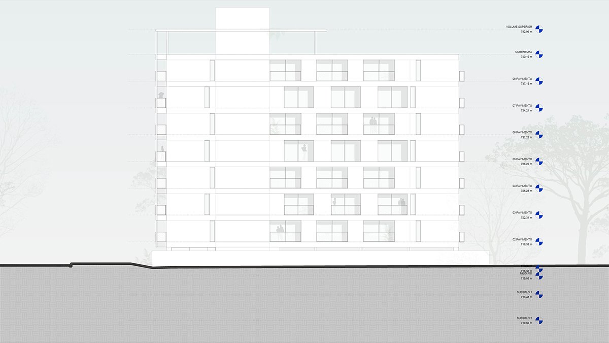 On the lateral façades, the balconies create recesses in the overall structure, while on the front façade, they extend beyond the glass plane. The projected slabs align with the frontal property line and are ultimately supported by tension rods that connect to the rooftop, completing the design.