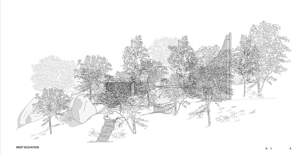 [Text as submitted by the Architects] “This knoll features several monumental boulders, spaced apart, and a good stand of trees around them, with tall trunks and dense foliage. In the midst of the knoll, was a faint clearing; and this place presented itself as a `natural, `logical’, and `inevitable’ location or locus for the Chapel. In the event, only two trees were lost, and all boulders retained. The positioning of the Chapel implied itself in the voids and the interstices, as an in-between place: architecture as a clearing within a clearing.”