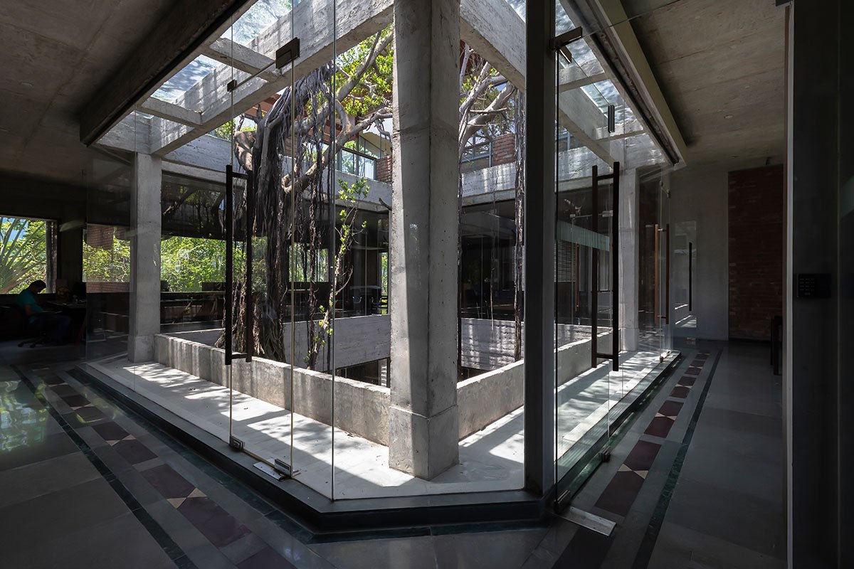 Nature as Centerpiece: Central to the design is the once-hidden courtyard now revitalized. The Pakur tree stands regally in a sculptural way, a wisdom keeper, surrounded by seating that encourages contemplation beneath its verdant canopy. Frame less glass panels dance around the courtyard, visually merging the interior and exterior, intertwining human spaces with nature’s embrace.